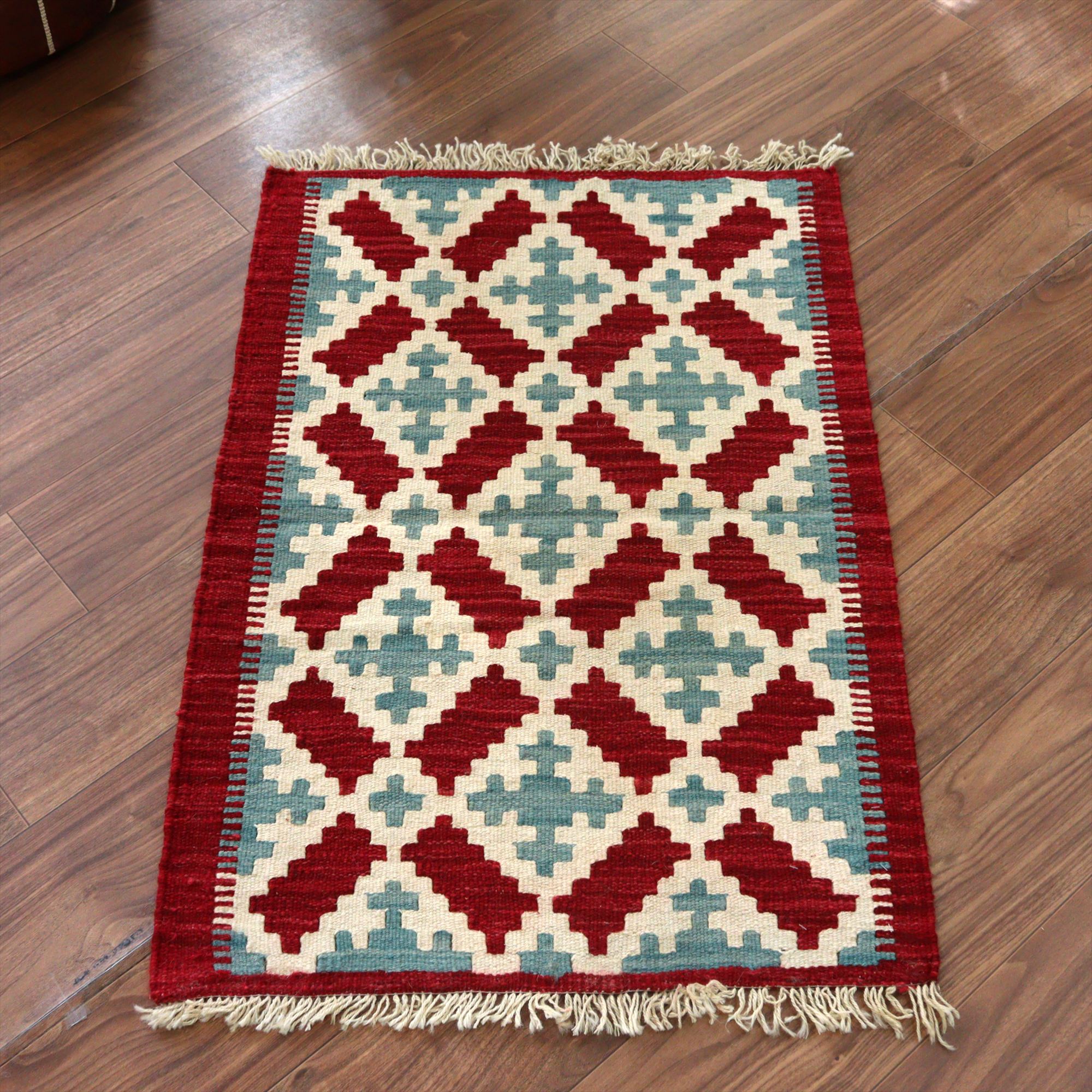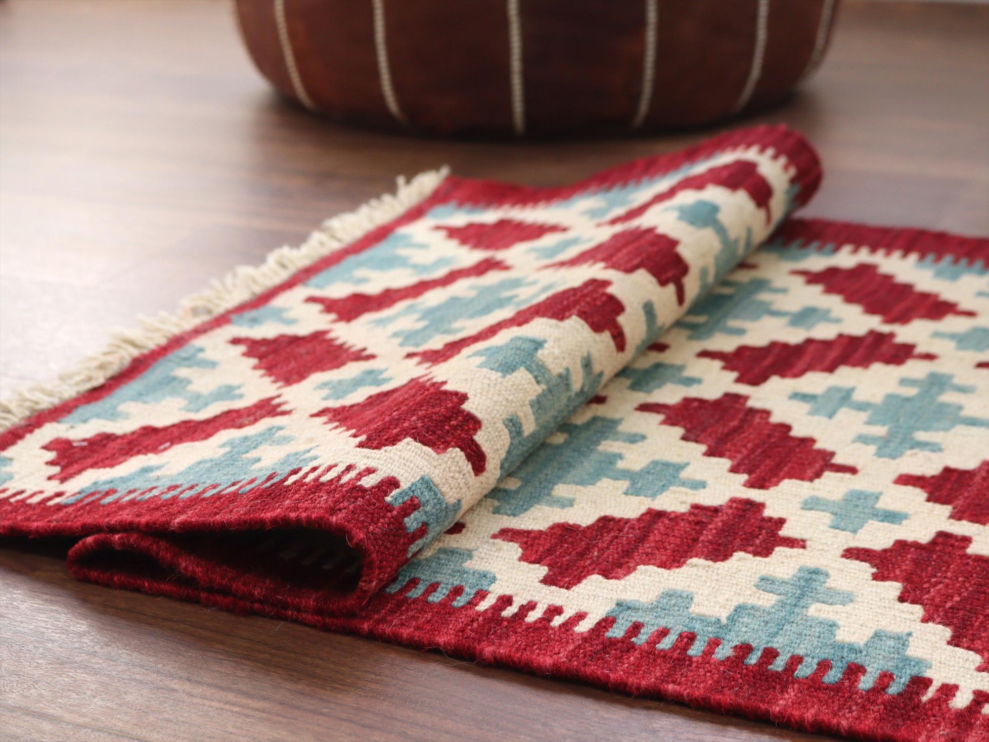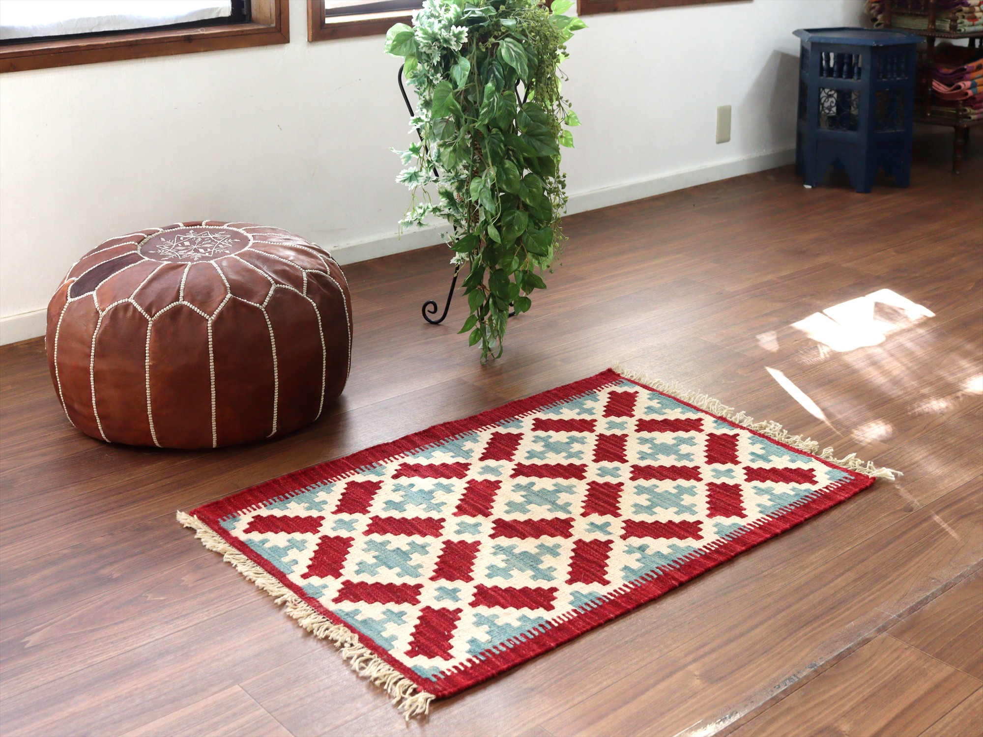 - 手織りキリム イラン シラーズ93×64cm カラフルな幾何学モチーフ