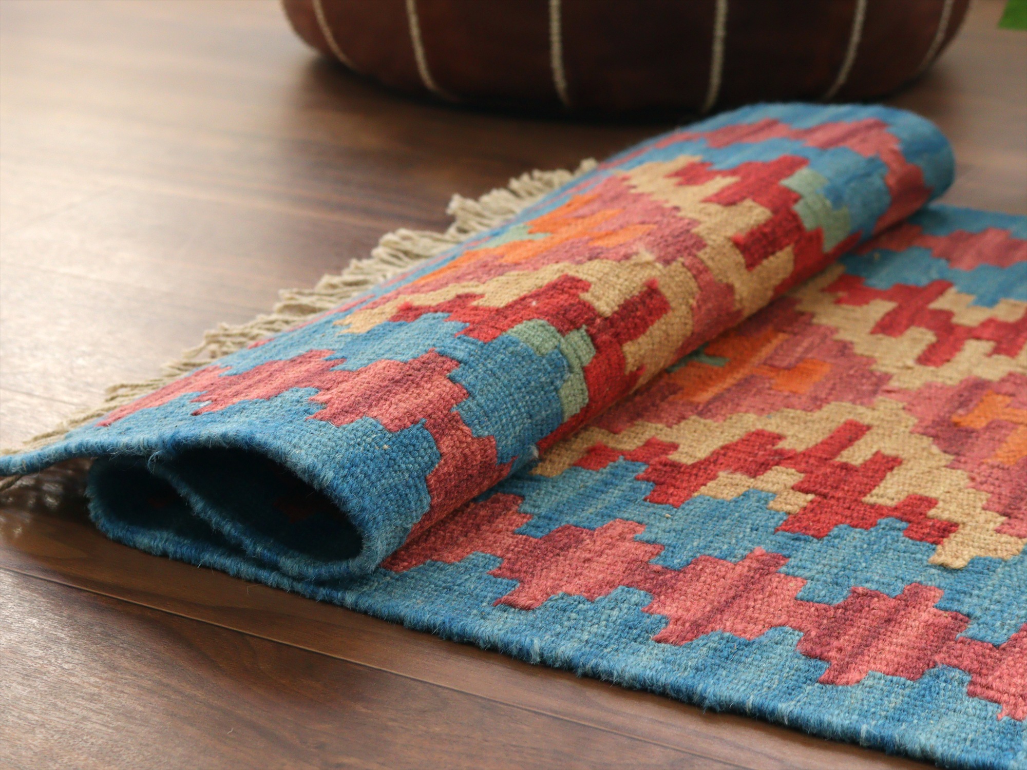 6-7mm程度の厚みがあり、パイル(毛足)がない平織りの敷物で表面は少しザラっとした肌ざわりです。織り手の自由なアイデアでデザインされていますので、左右対象でなかったり、モチーフが少しずれていたりということもありますが、世界で一枚だけの作品ですからその点はご了承ください。