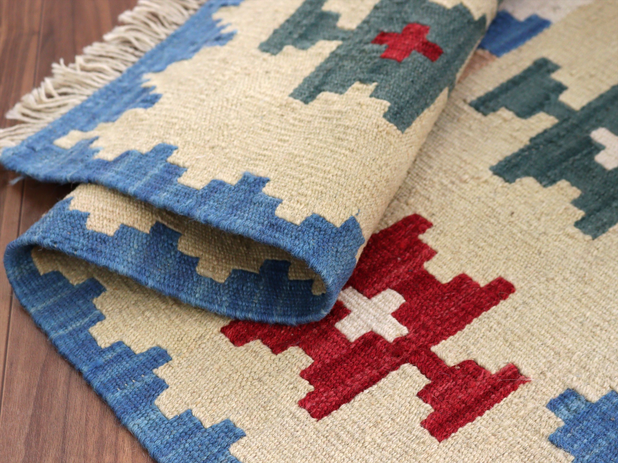- 手織りキリム イラン シラーズ89×58cm カラフルな幾何学モチーフ