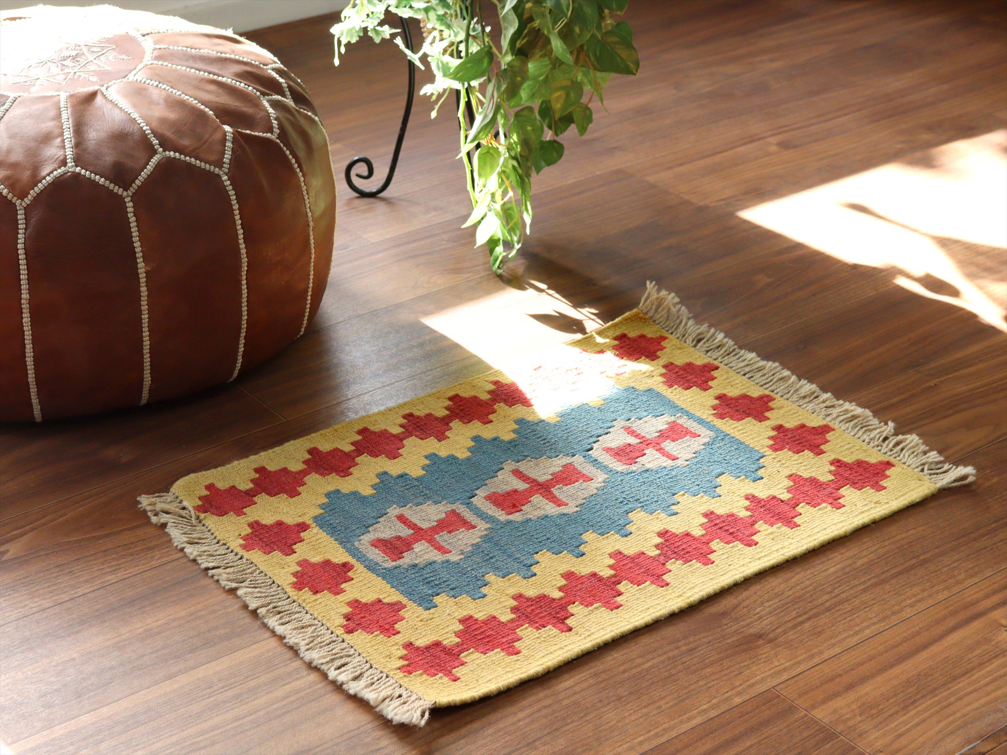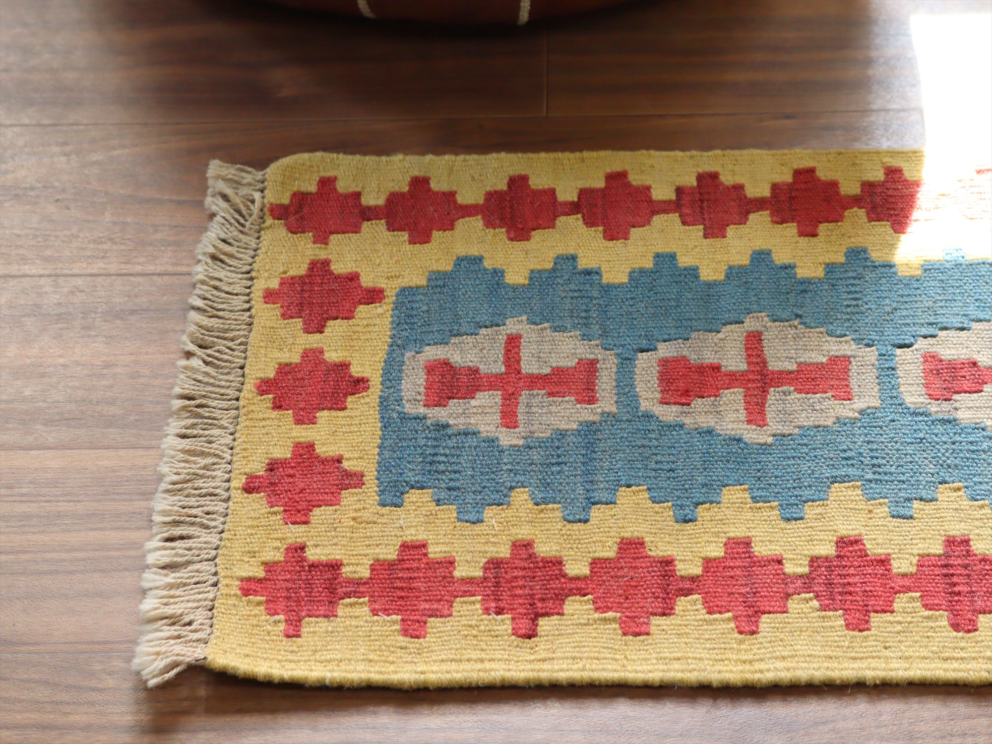 しっかりとしたハリのある織りで、厚みは4mm前後。多少カタチがゆがみがありますが、手織りキリムならではの味わいとご理解ください。