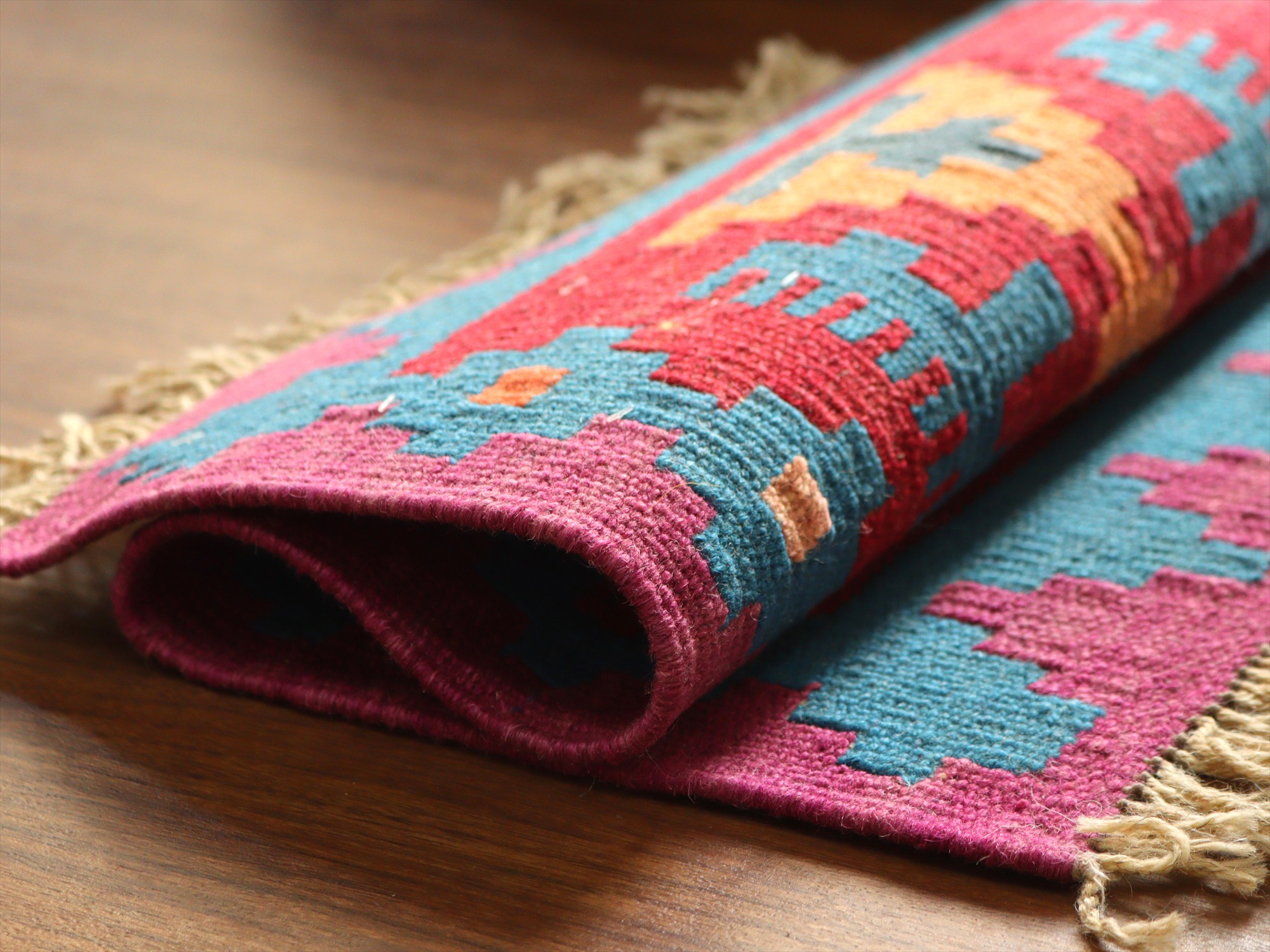 しっかりとしたハリのある織りで、厚みは4mm前後。多少カタチがゆがみがありますが、手織りキリムならではの味わいとご理解ください。