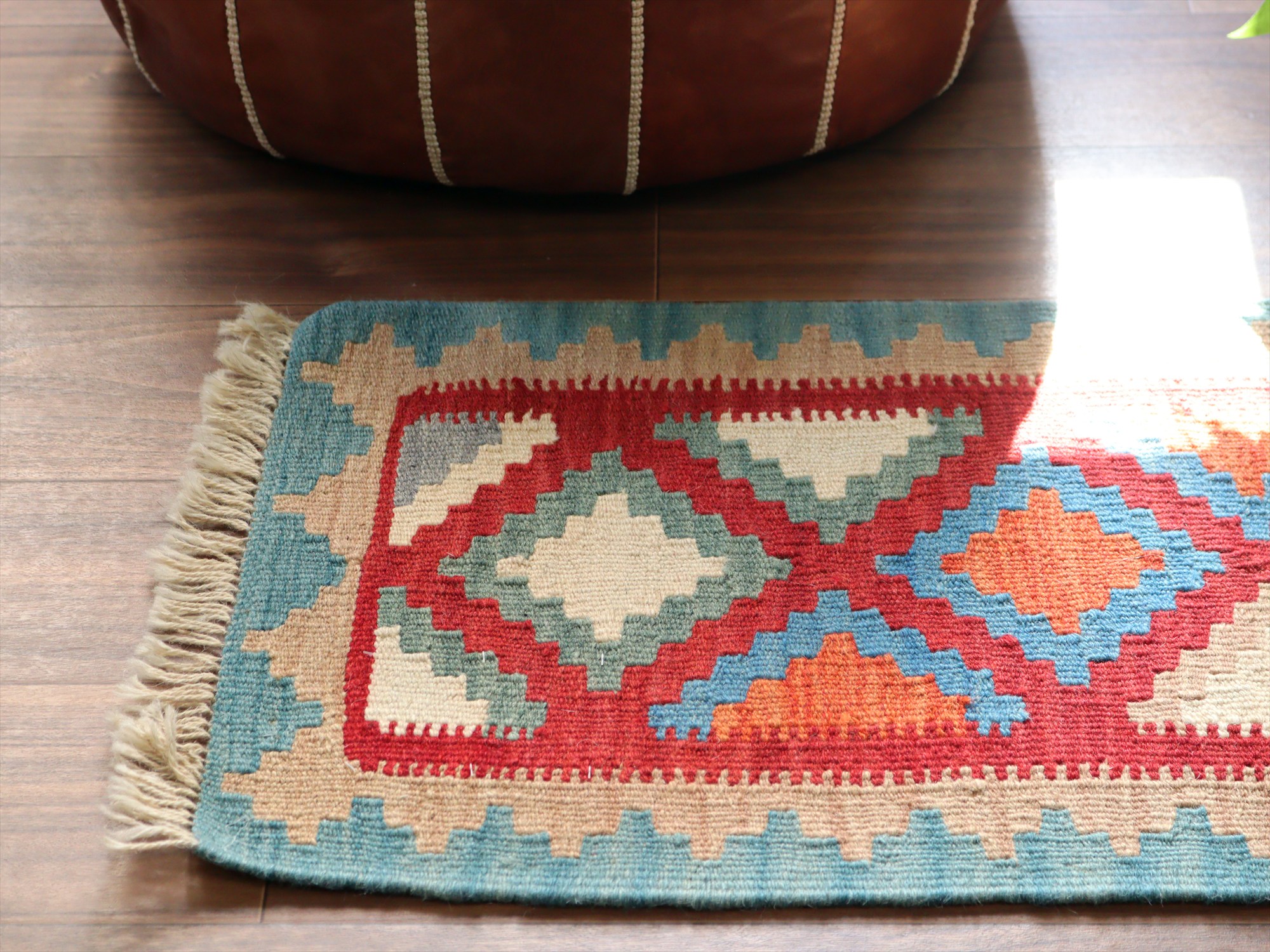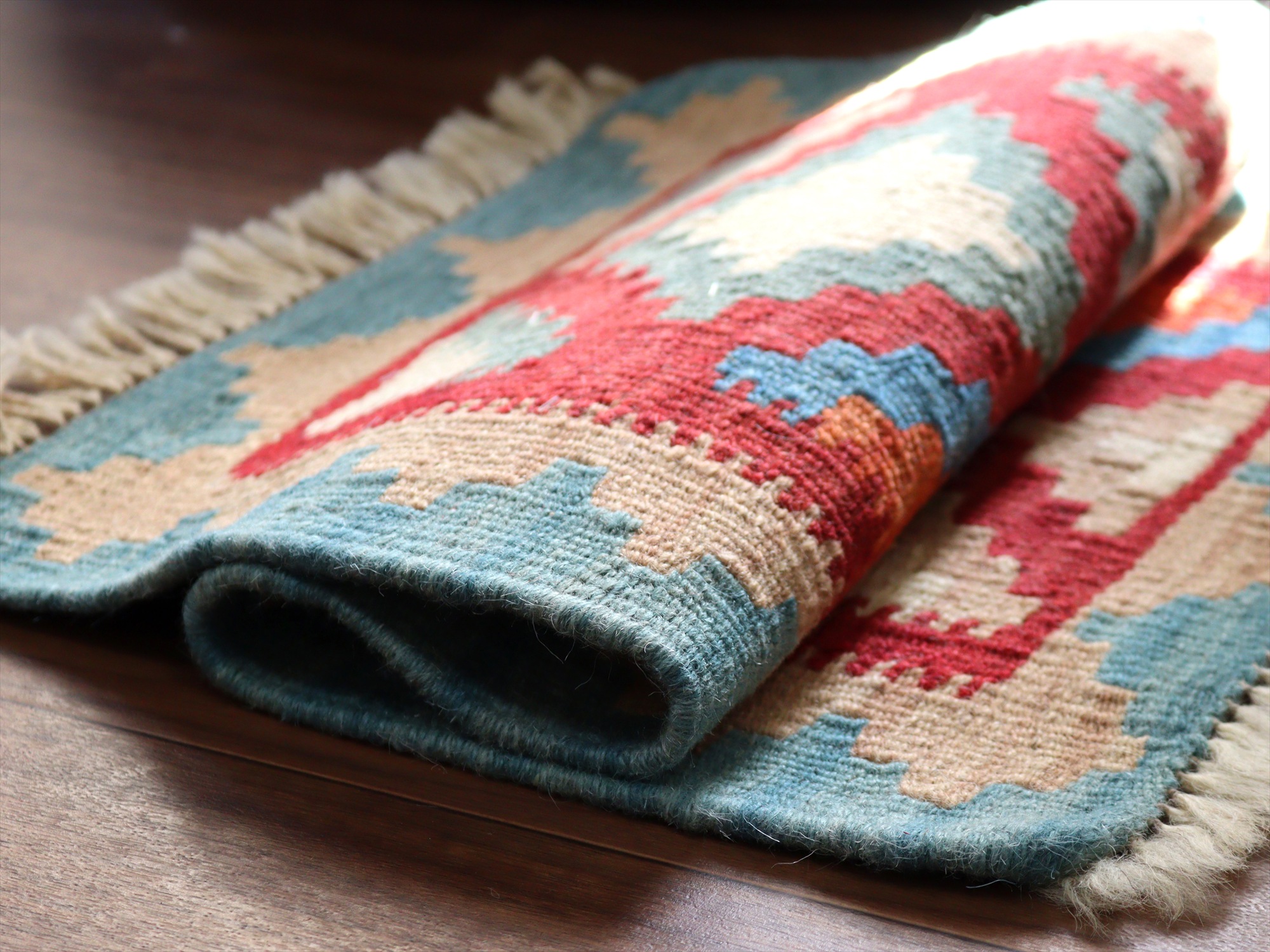 しっかりとしたハリのある織りで、厚みは4mm前後。多少カタチがゆがみがありますが、手織りキリムならではの味わいとご理解ください。
