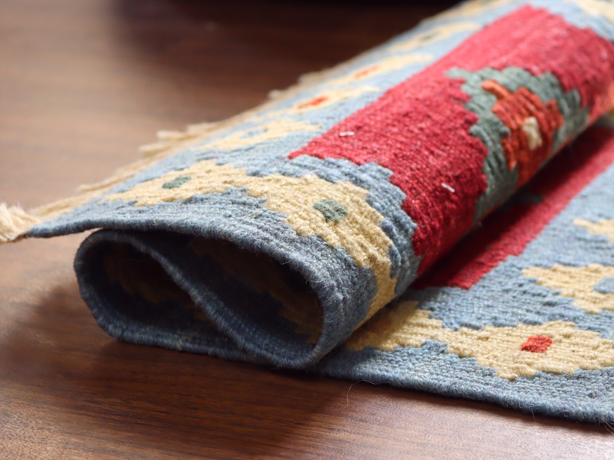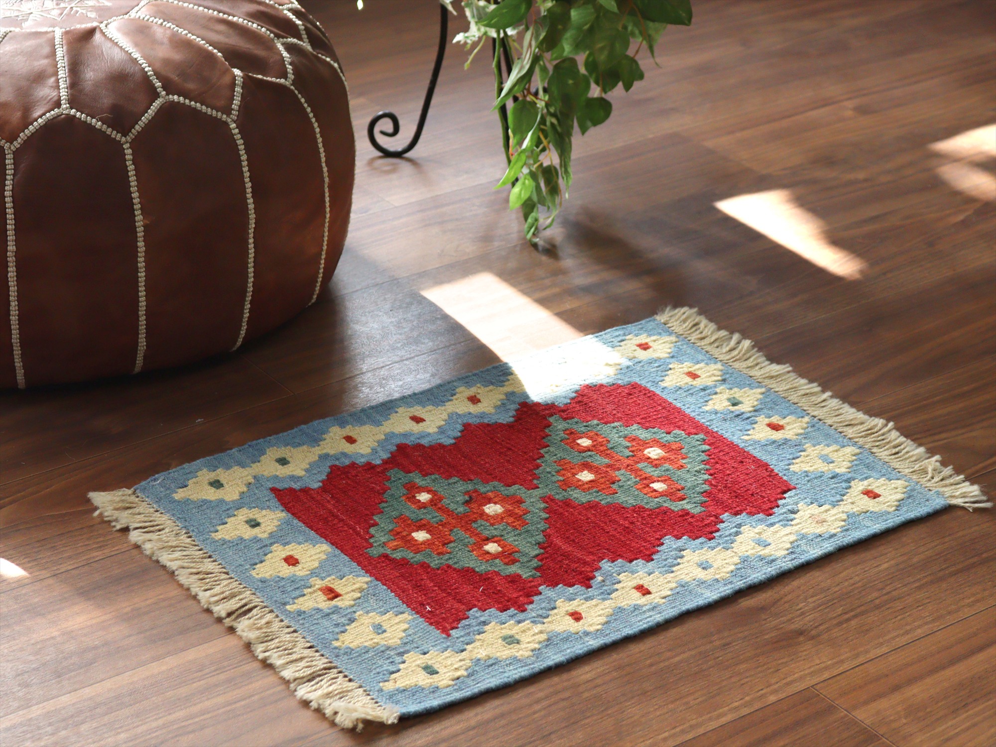 しっかりとしたハリのある織りで、厚みは4mm前後。多少カタチがゆがみがありますが、手織りキリムならではの味わいとご理解ください。