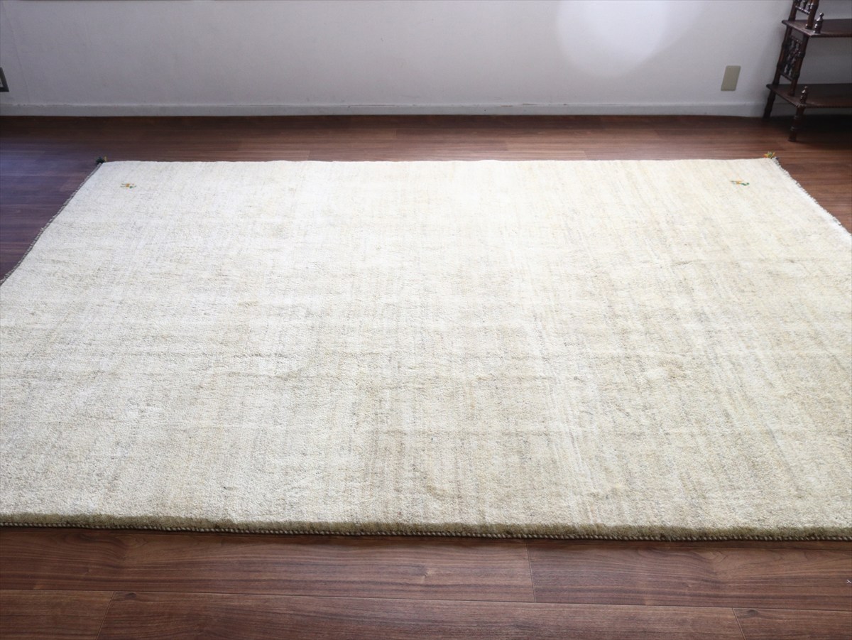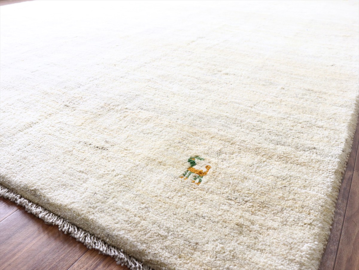 染めていない天然の羊毛の色をいかして織られたアイボリー色のギャッベです。シンプルなデザインながら、羊毛の色の濃淡が自然な感じに混ざり合っていて、ナチュラルであたたかみのある風合いに仕上がっています。