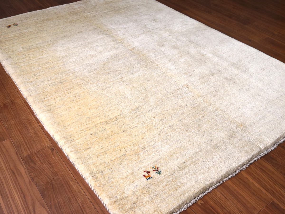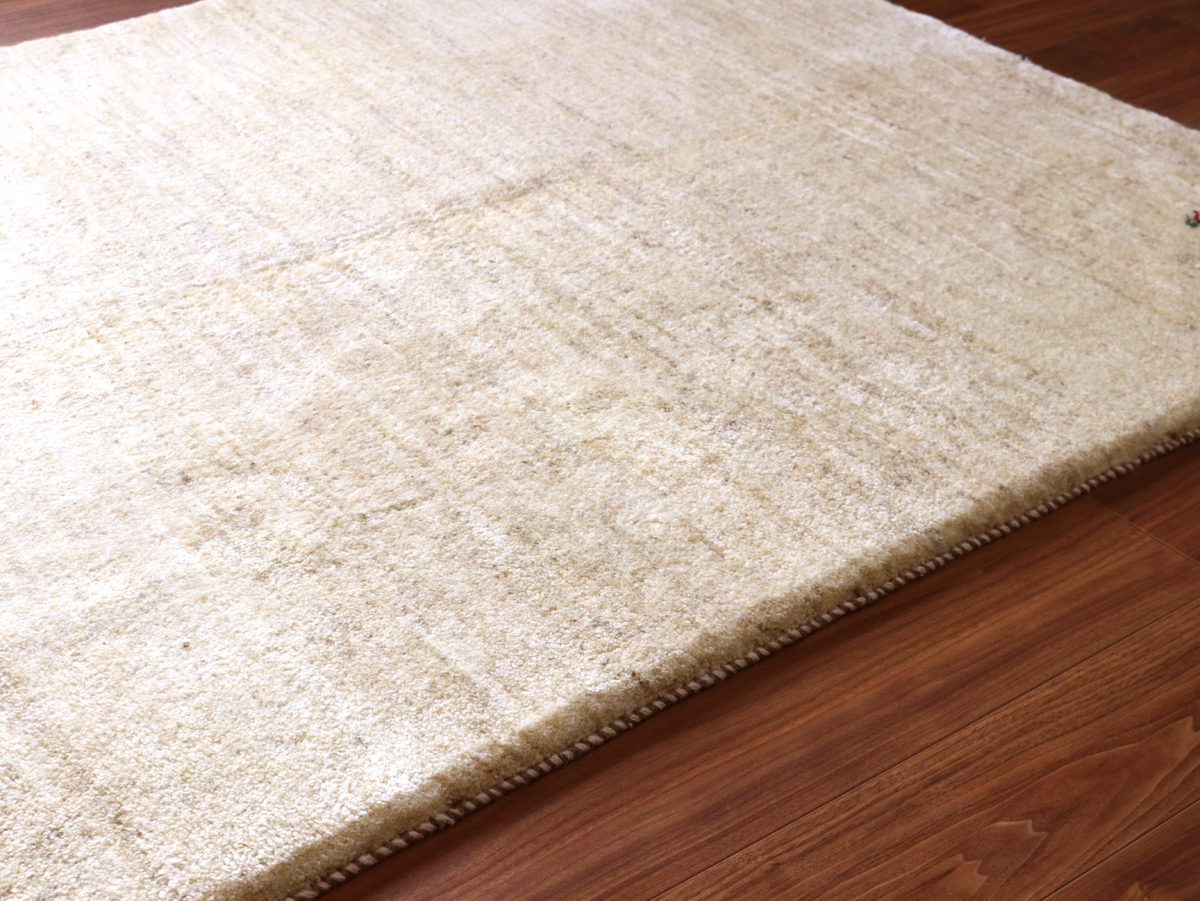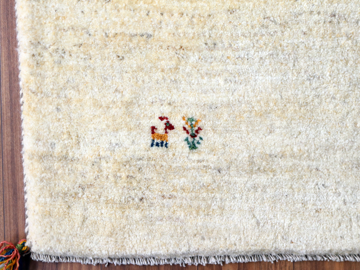 染めていない天然の羊毛の色をいかして織られたアイボリー色のギャッベです。シンプルなデザインながら、羊毛の色の濃淡が自然な感じに混ざり合っていて、ナチュラルであたたかみのある風合いに仕上がっています。