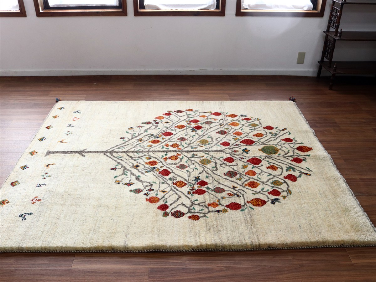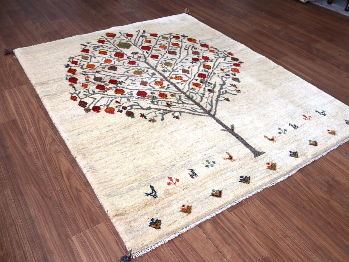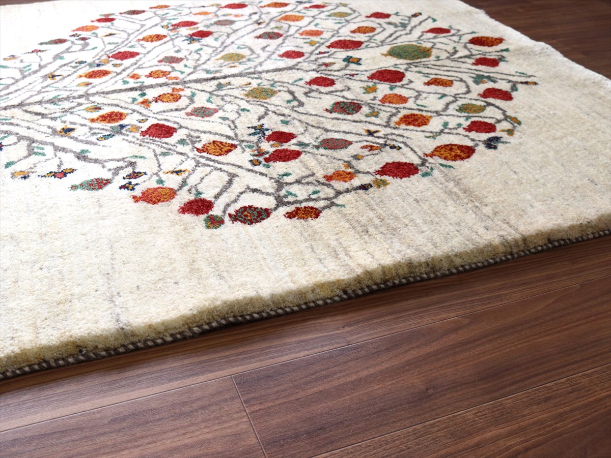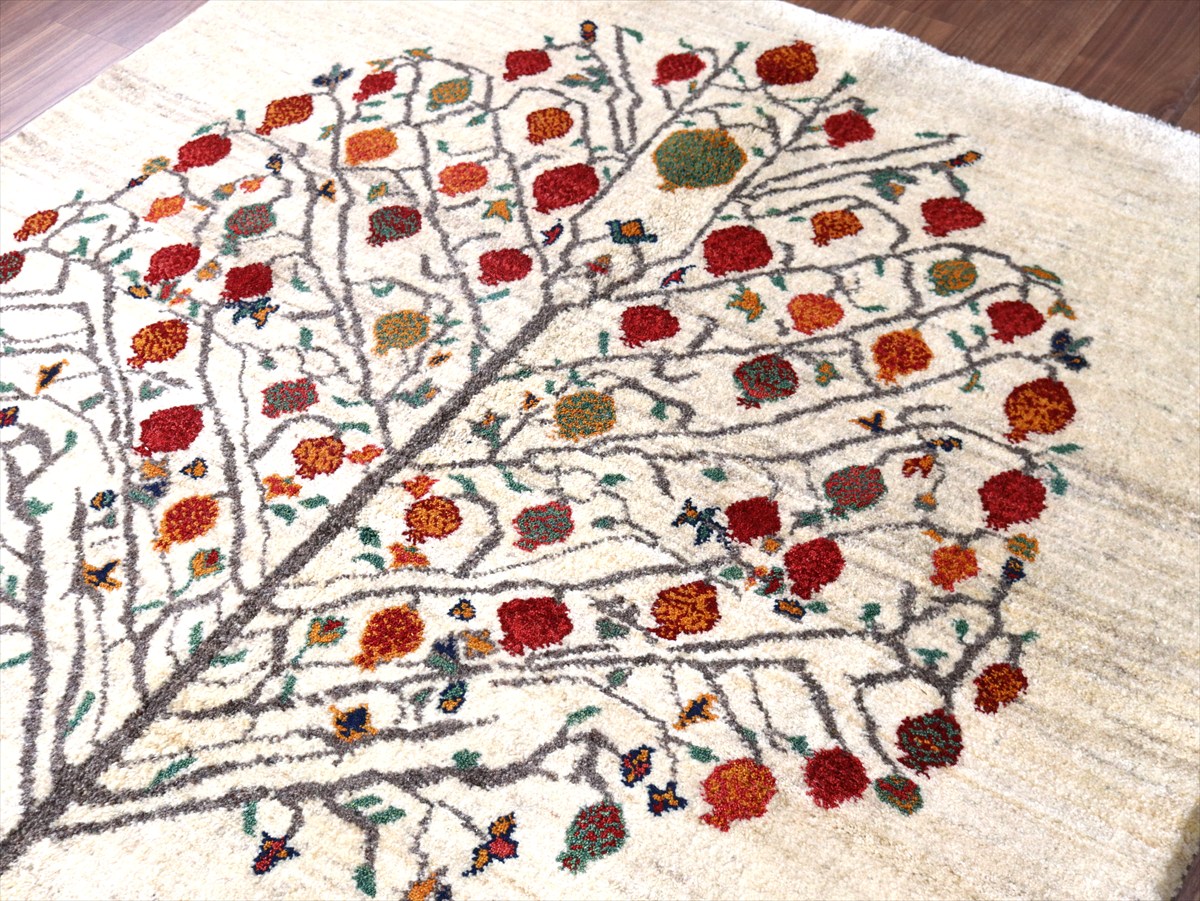 ギャッベ Gabbeh ナチュラルアイボリー 198×160cm イラン産 ザクロの樹と鳥と動物