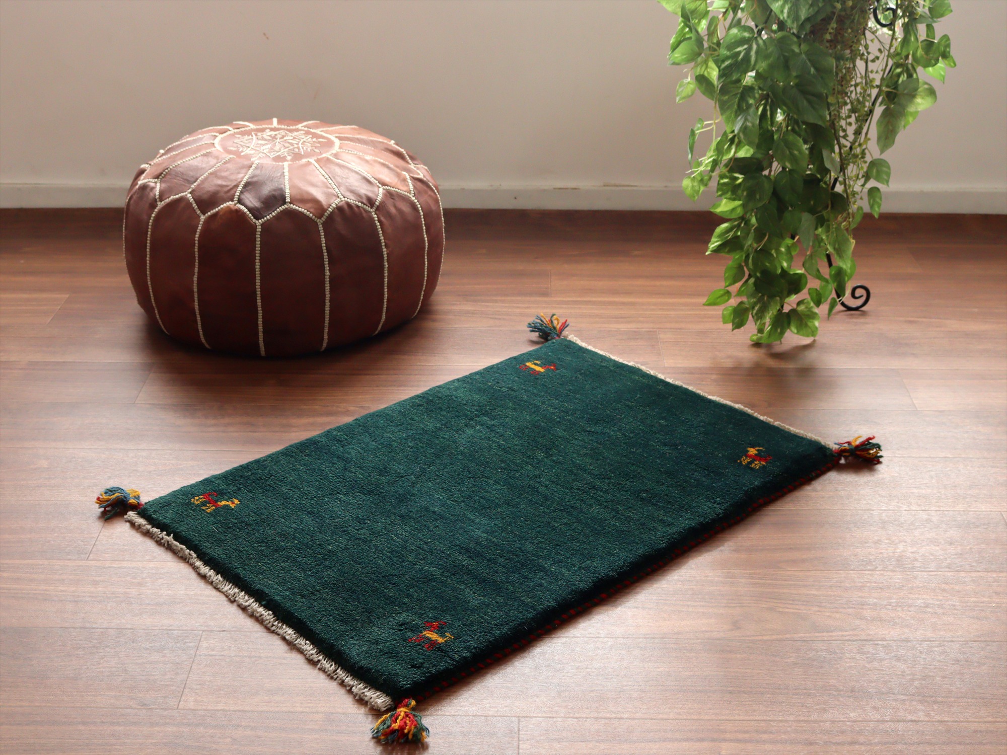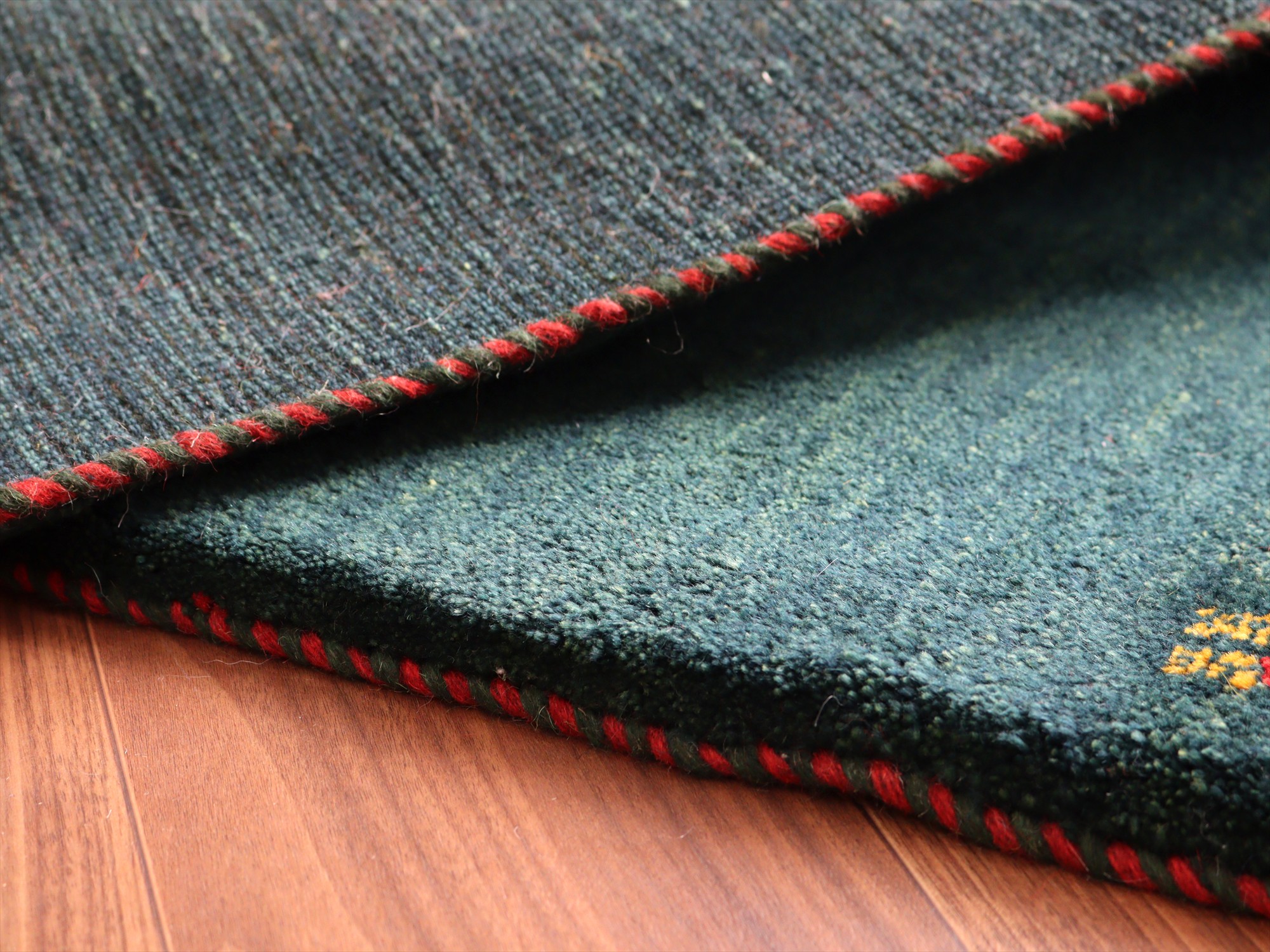 - ギャッベ イラン産手織りラグ 86x60cm グリーン シンプルモチーフ