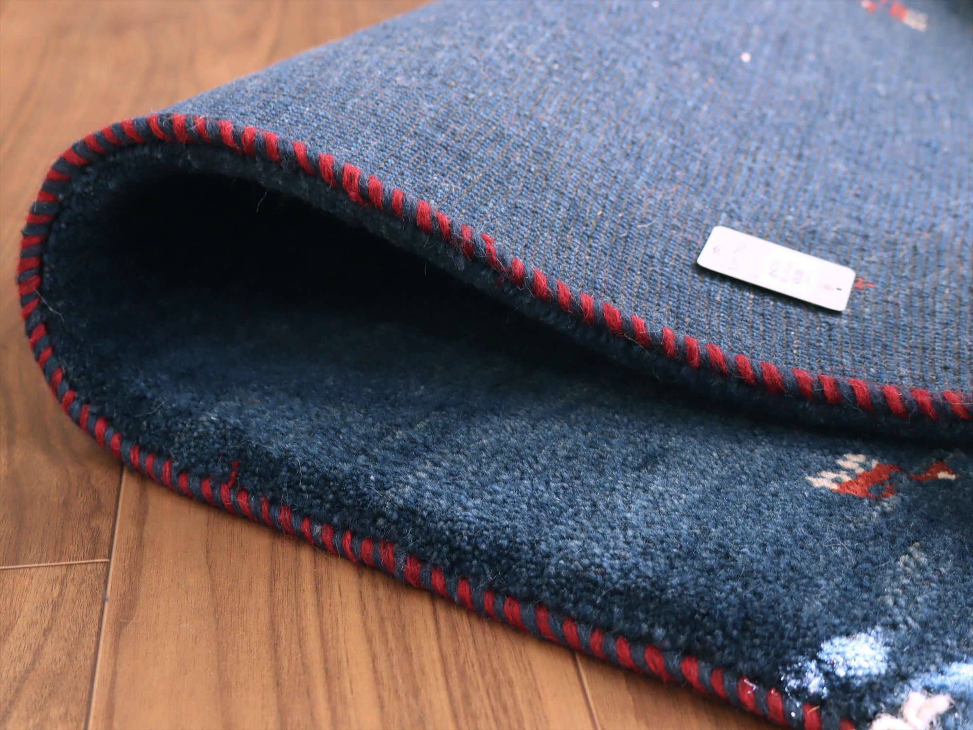- ギャッベ イラン産手織りラグ 88x65cm シンプルモチーフ ブルー