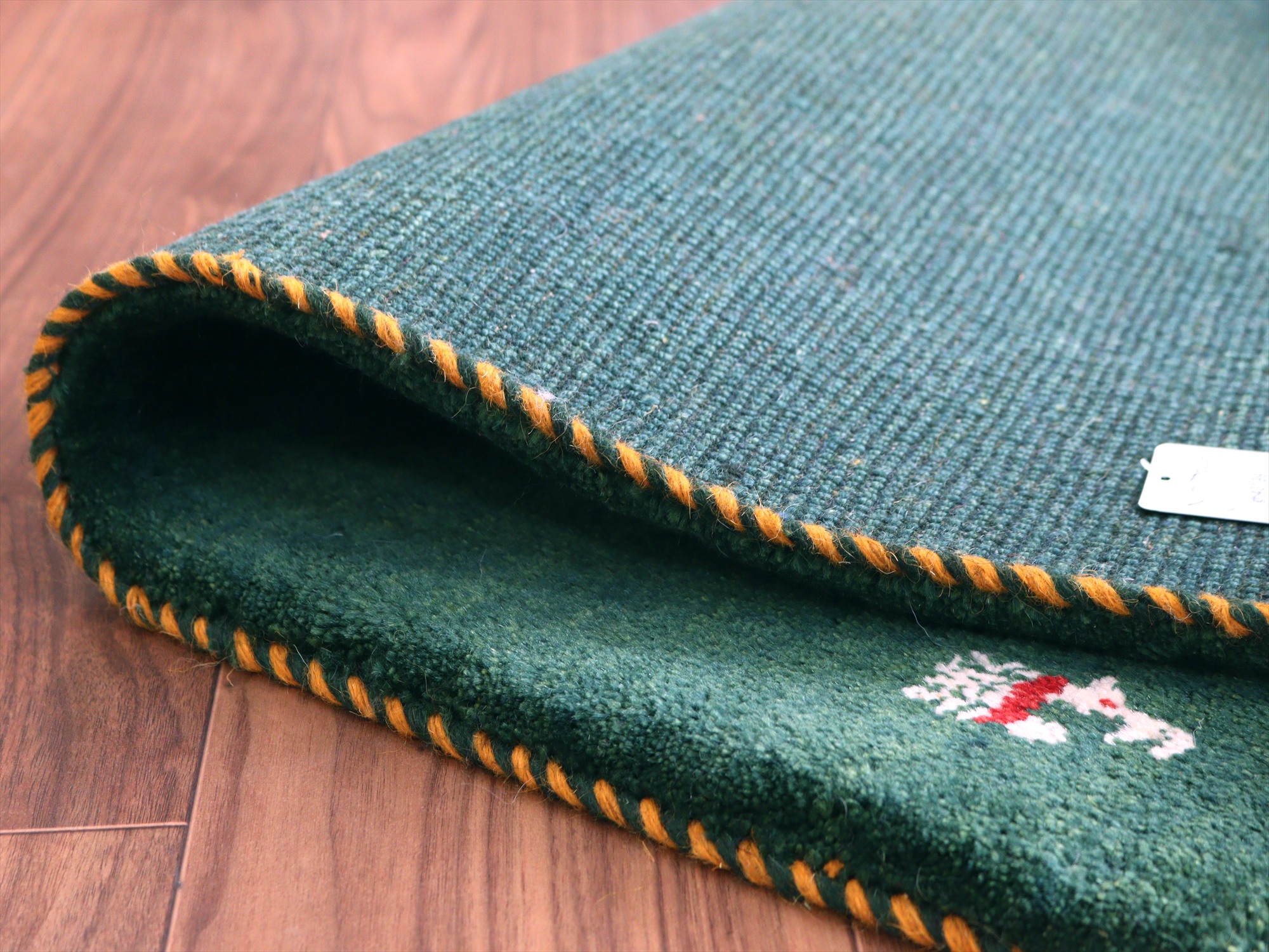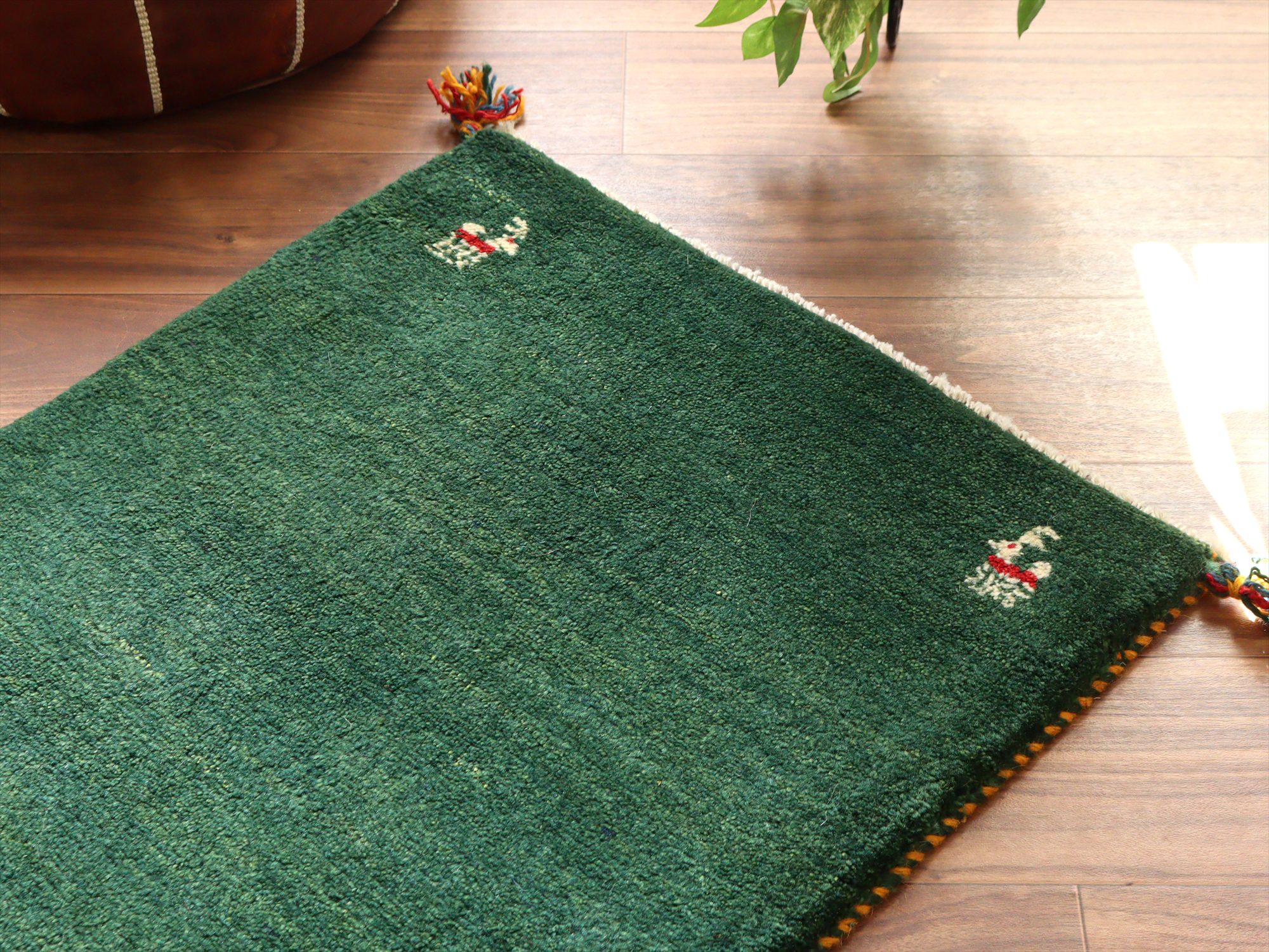 ギャッベ イラン産手織りラグ 88x60cm グリーン シンプルモチーフ