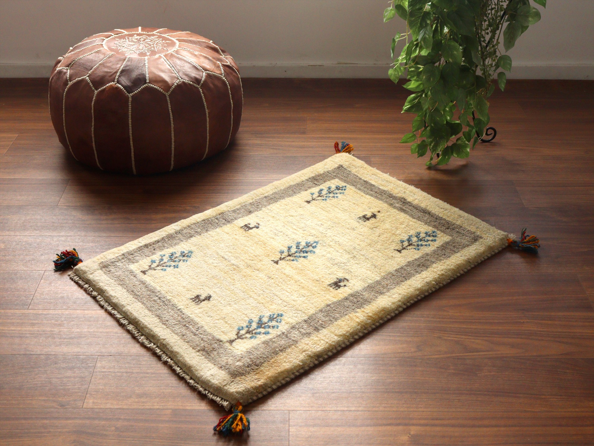 ギャッベ イラン産手織りラグ 90x62cm 植物と動物 アイボリー&グレー