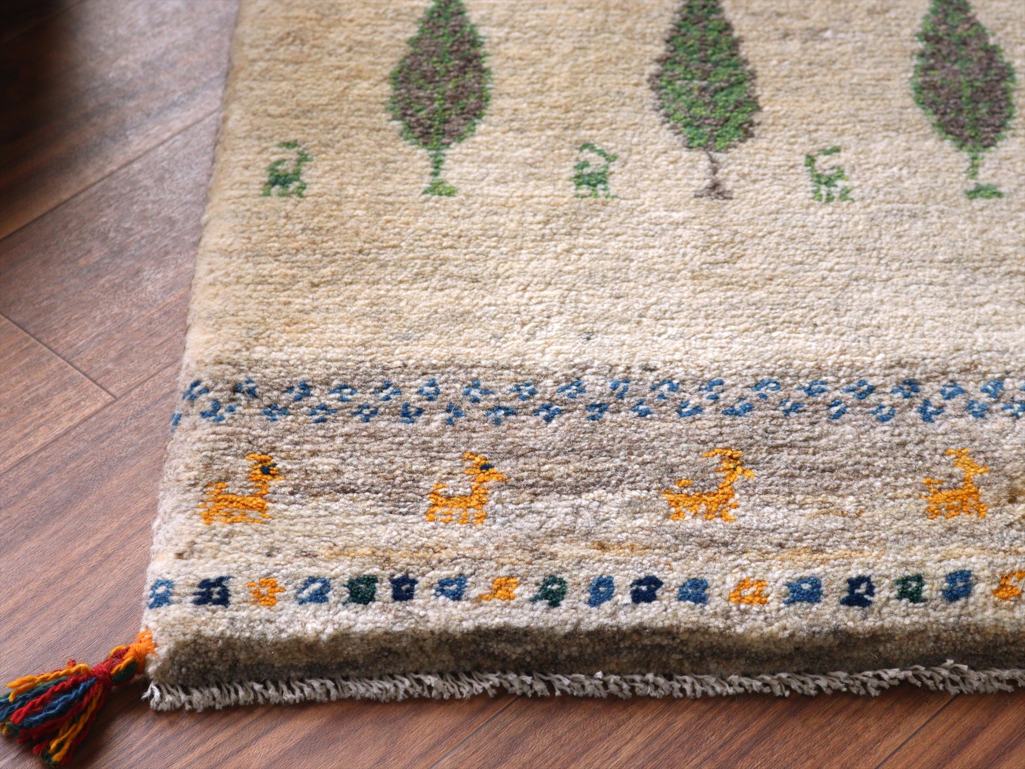 ギャッベ イラン産手織りラグ 88x58cm 動物と植物 アイボリー