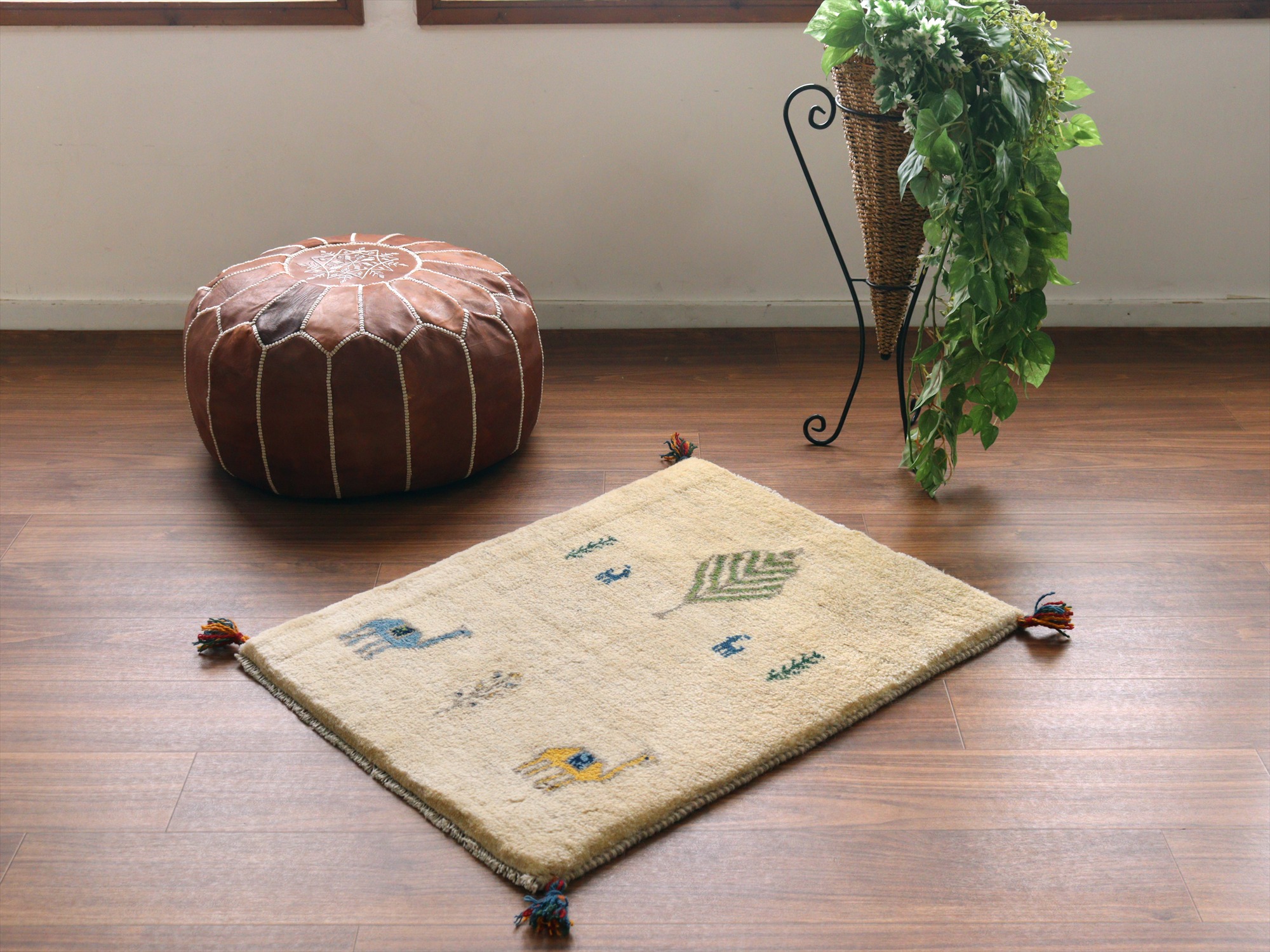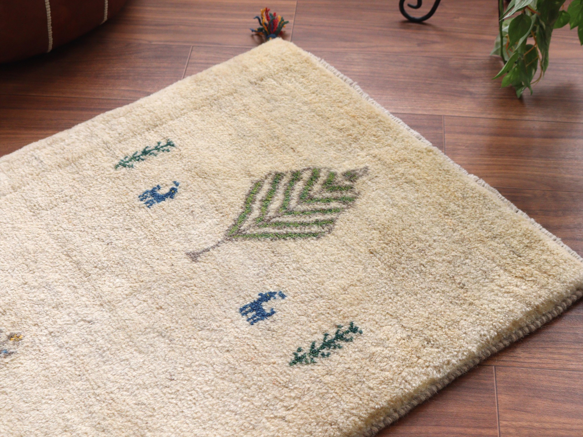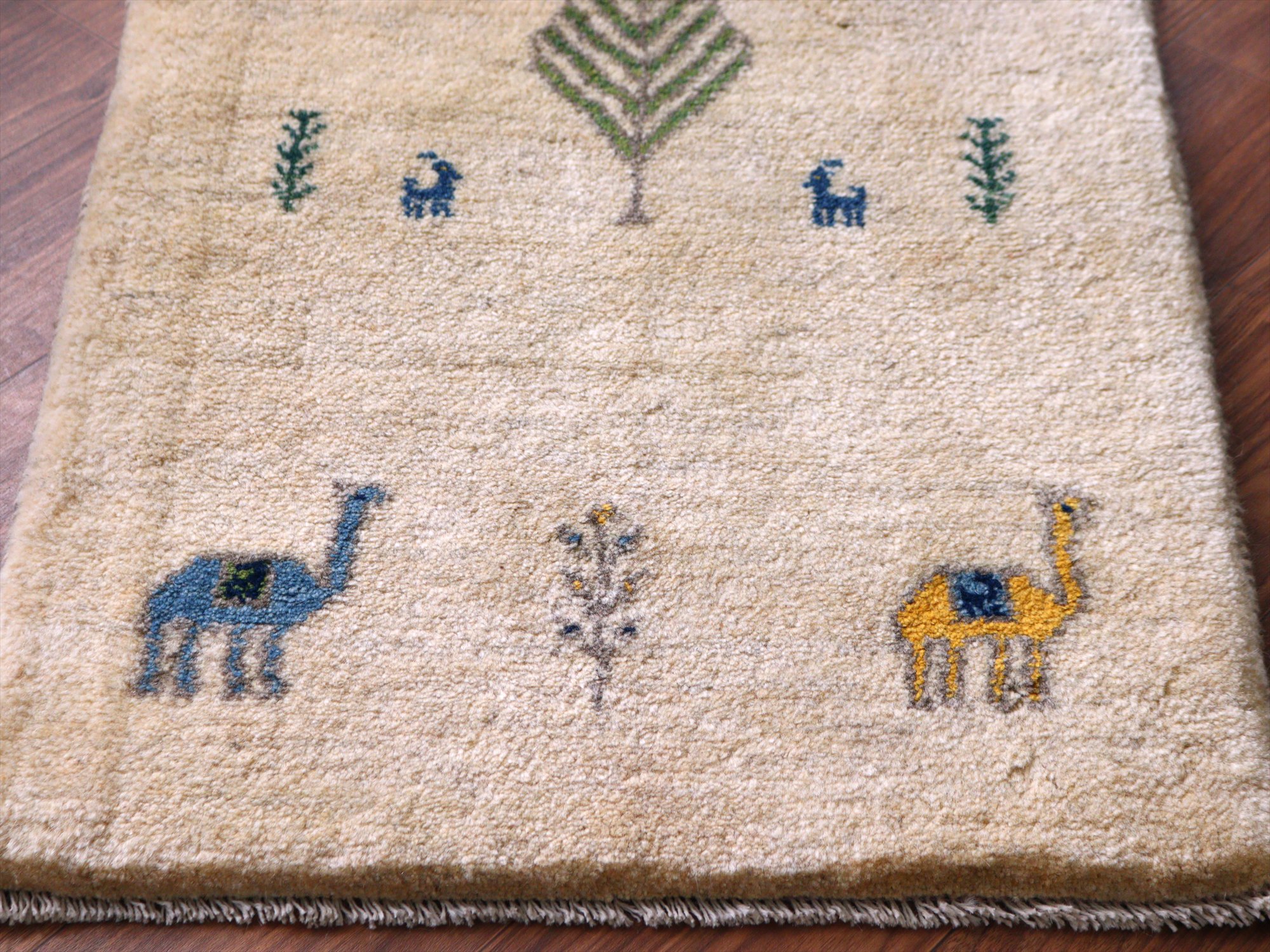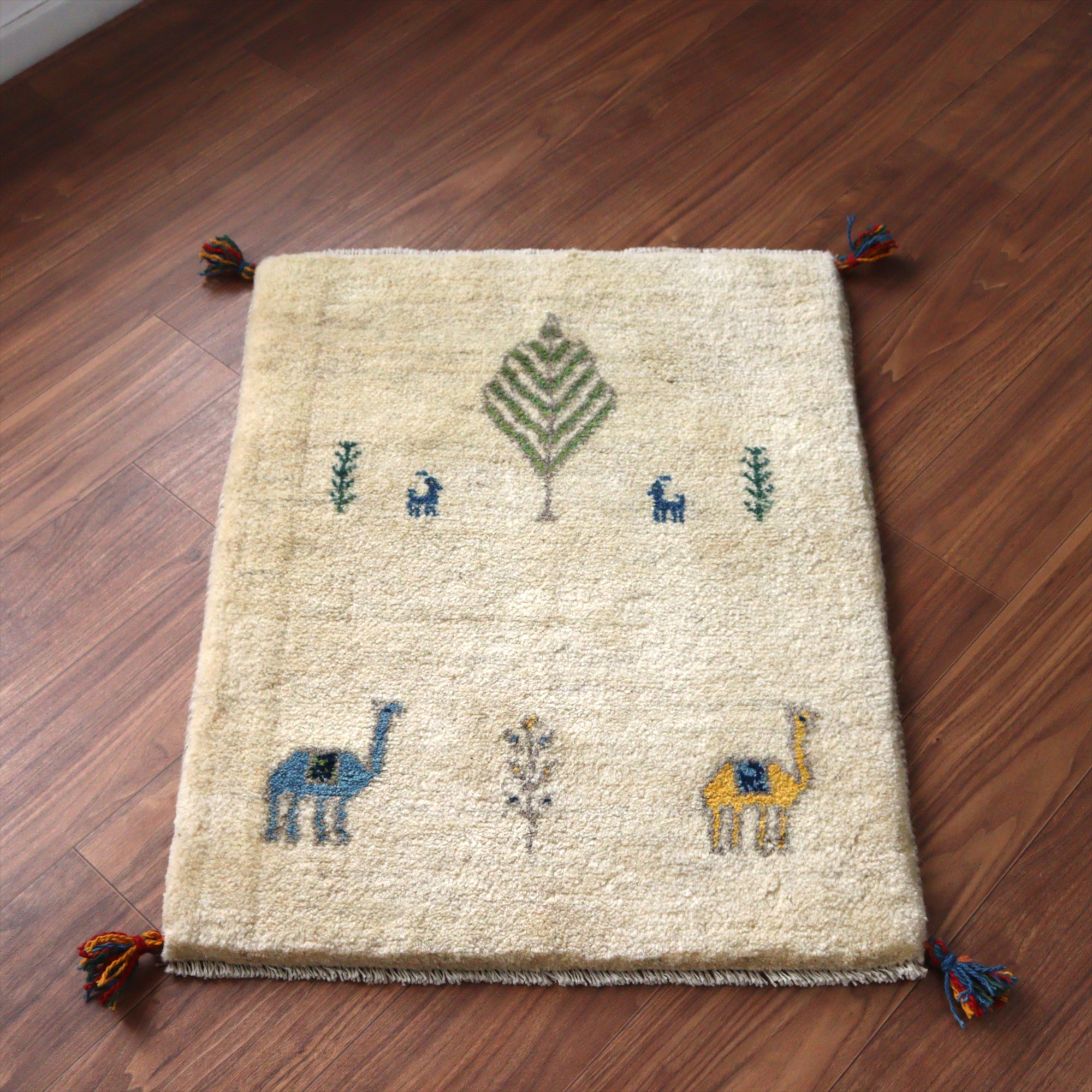 ギャッベ イラン産手織りラグ 85x63cm 動物と植物 アイボリー
