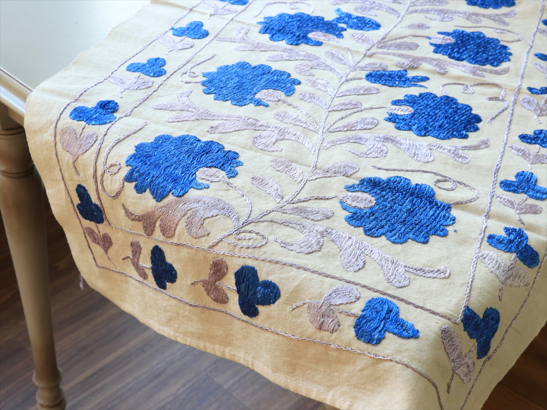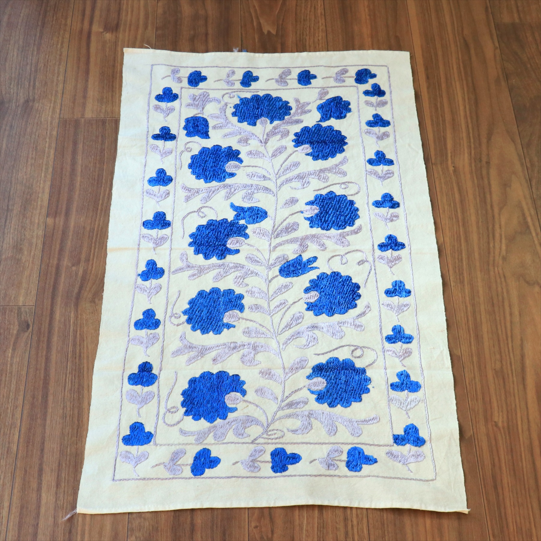 スザンニ刺繍布 ウズベキスタン87×50cm カーネーション ブルー テーブルセンター