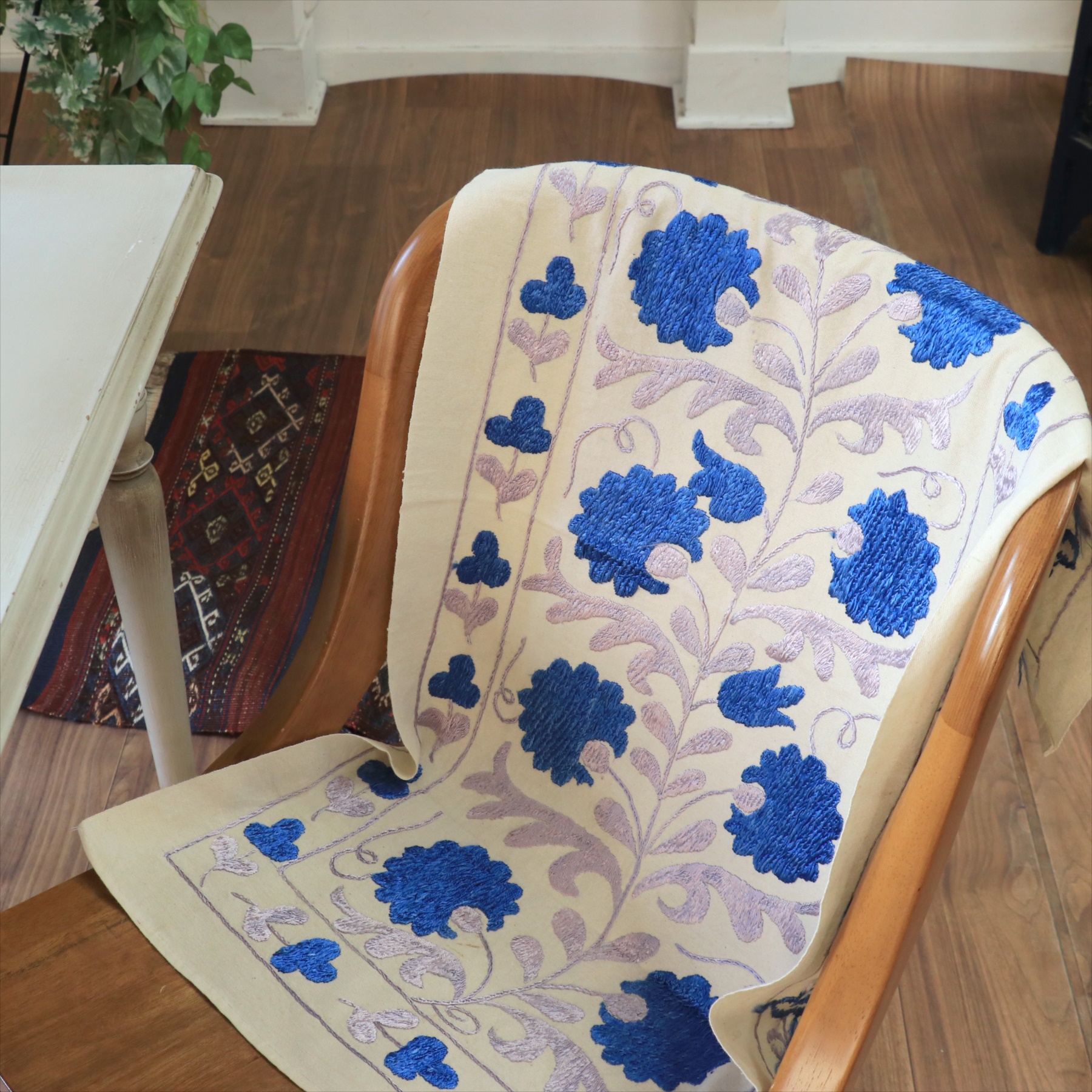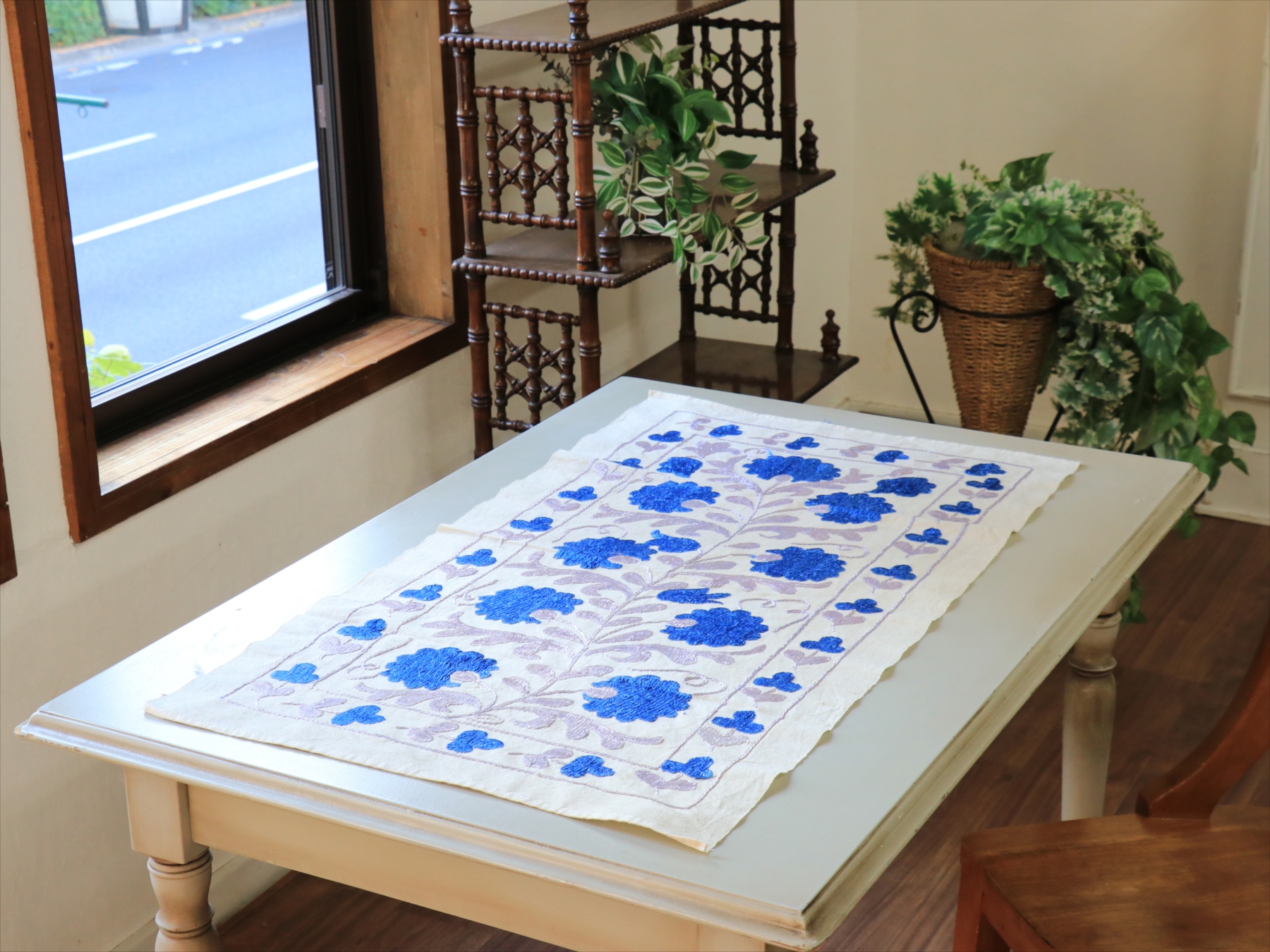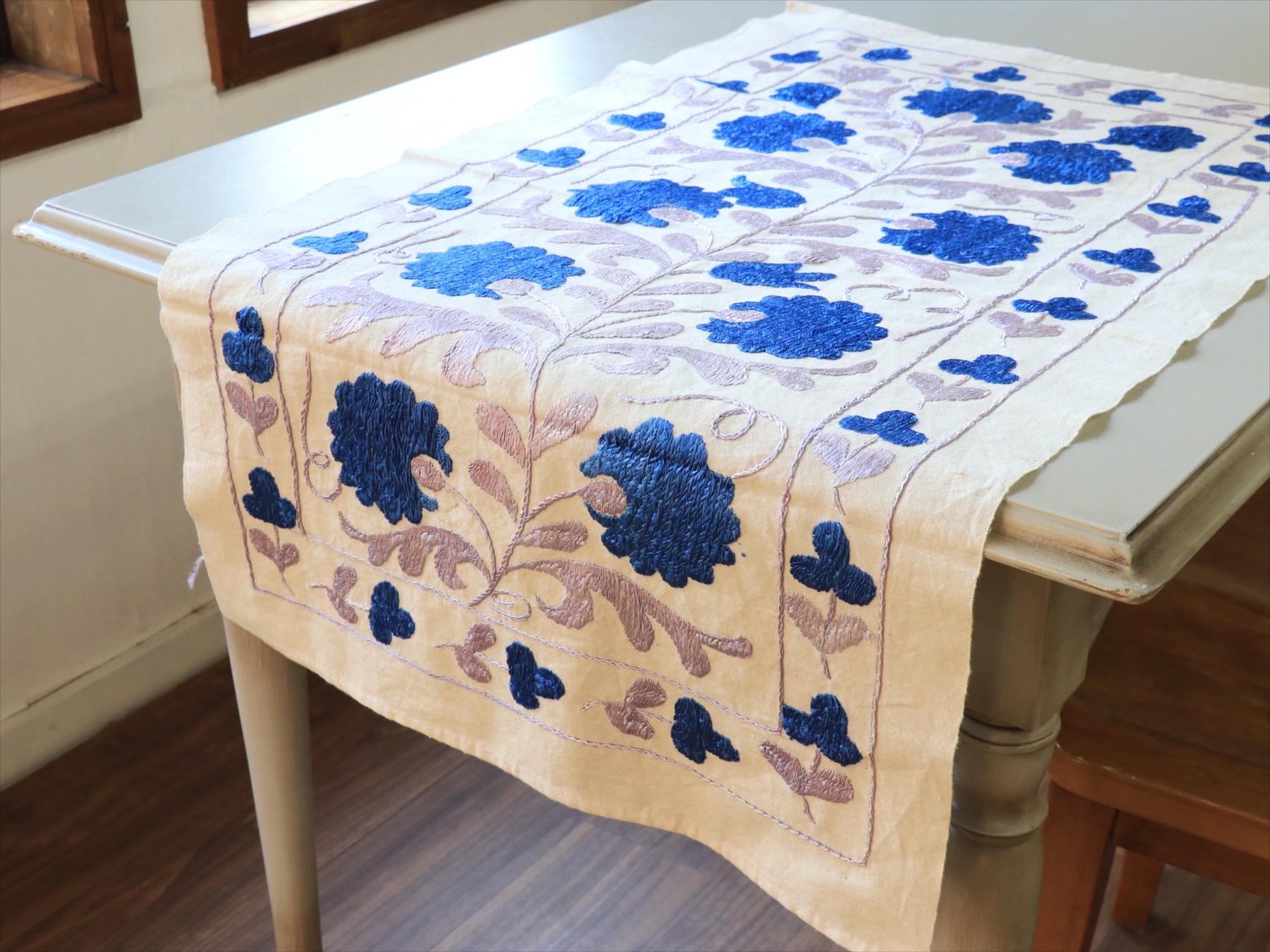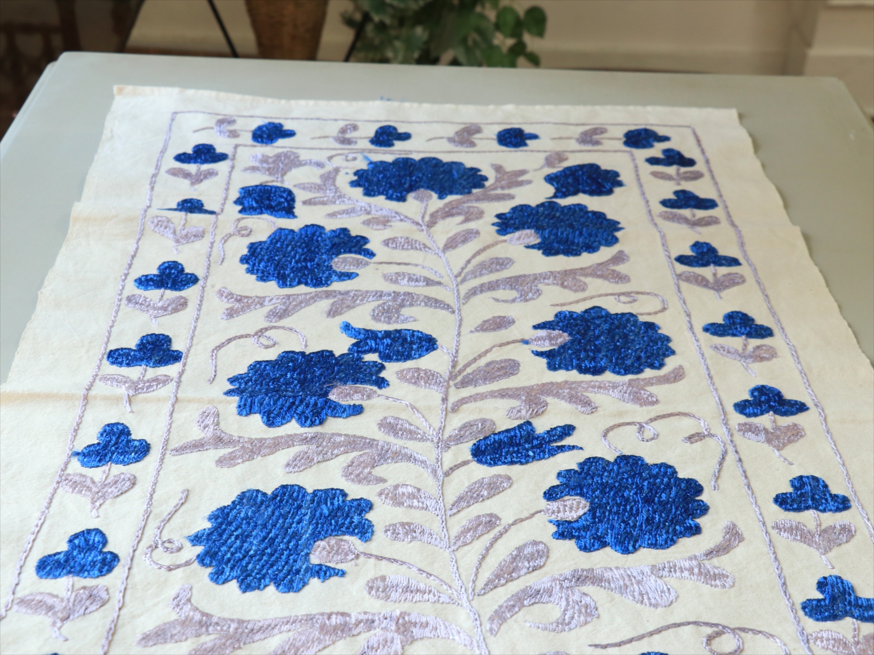 5. スザンニ刺繍布 ウズベキスタン87×50cm カーネーション ブルー テーブルセンター
