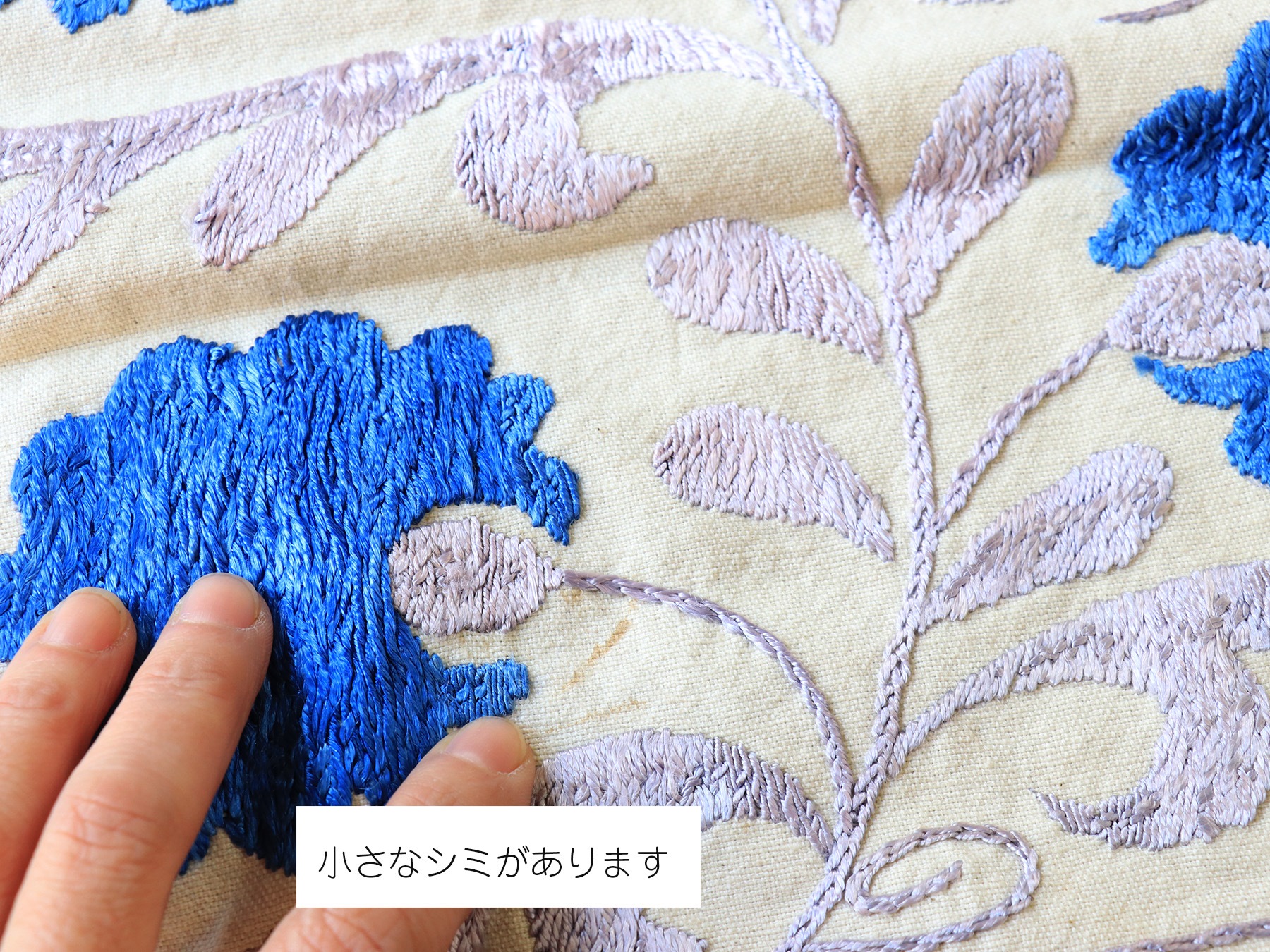 カーネーションの花がモチーフになったトルコ伝統のデザイン。しっかりしたブルーと、淡い紫のコントラストがユニークです。刺繍は細かなサテンステッチ。