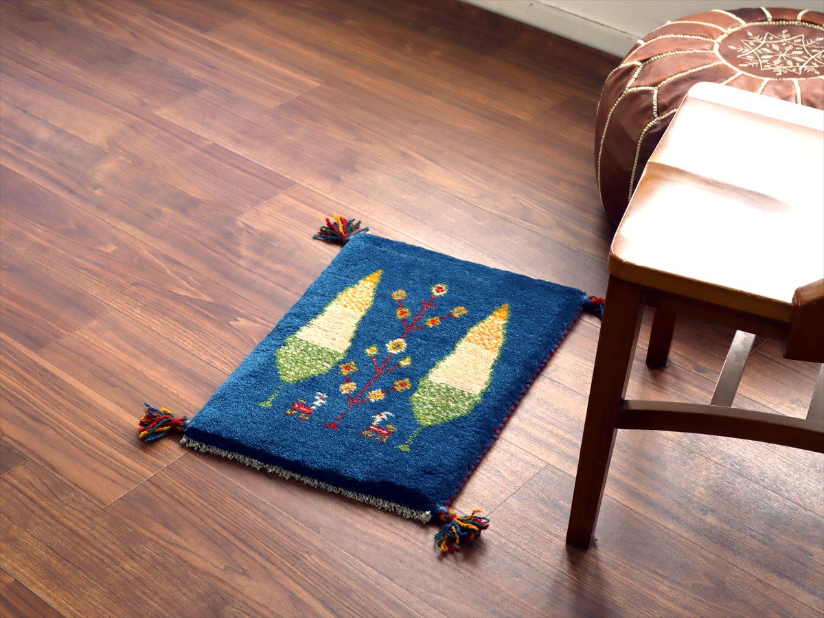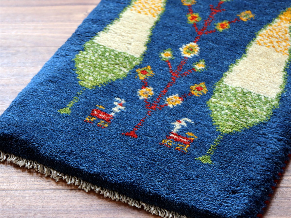- ギャッベ ミニギャベ イラン産 55×40cm ブルー 糸杉と動物