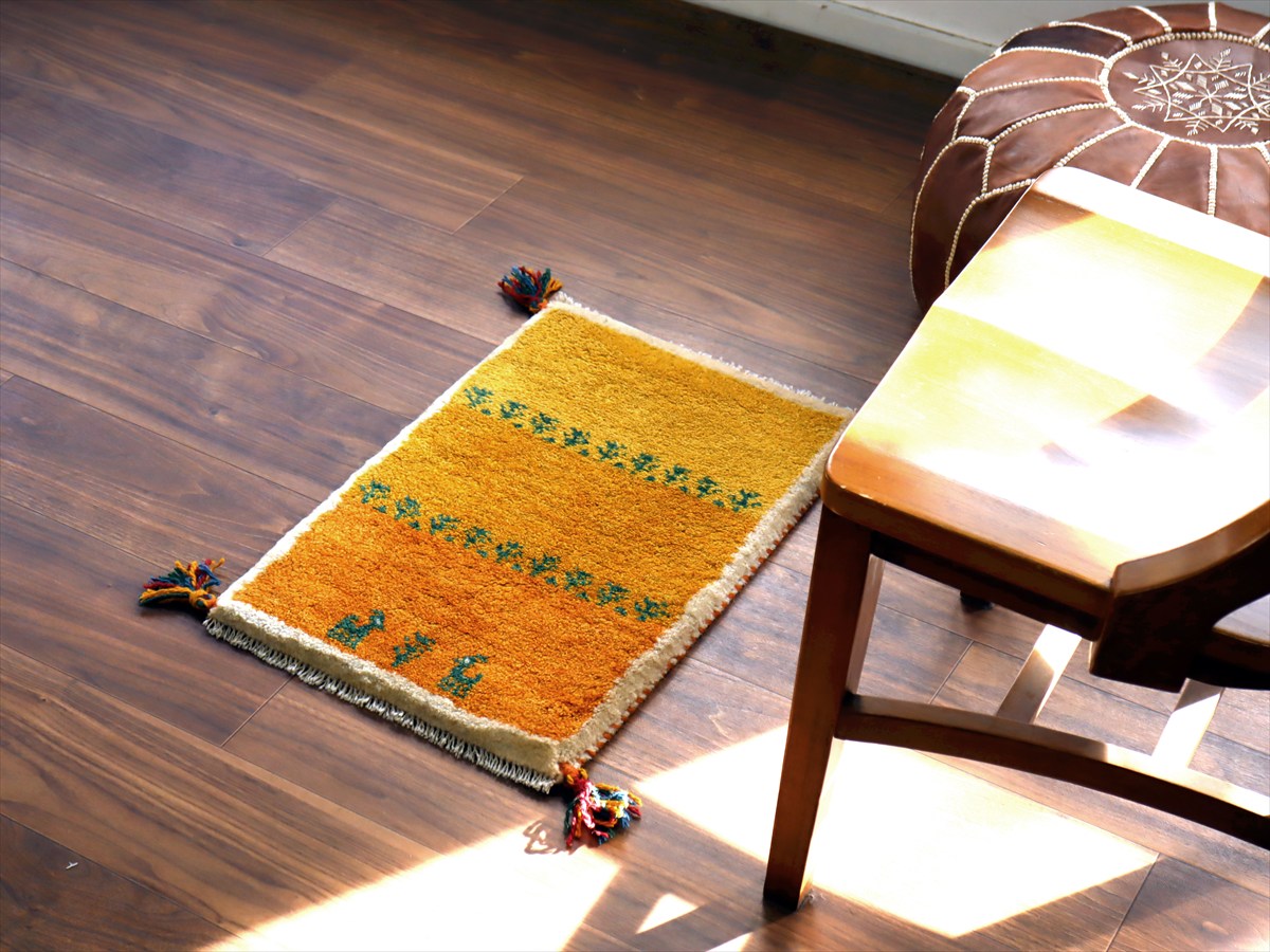Key:ギャッベ,ギャベ,一点もの 現品販売 ラグ,ウール製,イラン,手織り,じゅうたん,絨毯,座布団, イエロー オレンジ 黄色 草木染, ガラタバザール Gabbeh, Handmade, Hand knotted, Tribal rug, Iran carpet, Wool, Natural Dye,