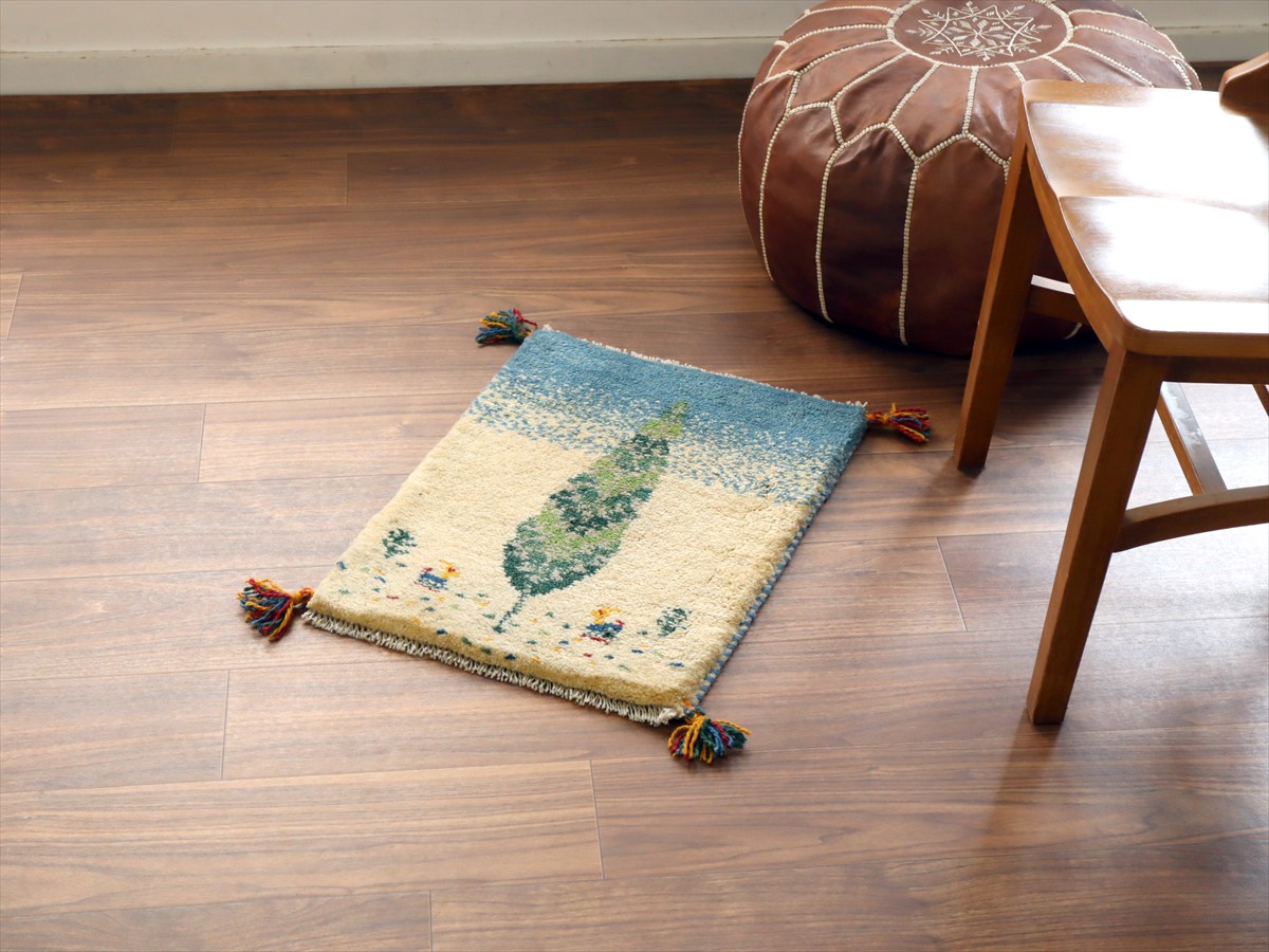 ギャッベ ミニギャベ イラン産 56×42cm ナチュラルアイボリー&ブルー 糸杉と動物