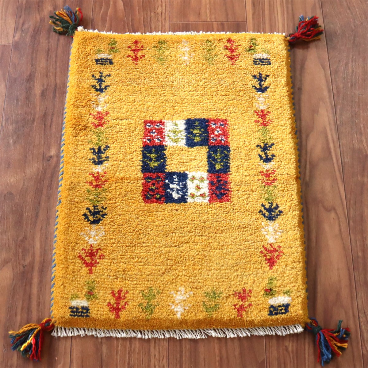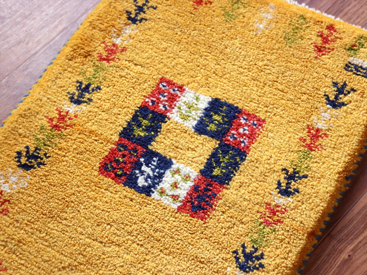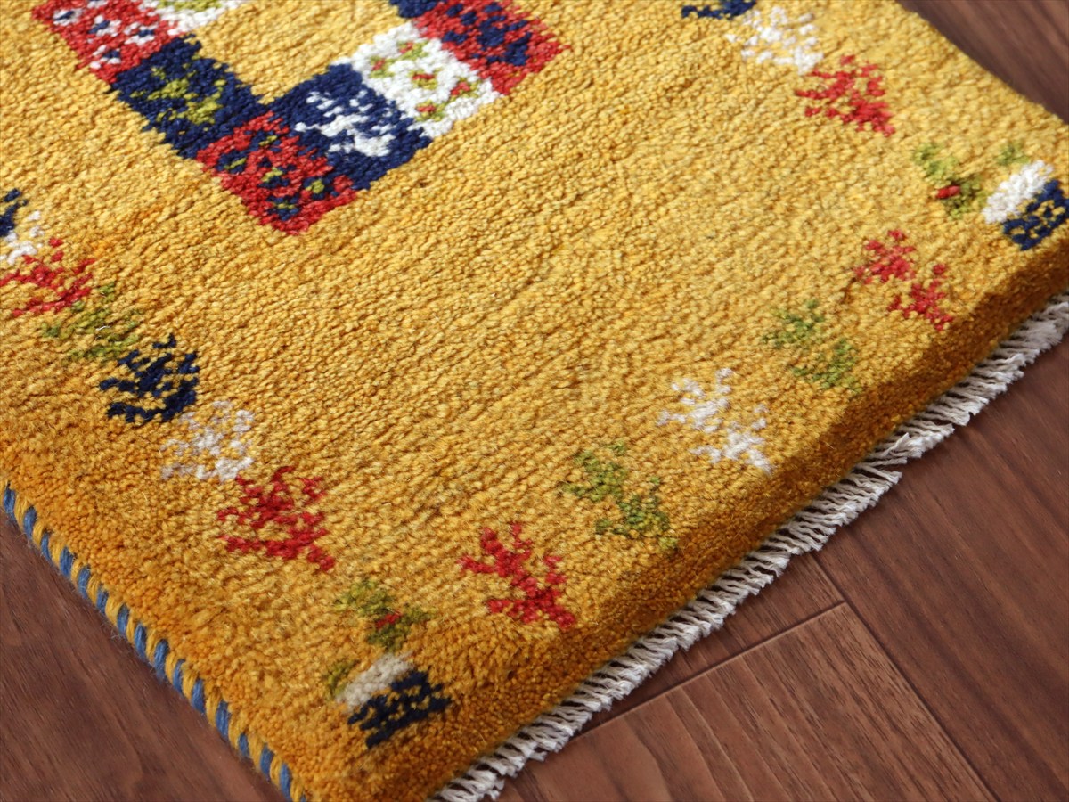 Key:ギャッベ,ギャベ,一点もの 現品販売 ラグ,ウール製,イラン,手織り,じゅうたん,絨毯,座布団, イエロー オレンジ 黄色 草木染, ガラタバザール Gabbeh, Handmade, Hand knotted, Tribal rug, Iran carpet, Wool, Natural Dye,