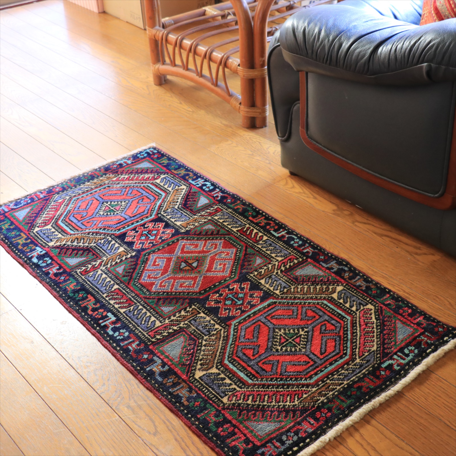 幾何学モチーフが入り組んで、几帳面な感じで織られています。パイル(毛足)の方向によって、とても落ち着いた渋い色に見えたり、鮮やかな色づかいにみえたり印象が異なります。織られてからほとんど使われていた様子がなく、今後長く使っていくうちに日焼けにより少しずつ退色していくと考えられます。