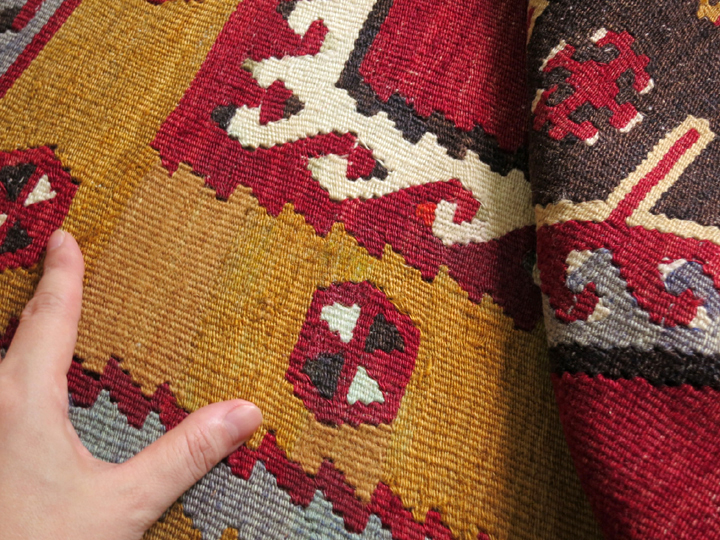大きなダメージはなく、よいコンディション。織り地はやや厚みがあり、しっかりしています。フロアに敷いてもキリム自体の重みがあるので、床になじむ感じ。