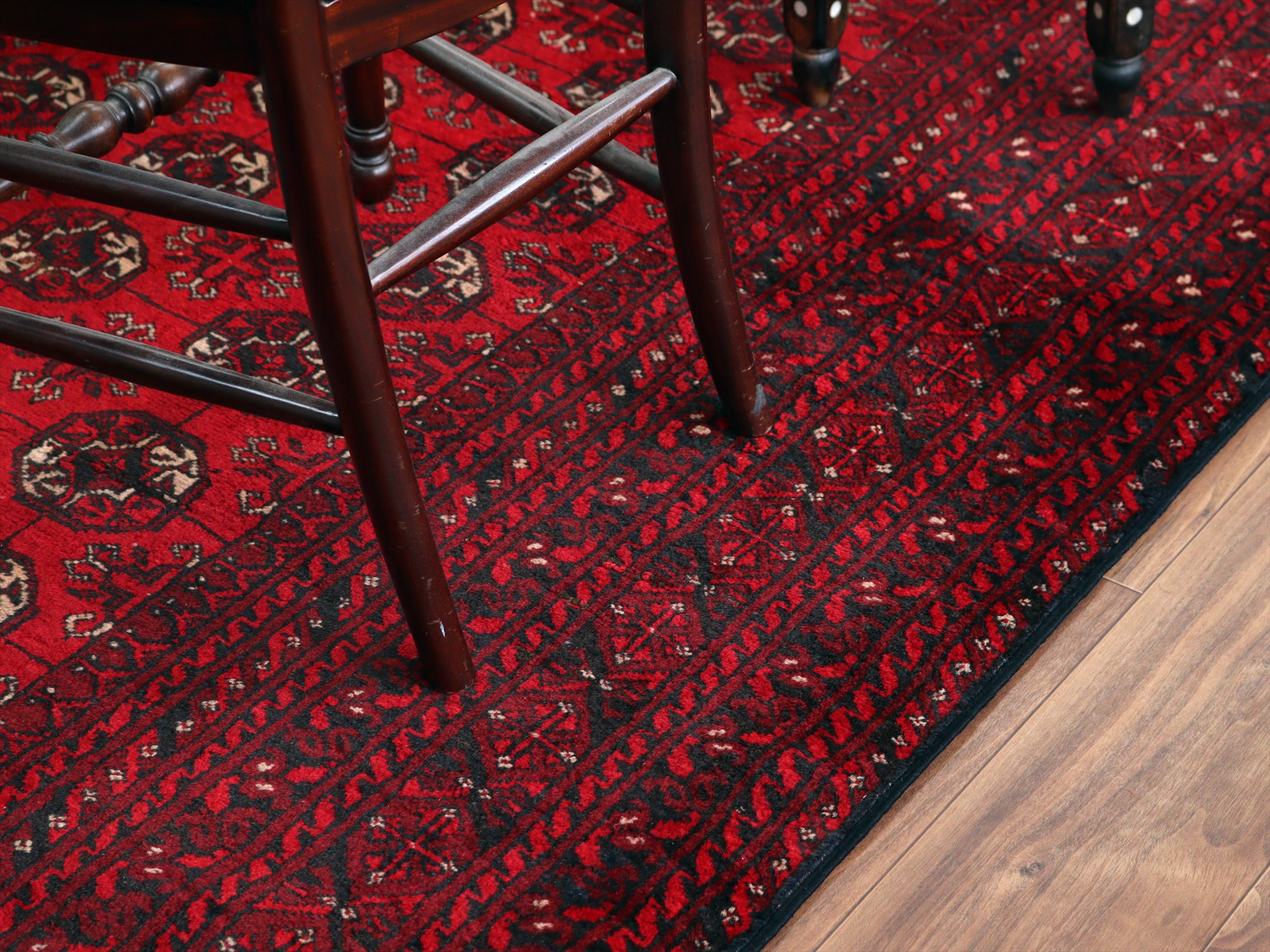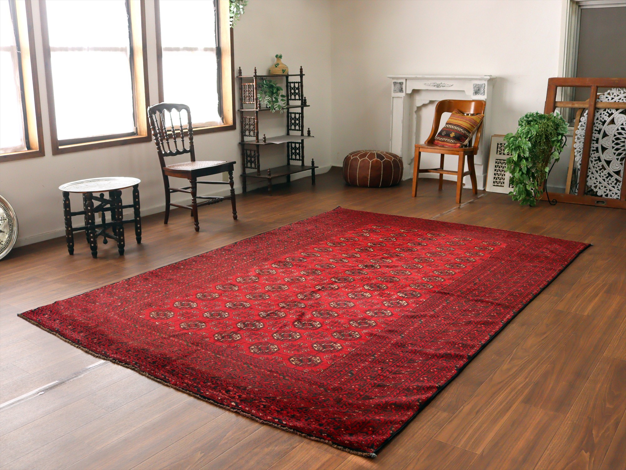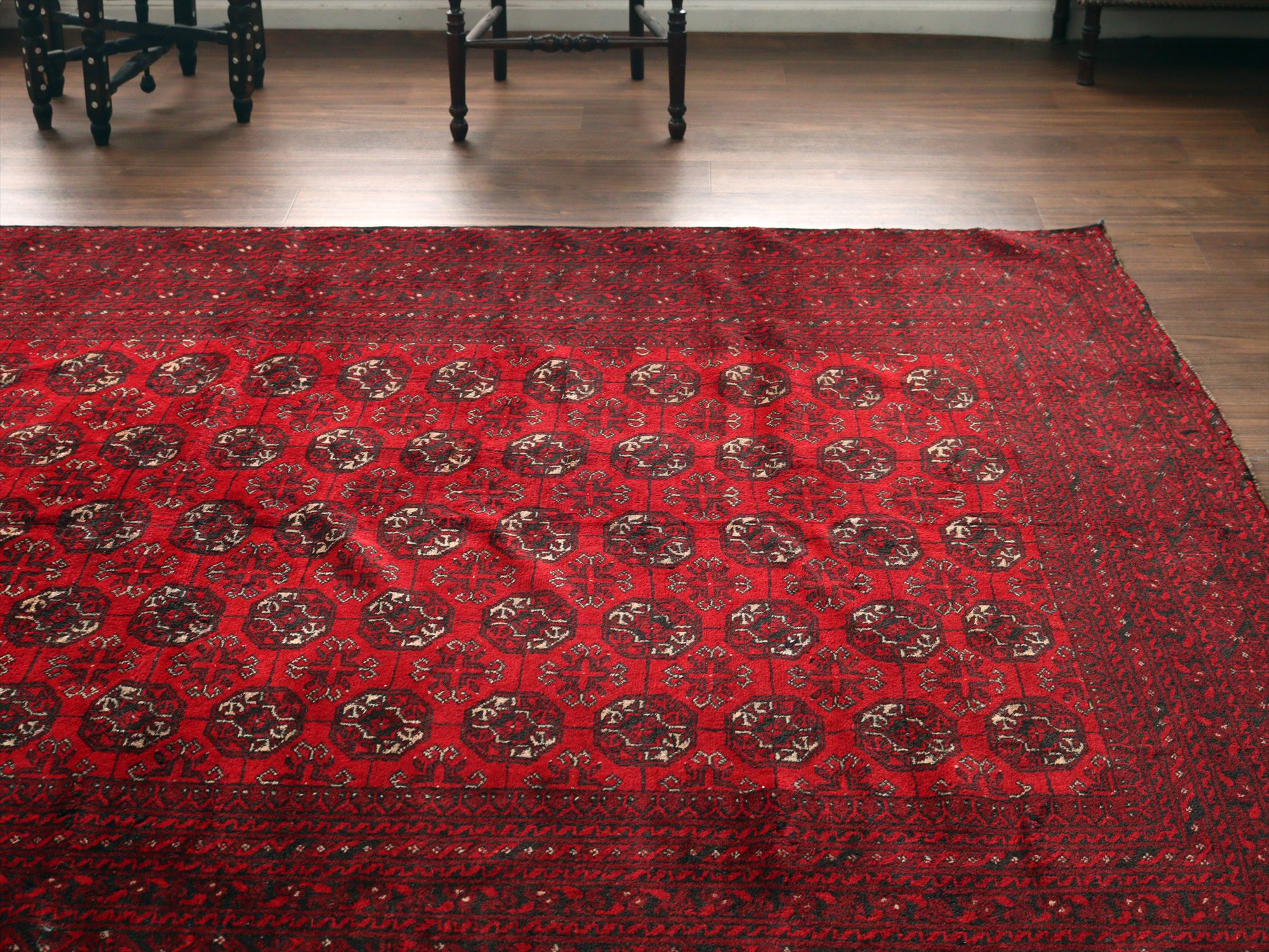 トーンの異なるレッドで織られた幾何学模様が連続するアフガン絨毯。クラシックで重厚感のある佇まいが、お部屋を落ち着いた雰囲気に。