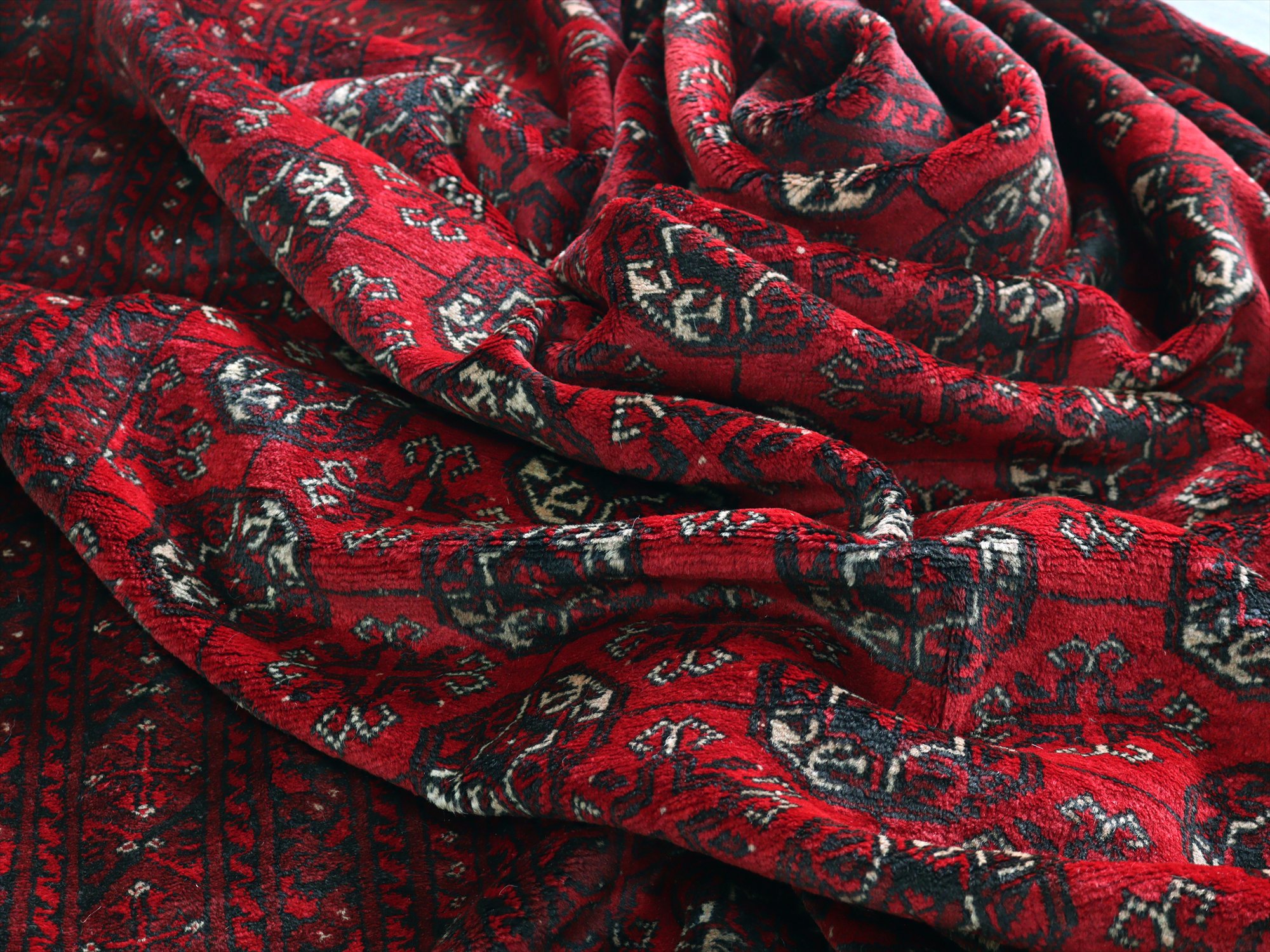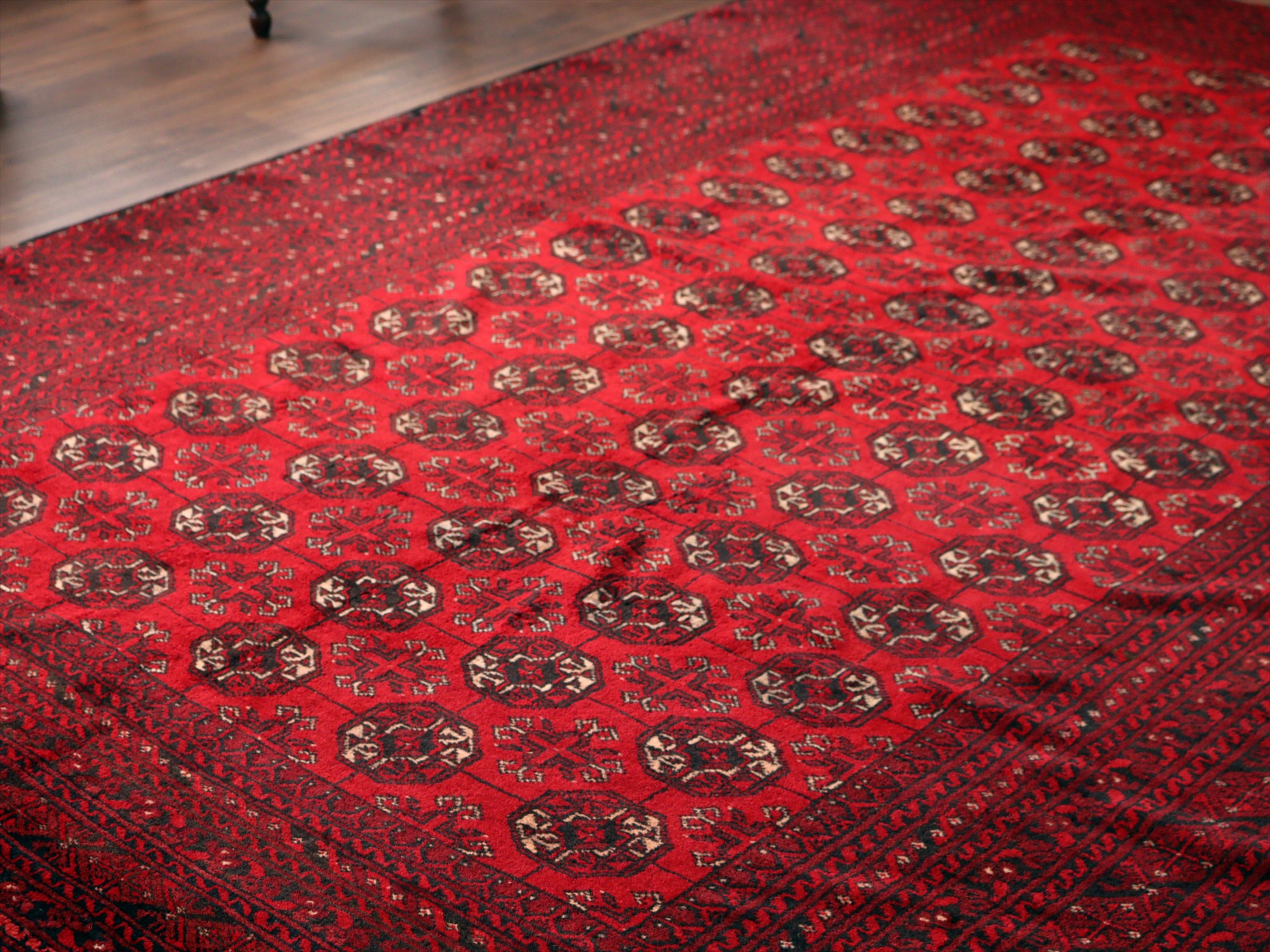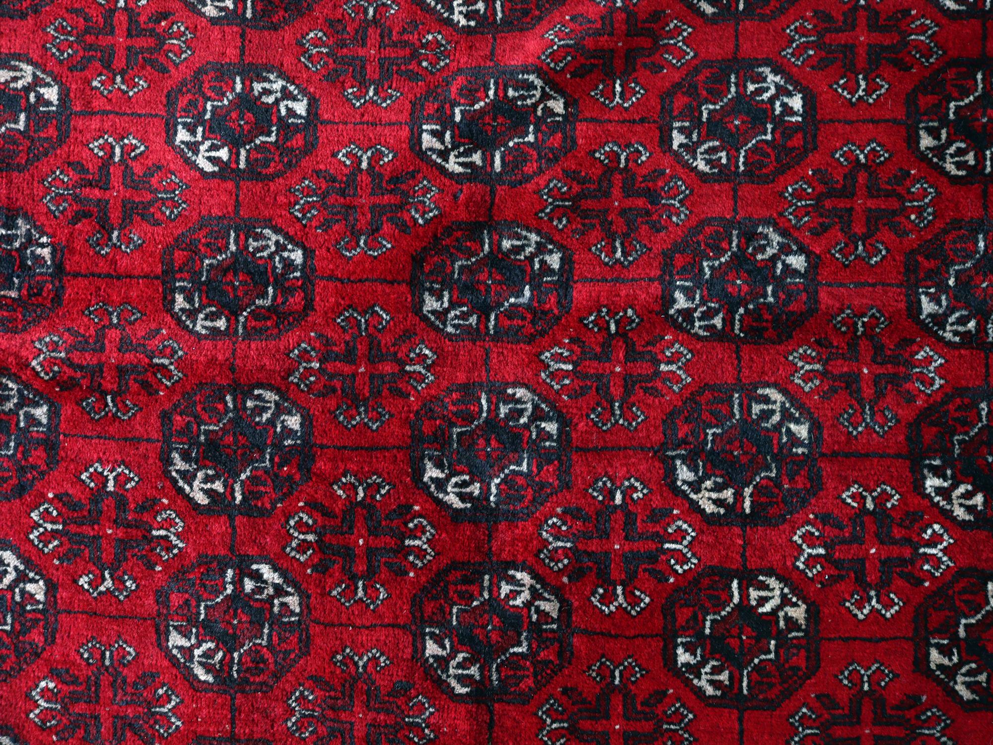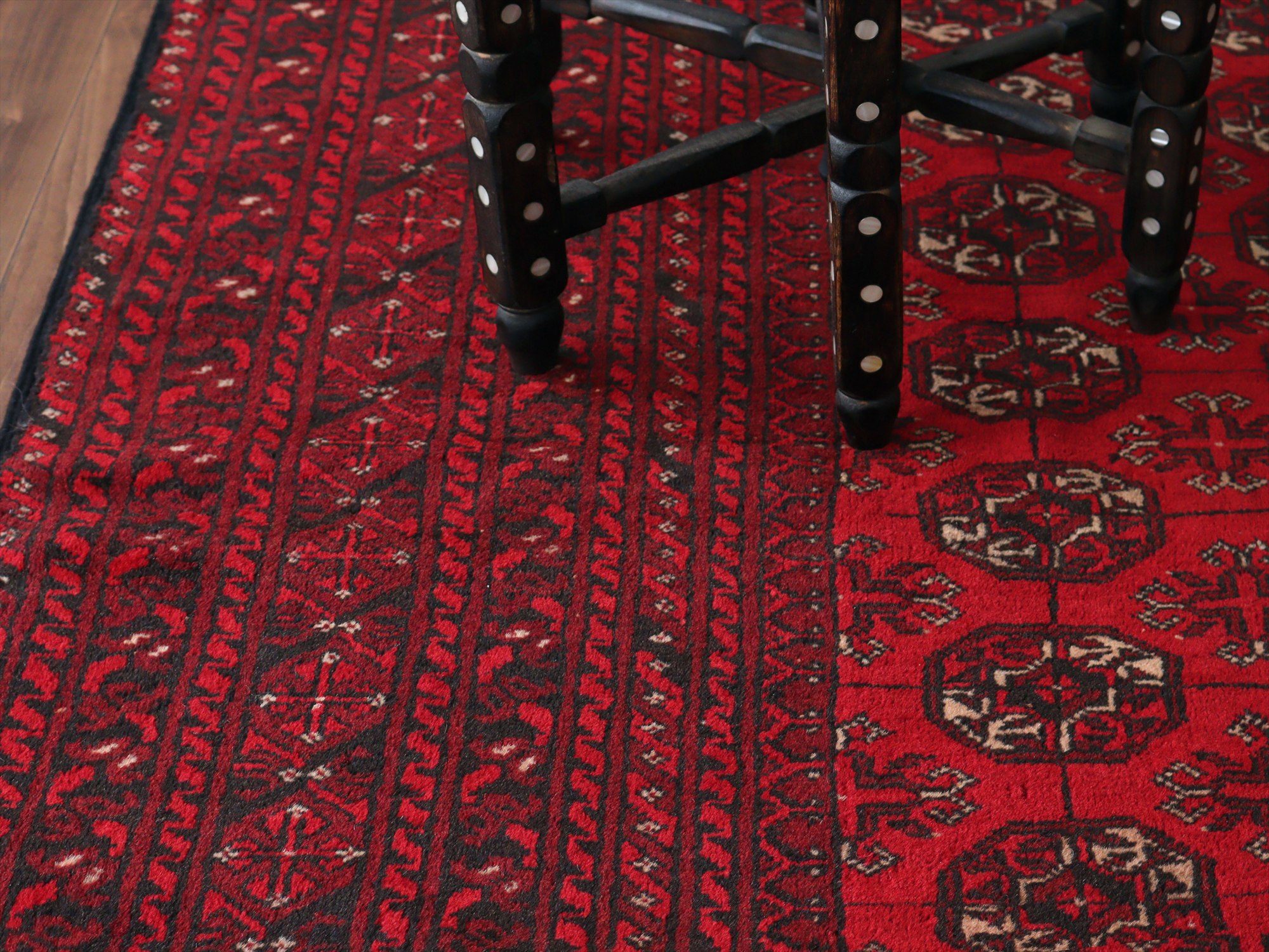 トーンの異なるレッドで織られた幾何学模様が連続するアフガン絨毯。クラシックで重厚感のある佇まいが、お部屋を落ち着いた雰囲気に。