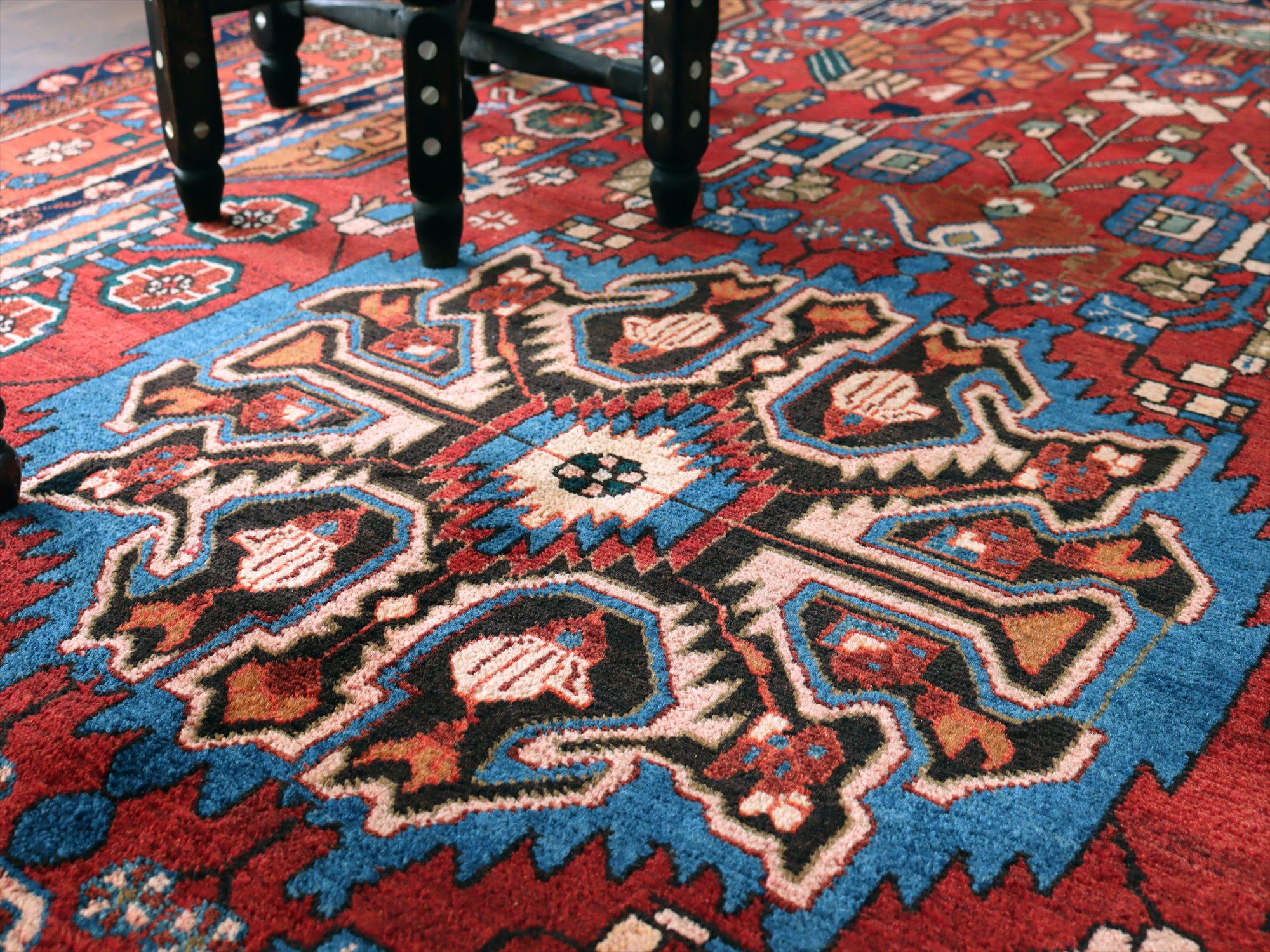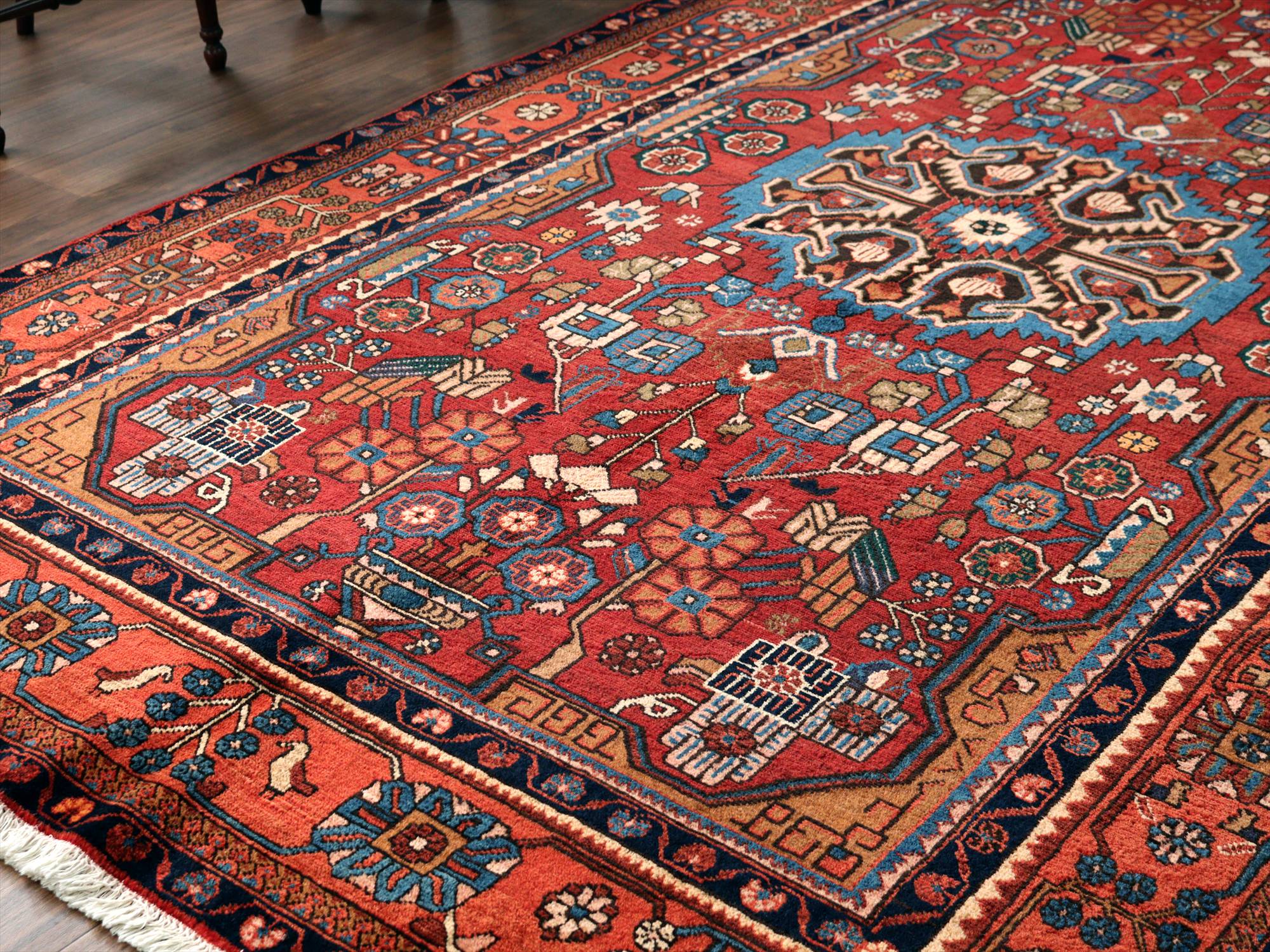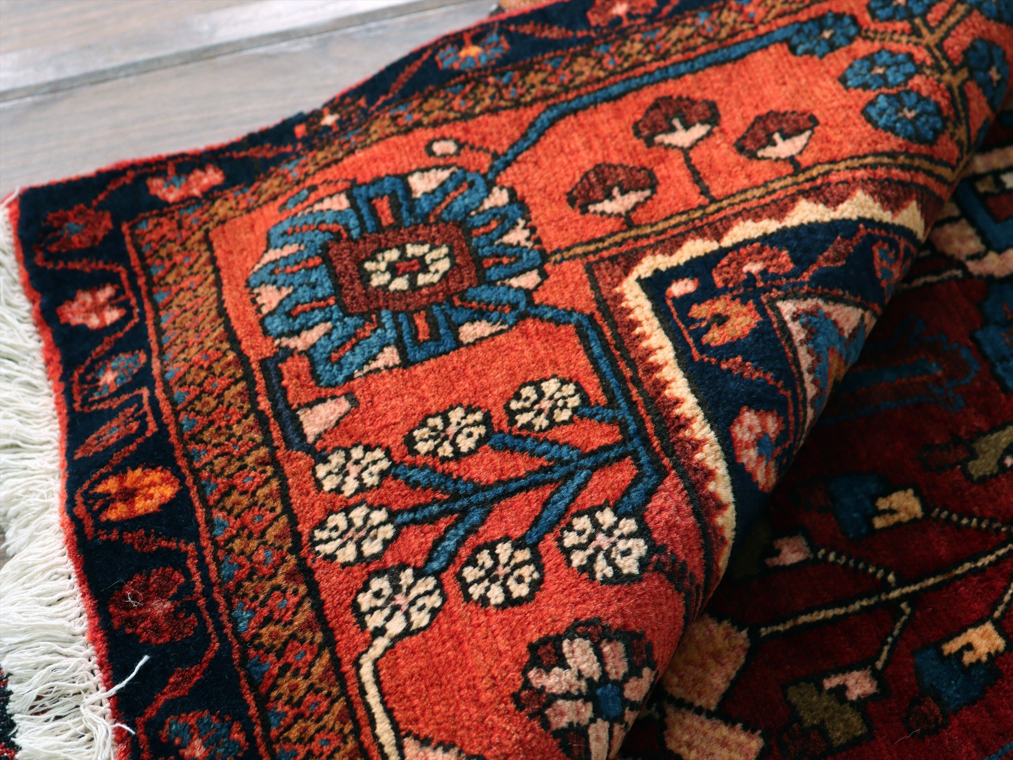 イラン西部、ハマダンの北に位置するナハバンドの絨毯です。デザインの多くが花で構成されていて、力強い色使いながらも華やかな雰囲気の絨毯です。また、目立たない程度に、さりげなく小鳥が織られているのもかわいらしく目を引きます。