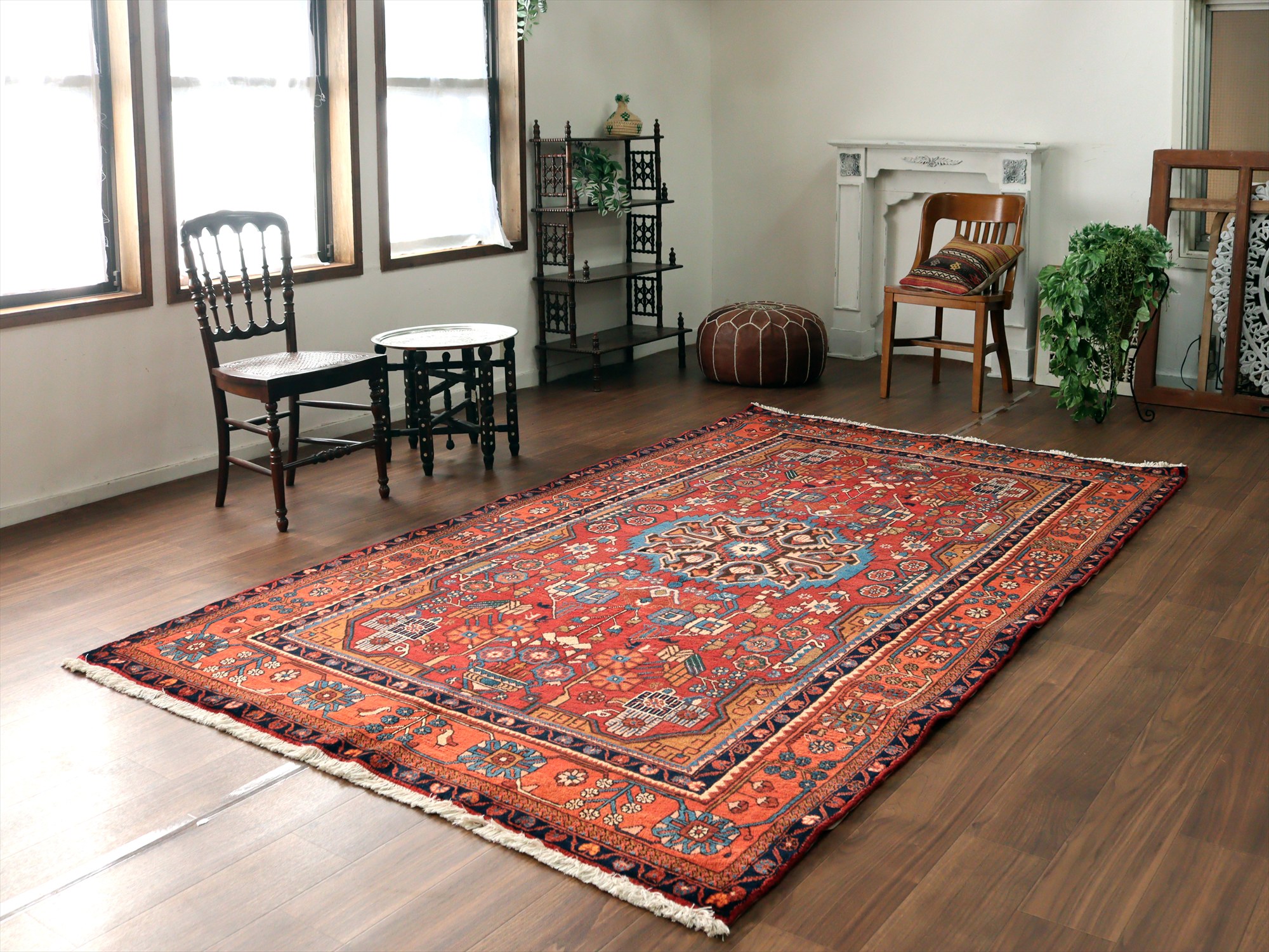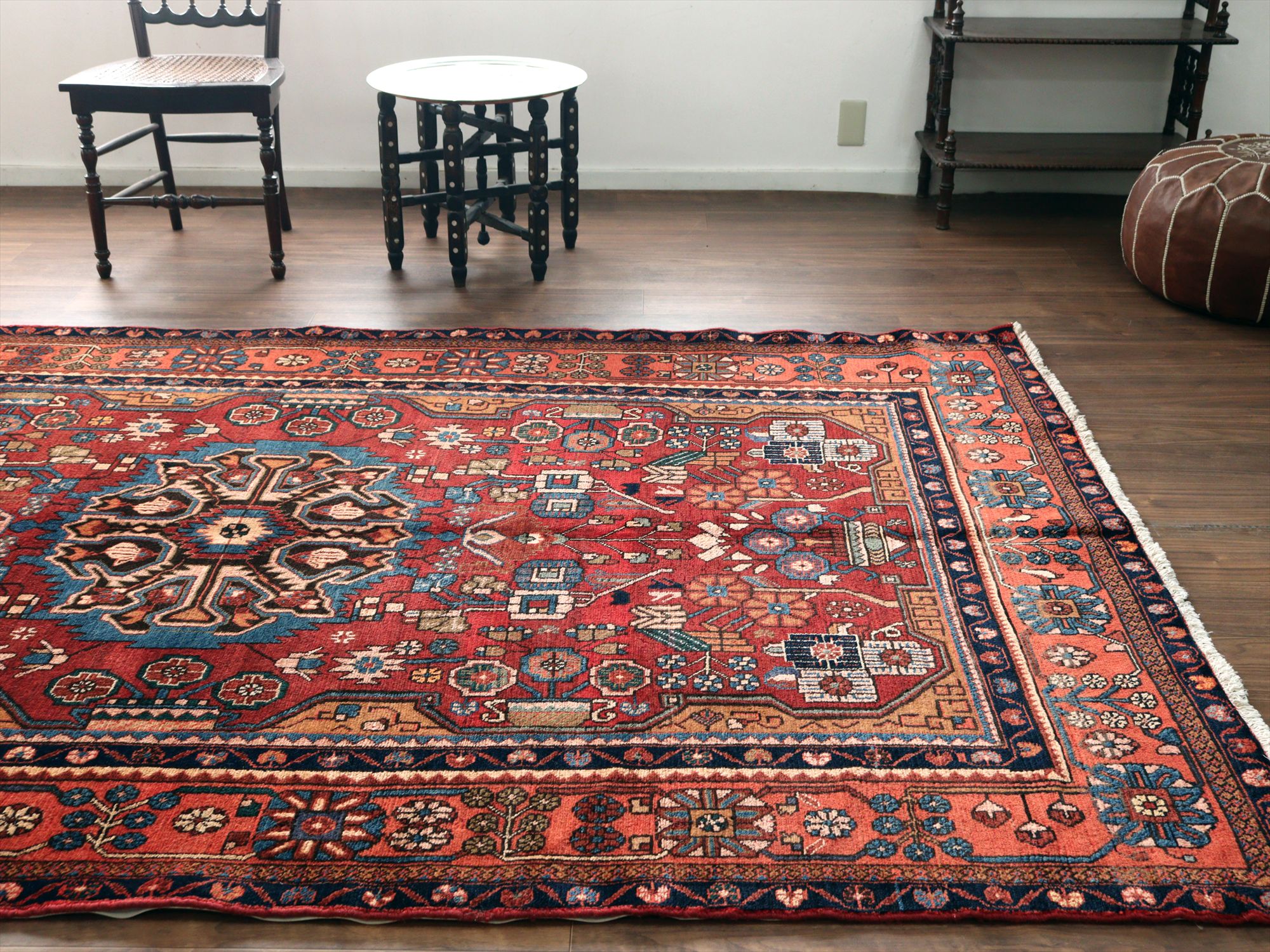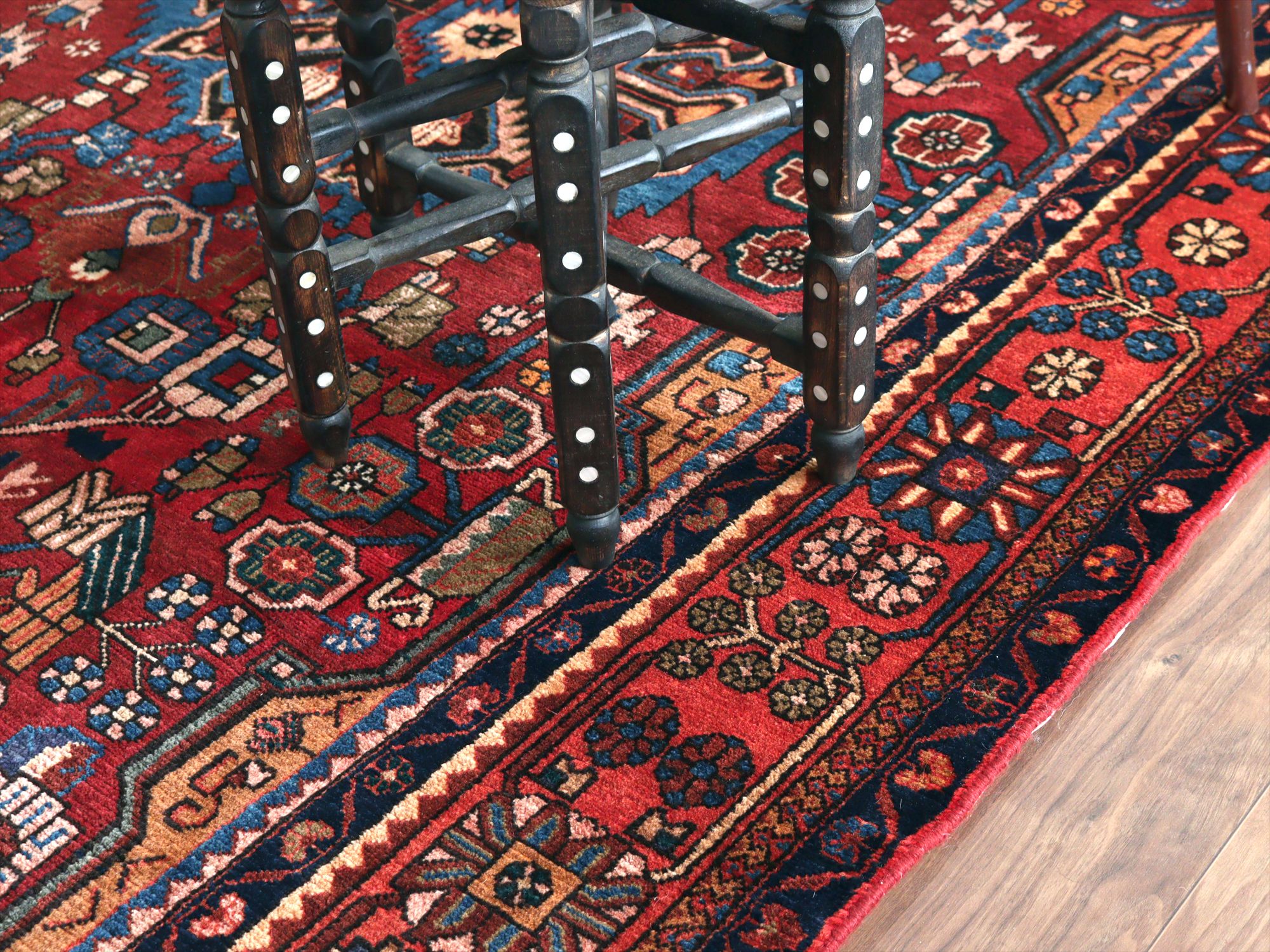 イラン西部、ハマダンの北に位置するナハバンドの絨毯です。デザインの多くが花で構成されていて、力強い色使いながらも華やかな雰囲気の絨毯です。また、目立たない程度に、さりげなく小鳥が織られているのもかわいらしく目を引きます。