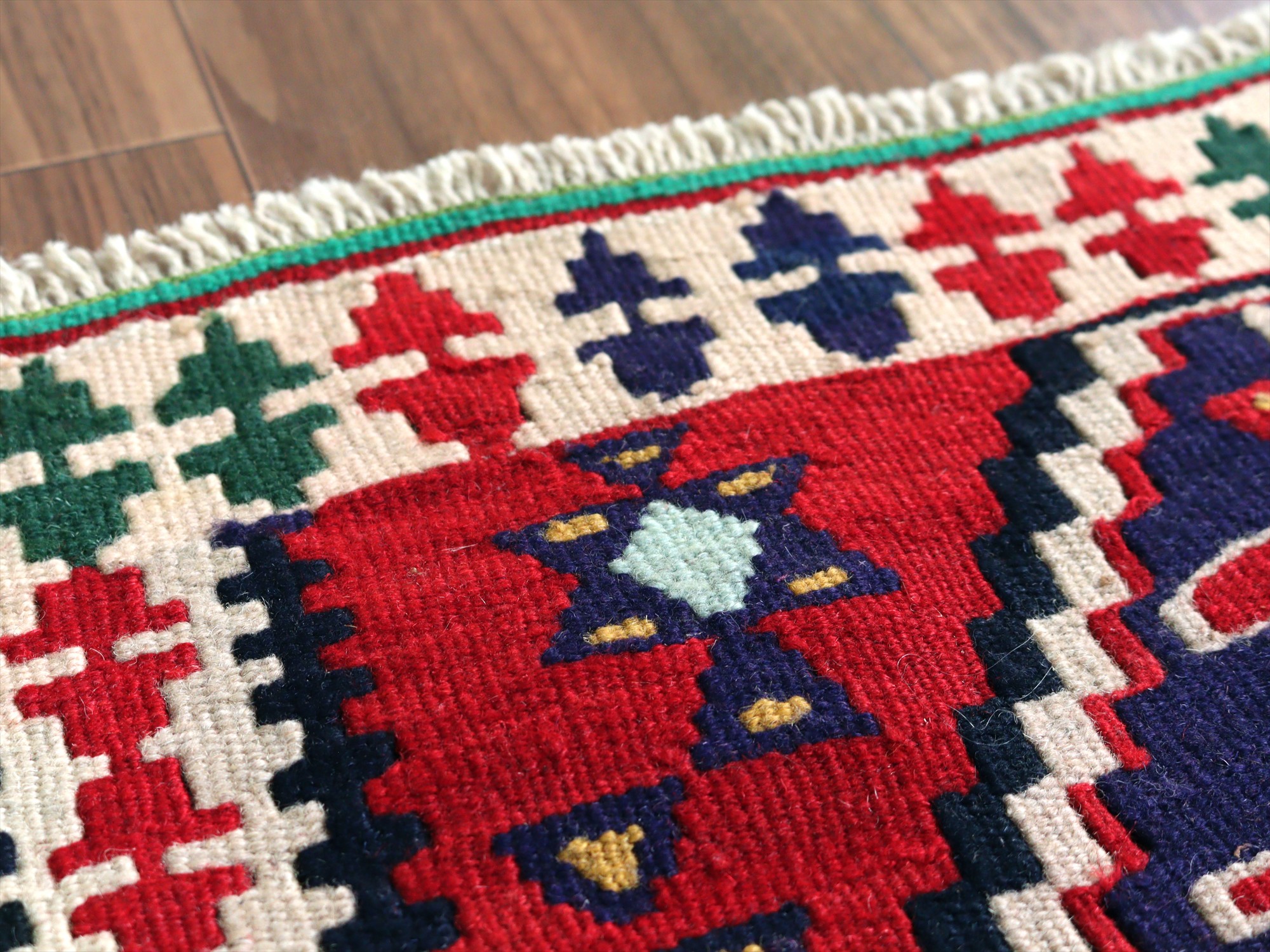 レッドとネイビーを基調とした色使いで、六角のメダリオンが織られています。細かい織りで、ベージュの額縁部分にも幾何学模様が色を変えながら織られています。