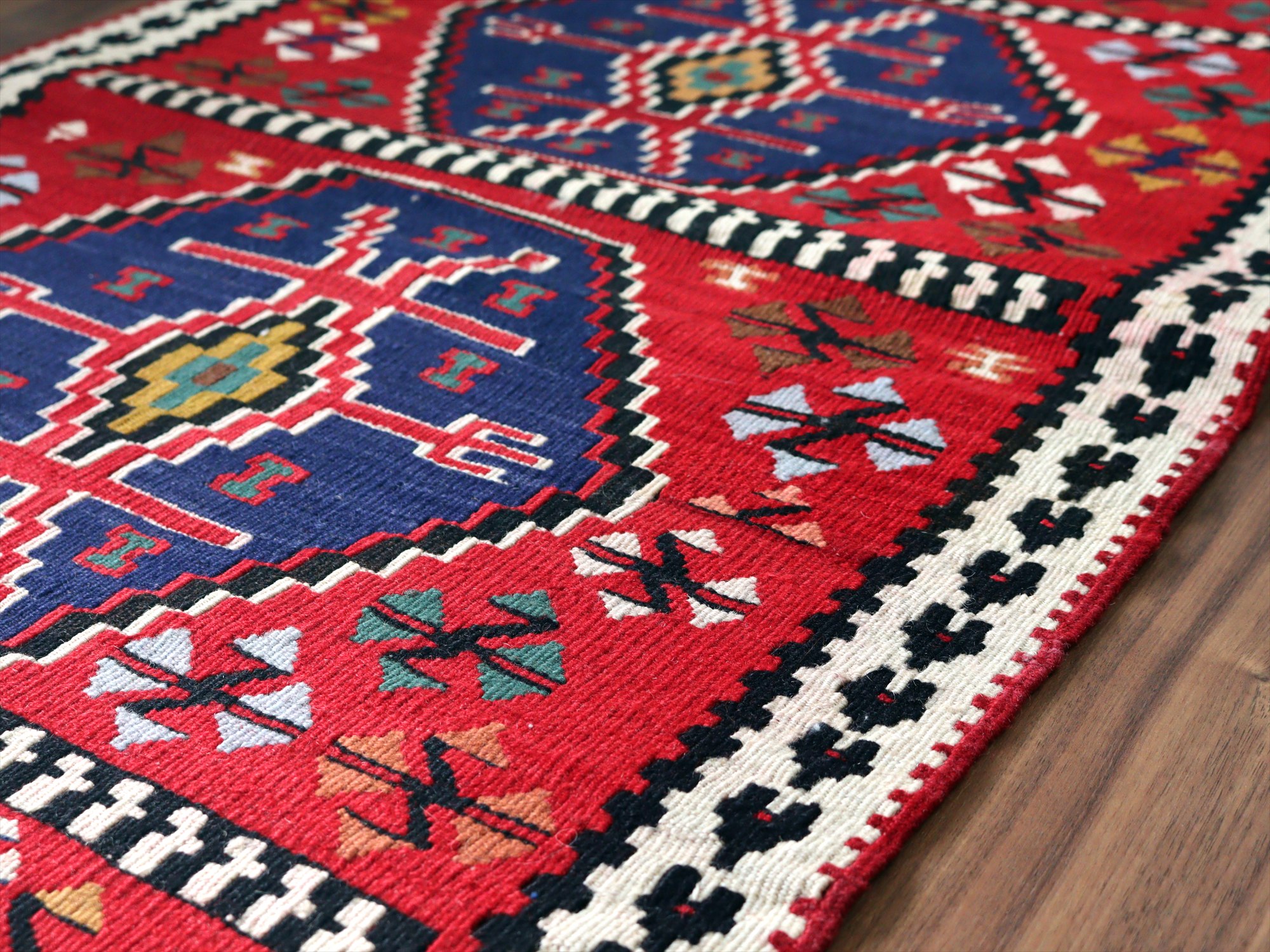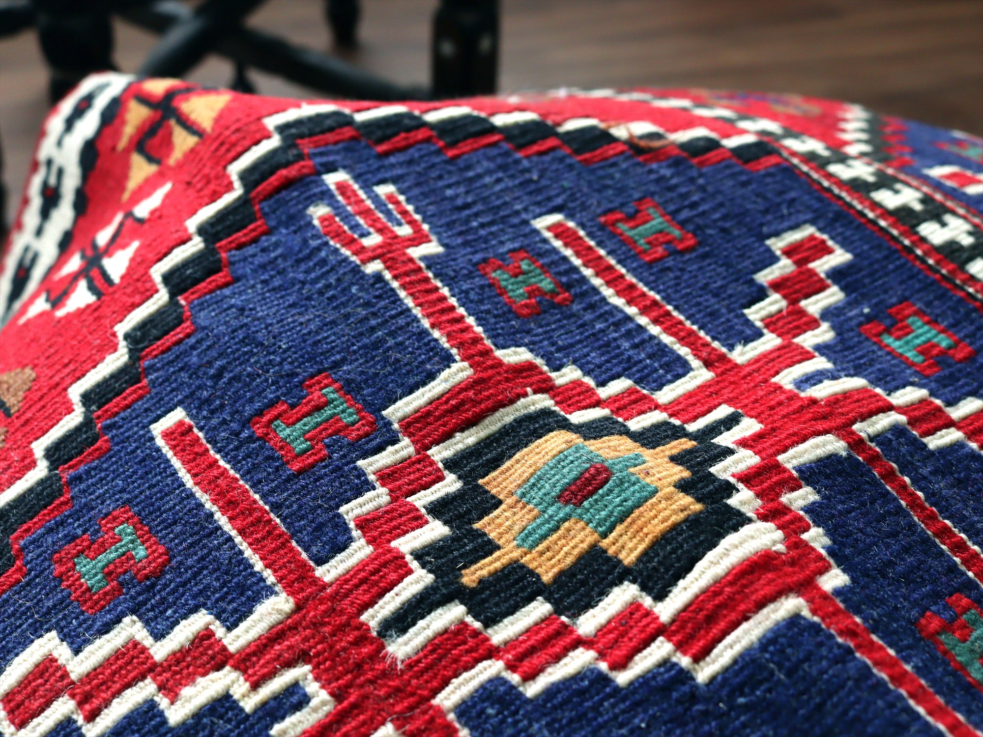 レッドとネイビーを基調とした色使いで、六角のメダリオンが織られています。細かい織りで、ベージュの額縁部分にも幾何学模様が色を変えながら織られています。