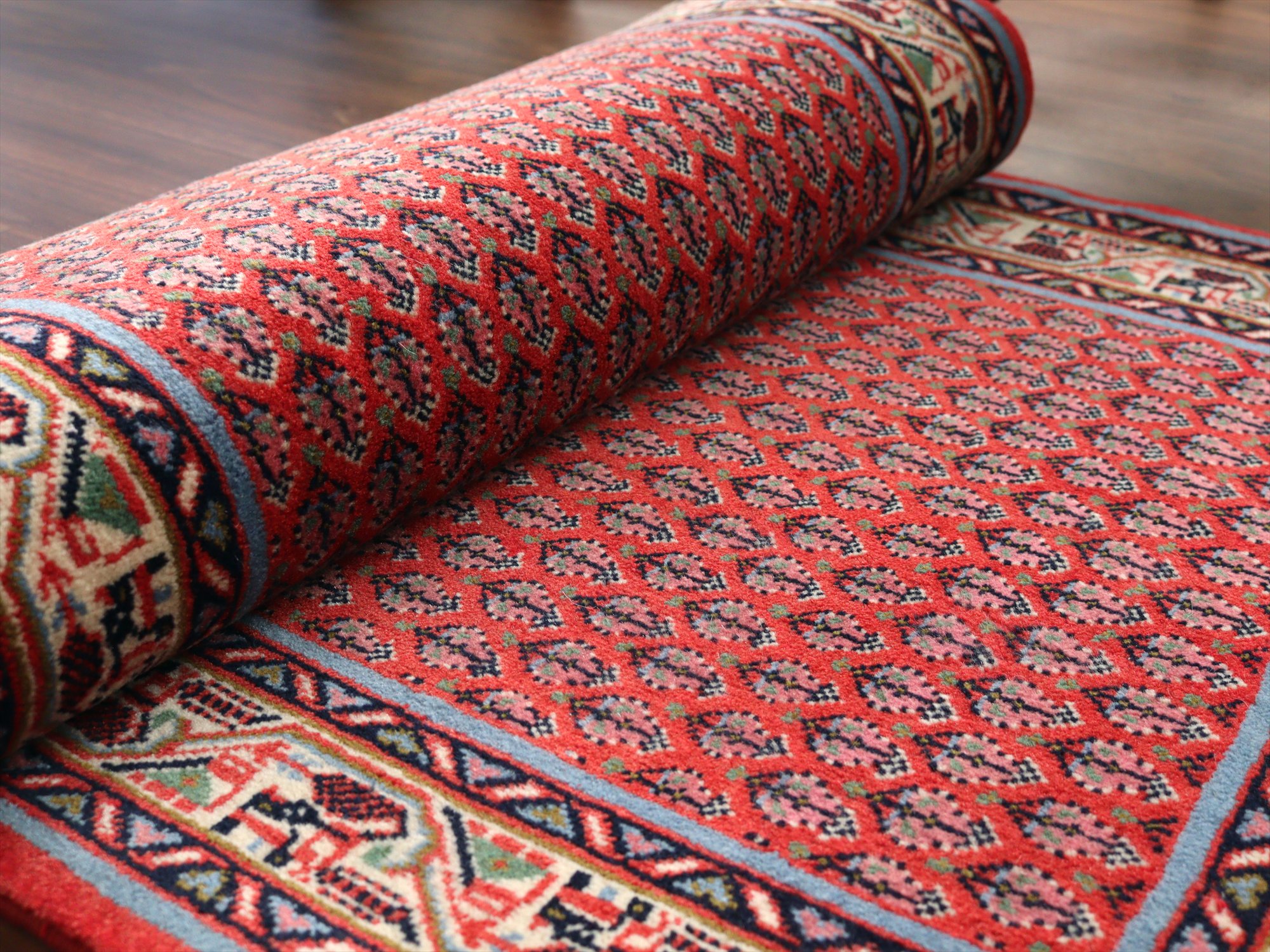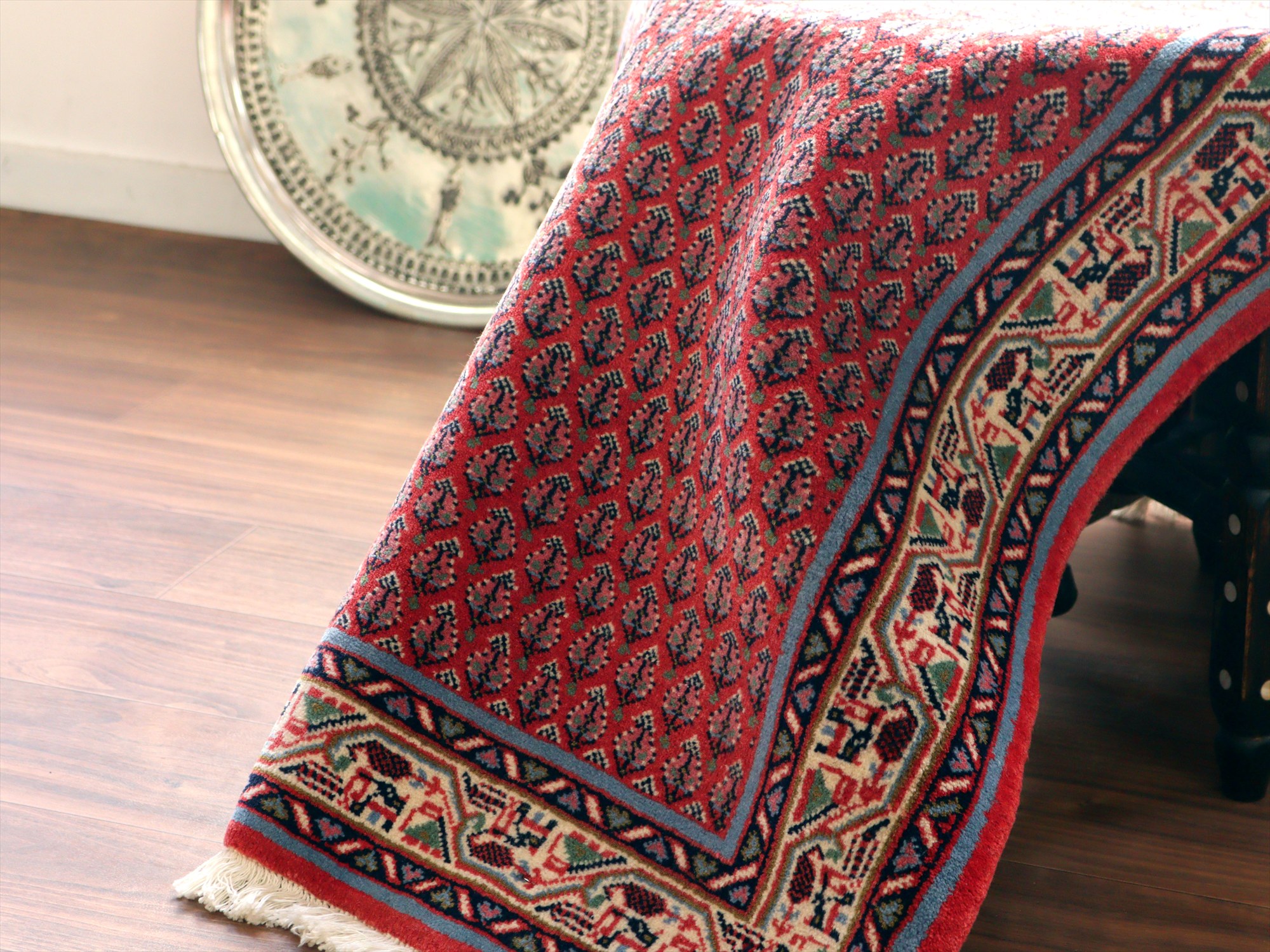 - イランの手織りラグ サルーク131×59cm ボテ ペイズリーのモチーフ レッド