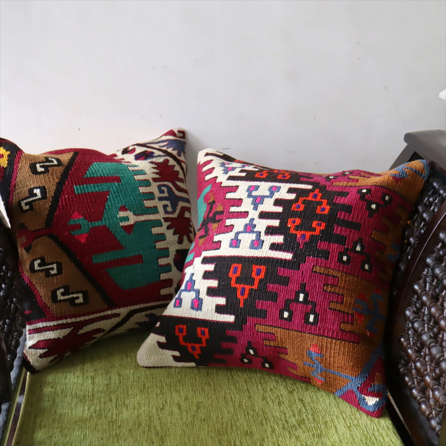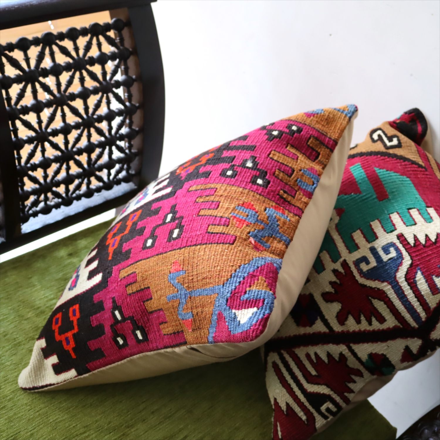 クッションカバーにすると、一枚のキリムから50枚以上に切り分けられるものもあり、配色が似ていてモチーフのバランスが違うクッションができあがります。