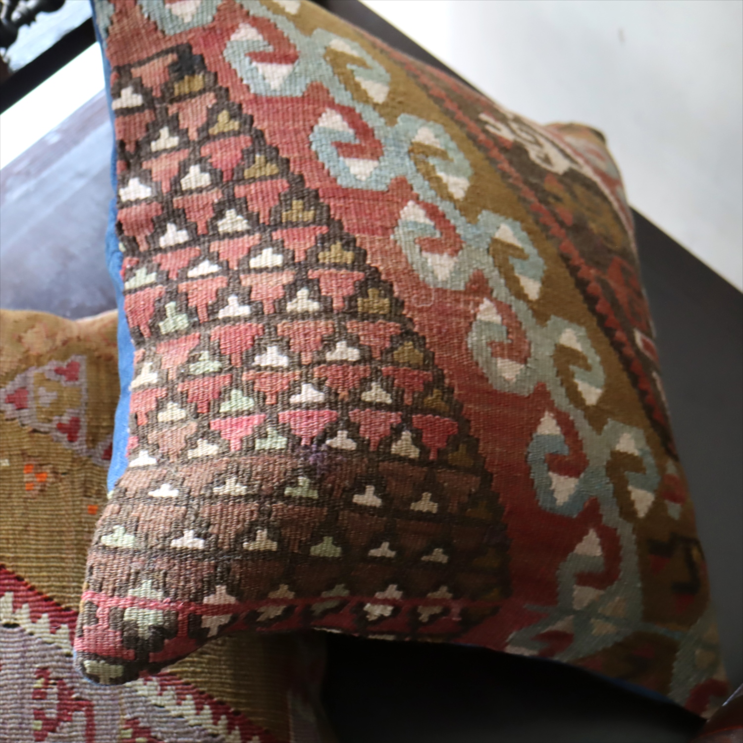 細い糸を使って織られた大型の平織りキリムをカットして作ったクッションカバーです。表面はウールのヴィンテージキリム、裏面は無地のコットン地です。