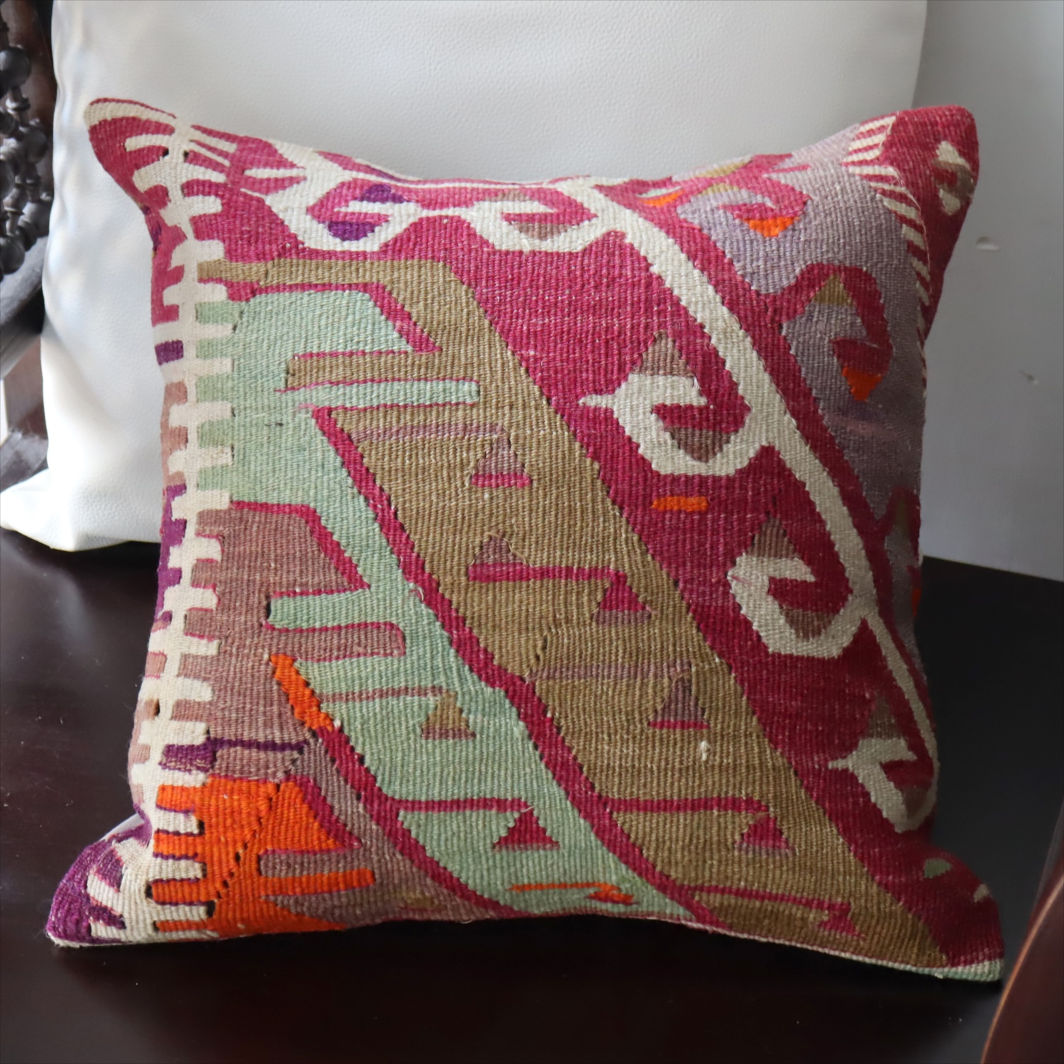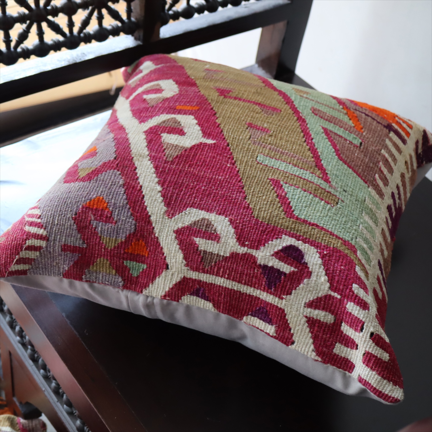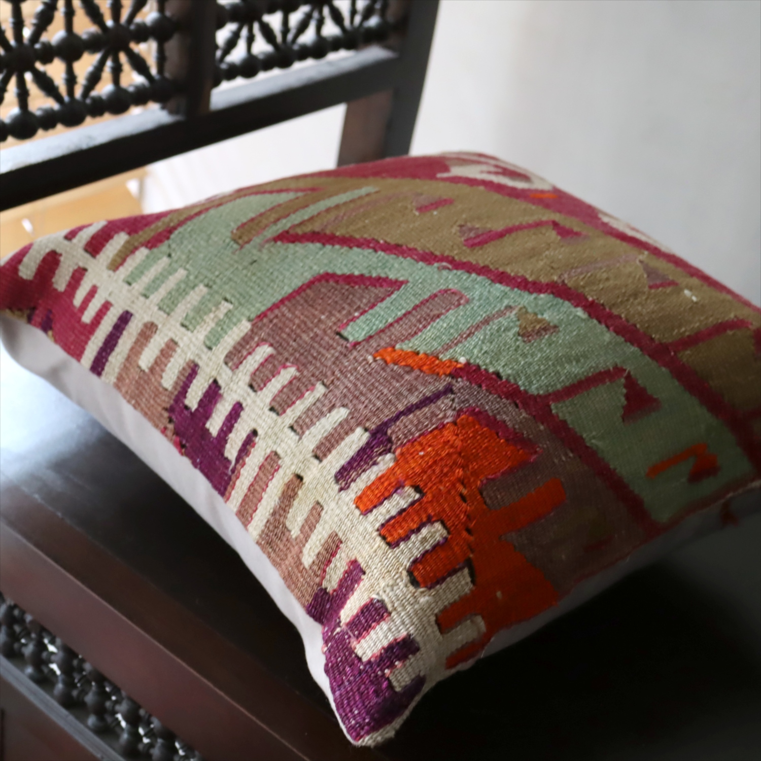 Key:Old Kilim, Kilim Cushion, Turkish Kilim, BOHO, Bohemian Decor, Vintage kilim, クッションカバー, オールドキリム, トルコ, ヴィンテージキリム, トライバルラグ, ピロー, ボヘミアンスタイル, BO-HO, ウール100%, 手織り, 一点もの, ガラタバザール