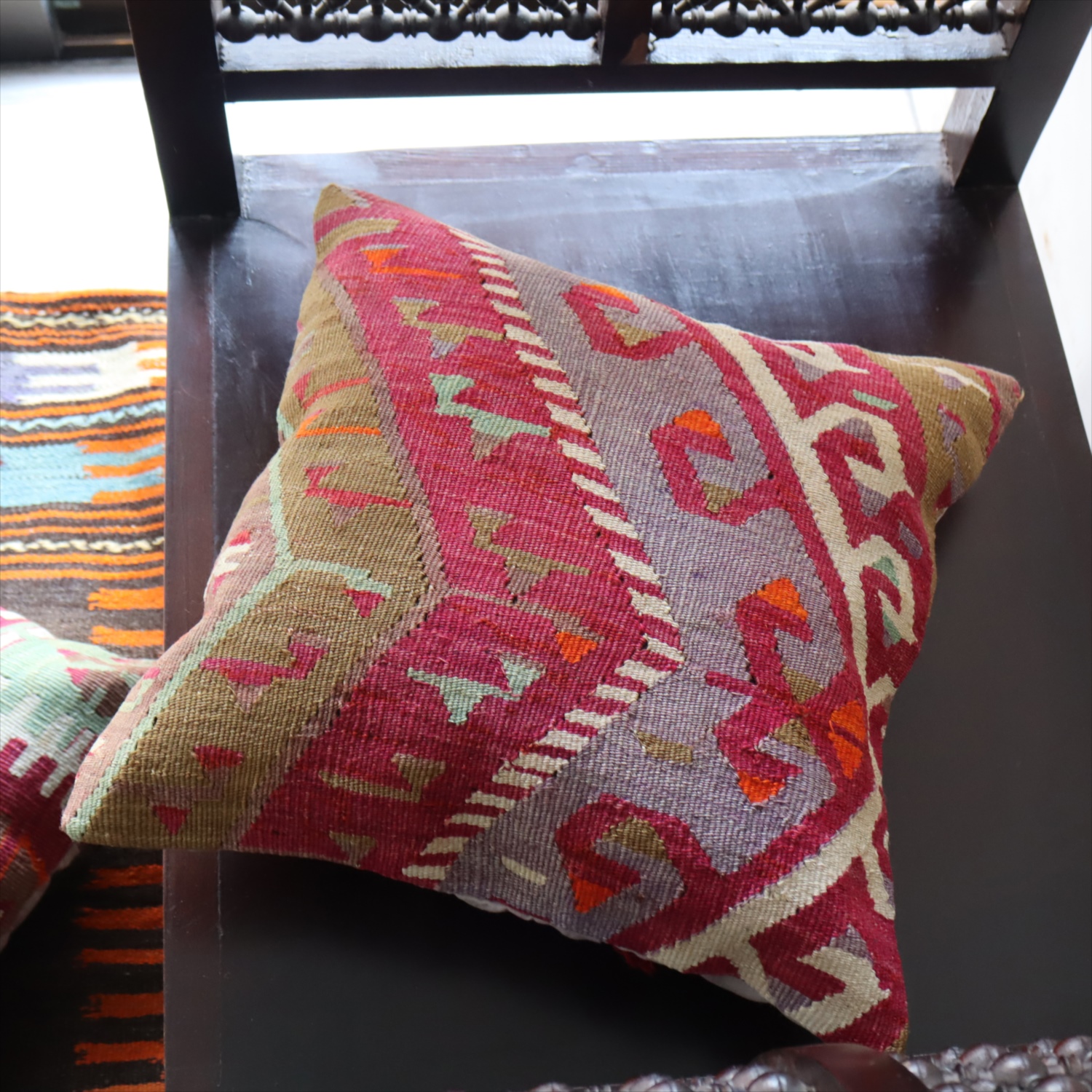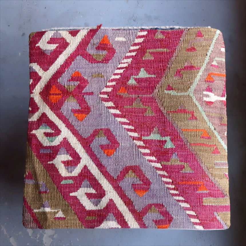 クッションカバーにすると、一枚のキリムから50枚以上に切り分けられるものもあり、配色が似ていてモチーフのバランスが違うクッションができあがります。