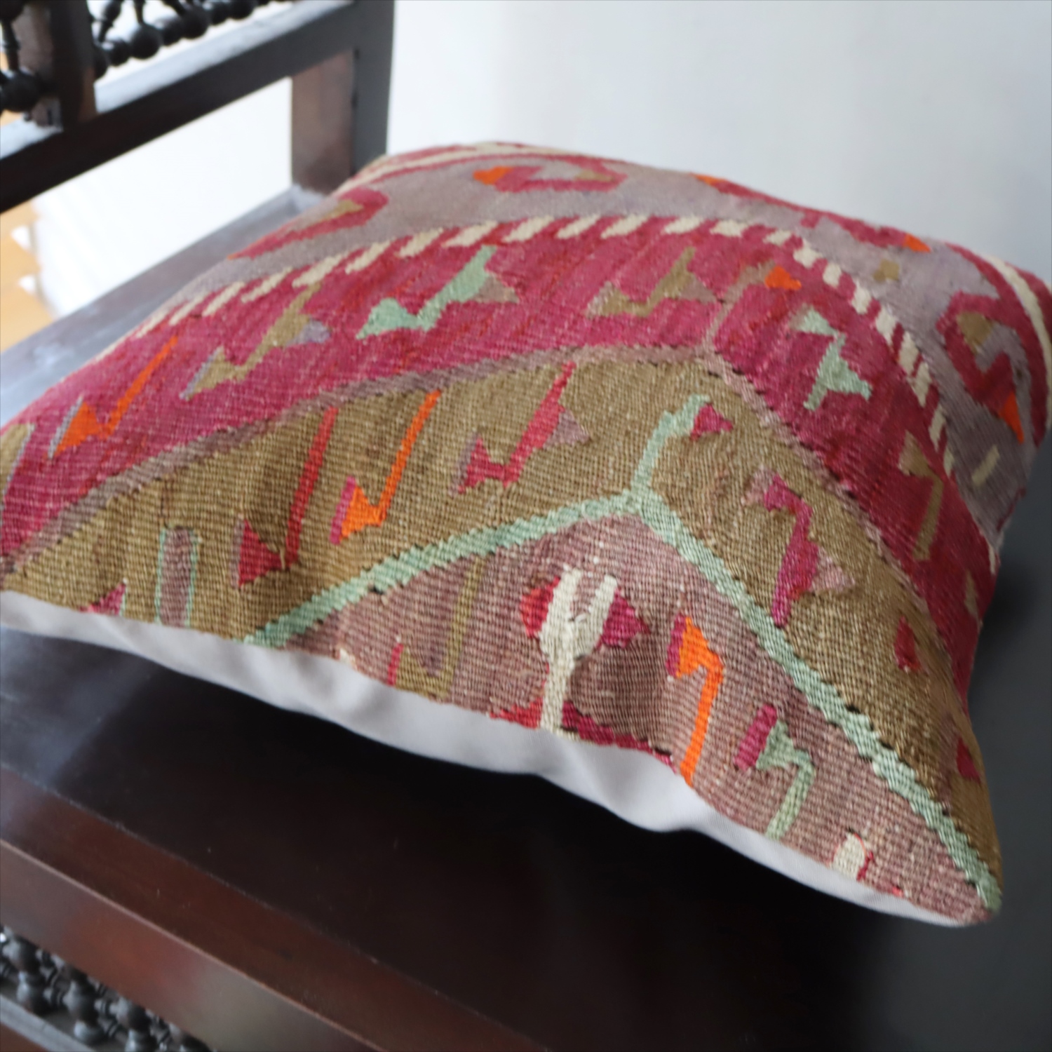 細い糸を使って織られた大型の平織りキリムをカットして作ったクッションカバーです。表面はウールのヴィンテージキリム、裏面は無地のコットン地です。