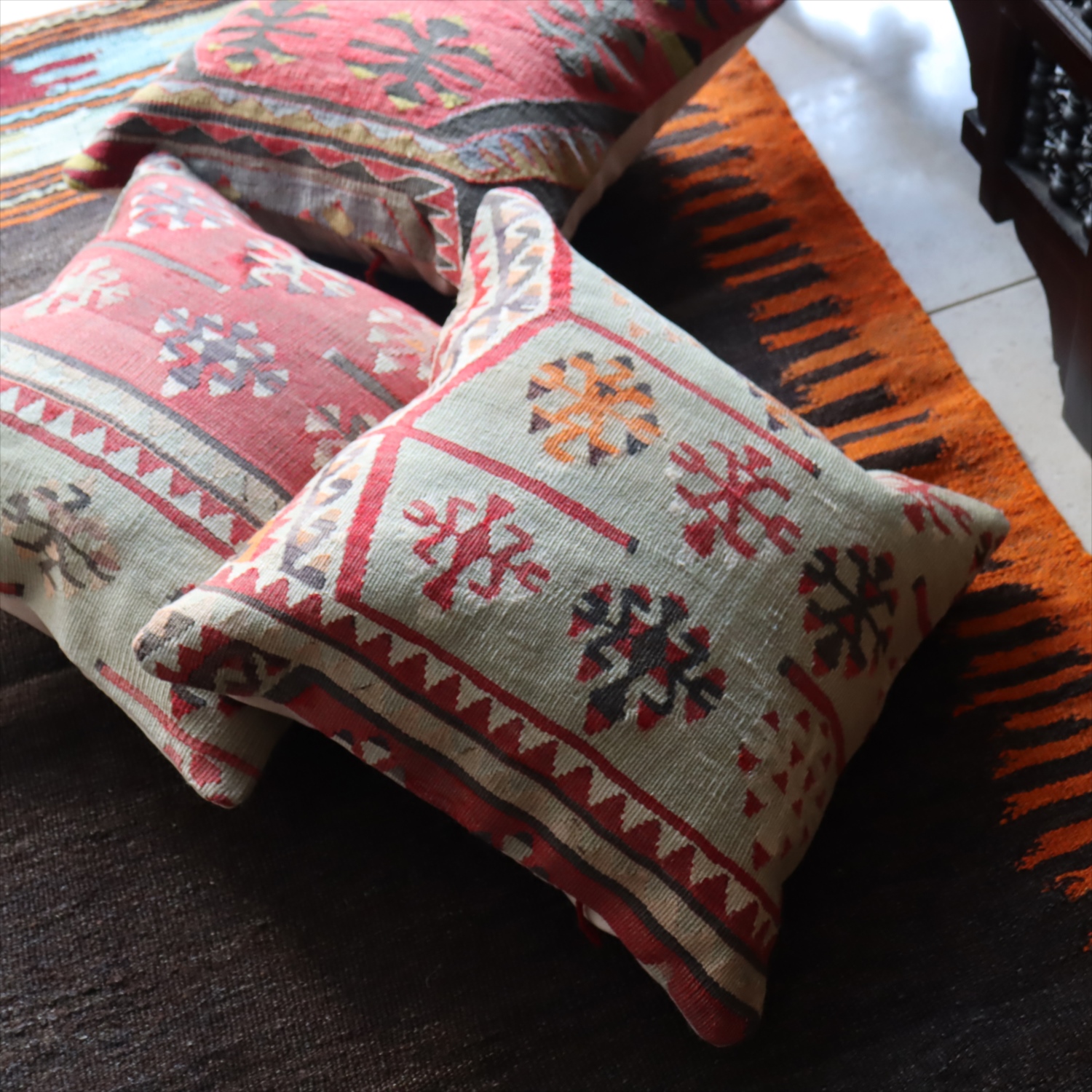 クッションカバーにすると、一枚のキリムから50枚以上に切り分けられるものもあり、配色が似ていてモチーフのバランスが違うクッションができあがります。
