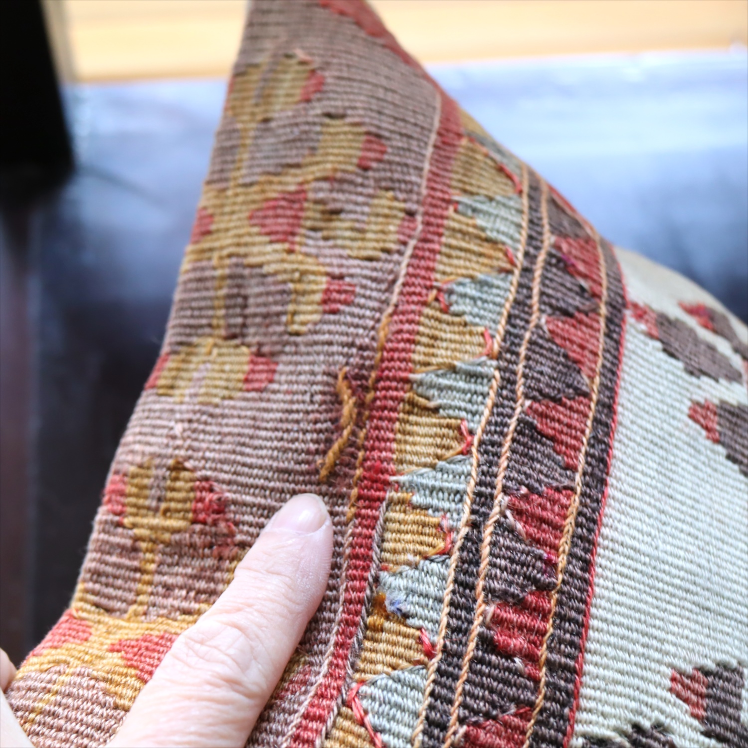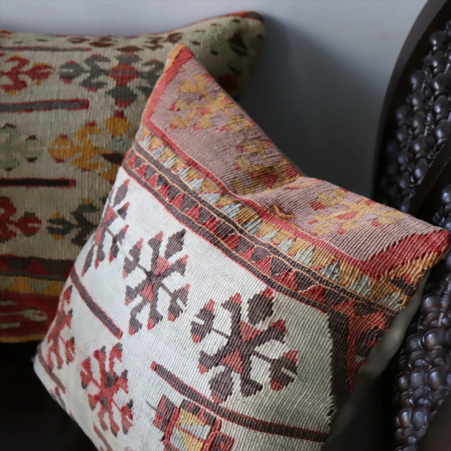 細い糸を使って織られた大型の平織りキリムをカットして作ったクッションカバーです。表面はウールのヴィンテージキリム、裏面は無地のコットン地です。