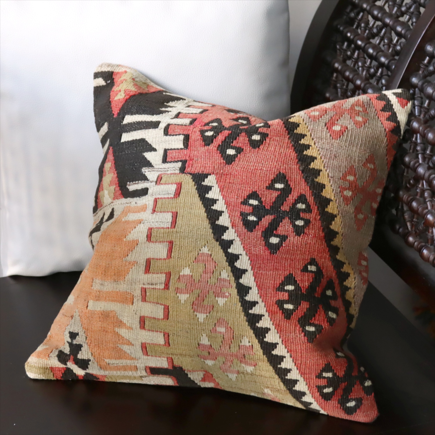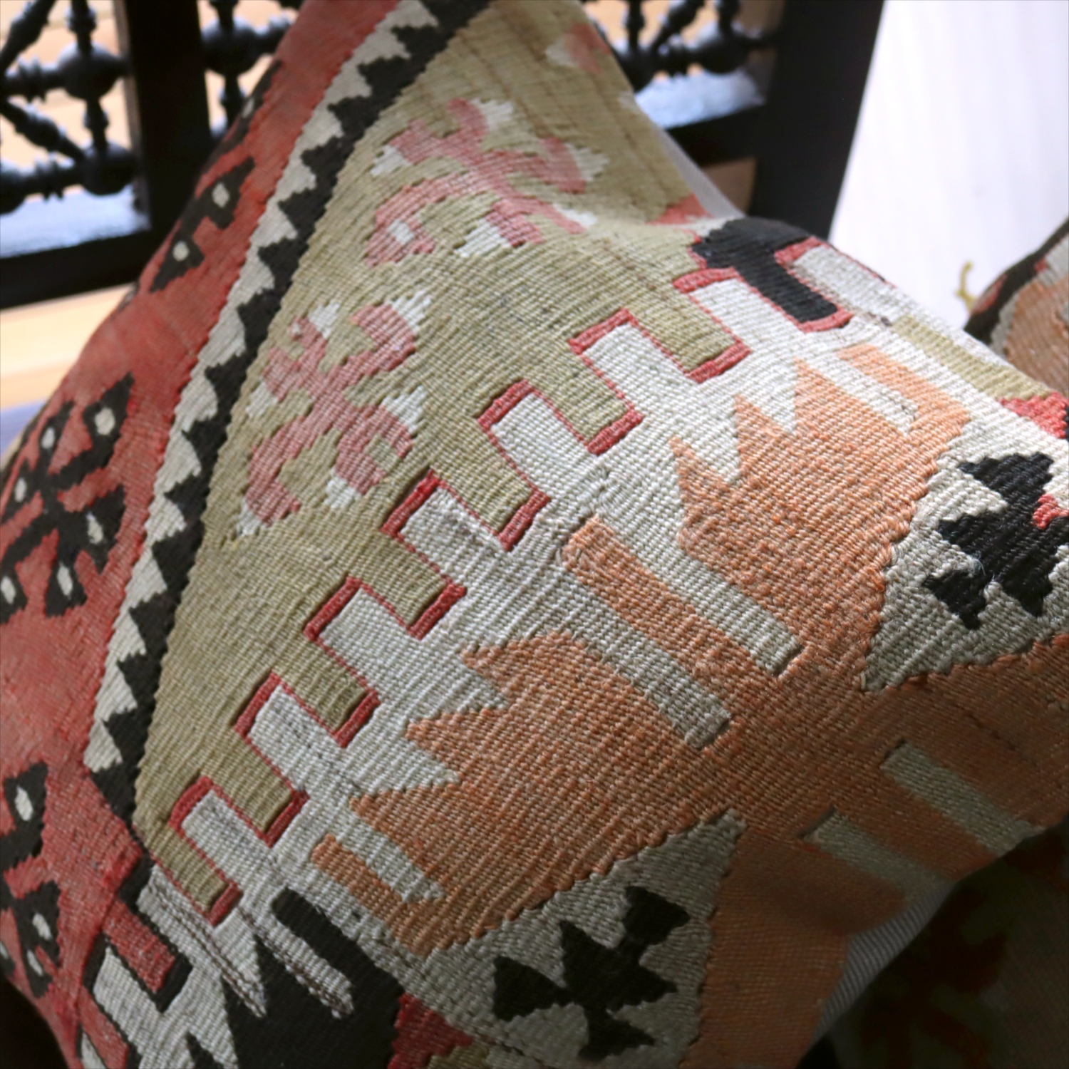 Key:Old Kilim, Kilim Cushion, Turkish Kilim, BOHO, Bohemian Decor, Vintage kilim, クッションカバー, オールドキリム, トルコ, ヴィンテージキリム, トライバルラグ, ピロー, ボヘミアンスタイル, BO-HO, ウール100%, 手織り, 一点もの, ガラタバザール