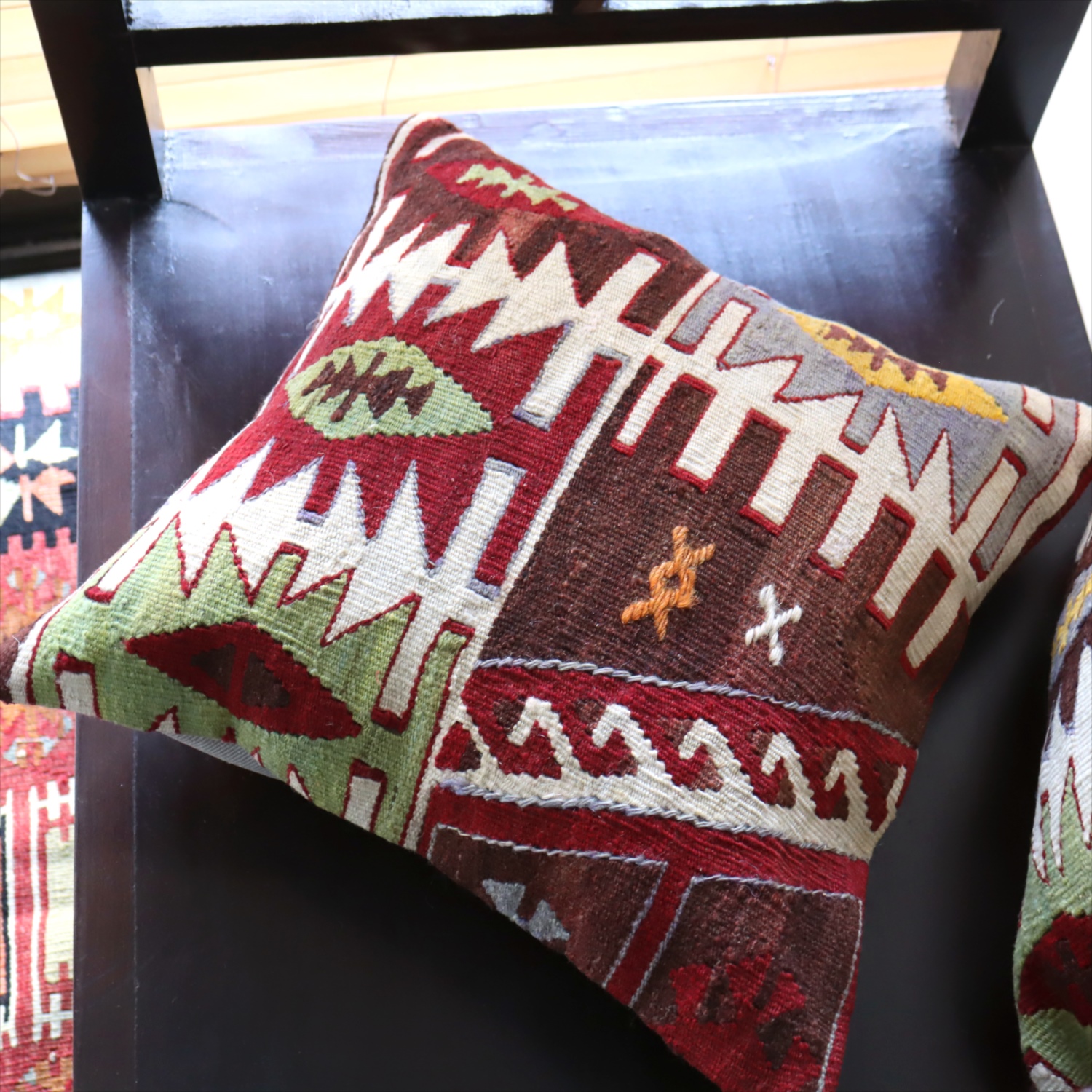 クッションカバーにすると、一枚のキリムから50枚以上に切り分けられるものもあり、配色が似ていてモチーフのバランスが違うクッションができあがります。