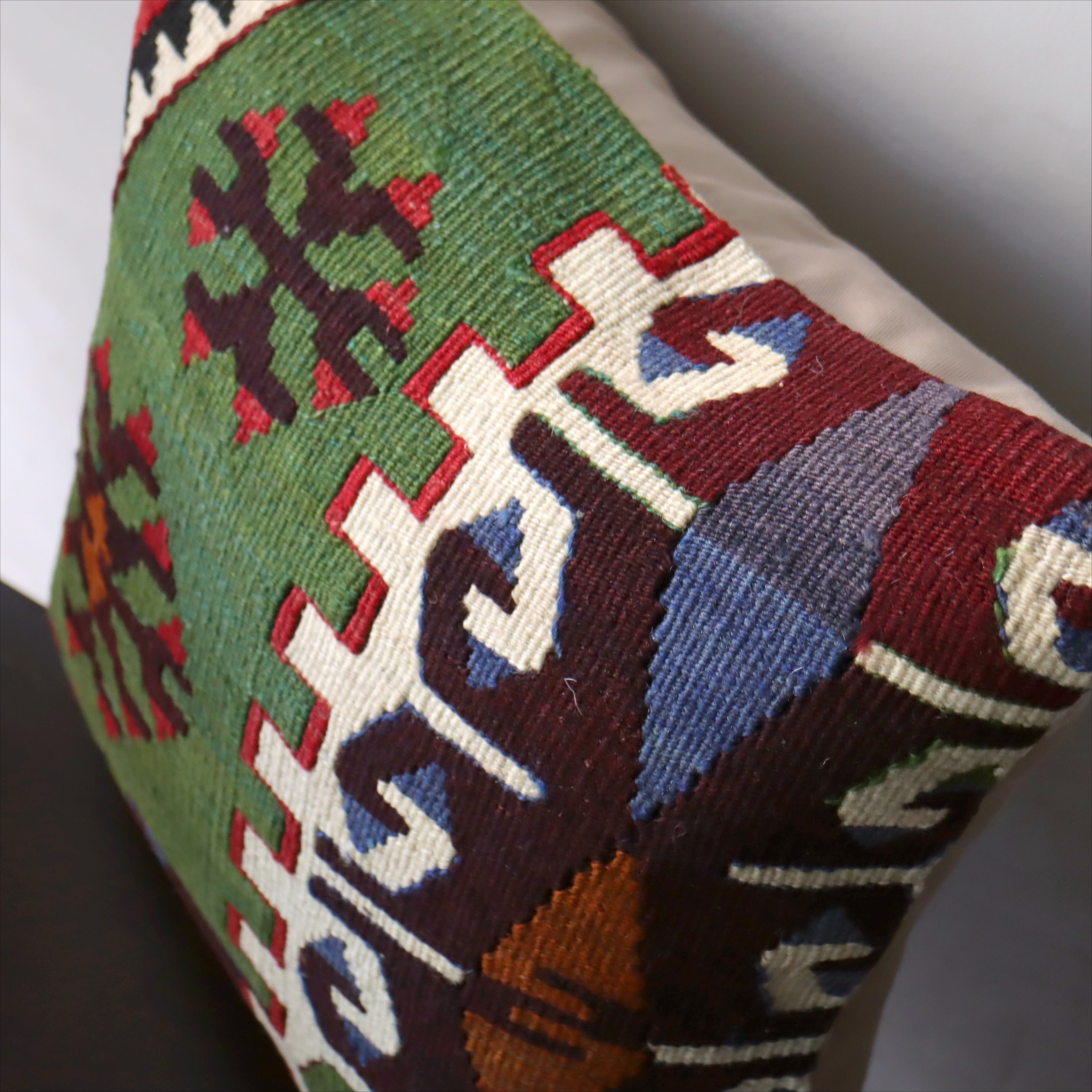 細い糸を使って織られた大型の平織りキリムをカットして作ったクッションカバーです。表面はウールのヴィンテージキリム、裏面は無地のコットン地です。