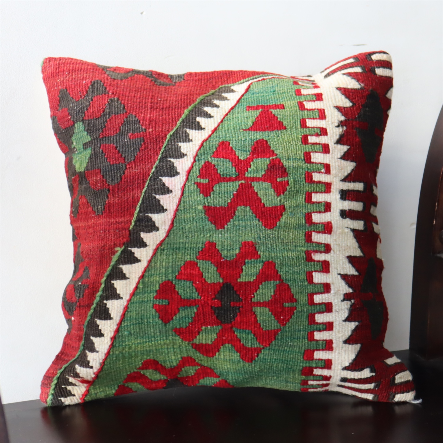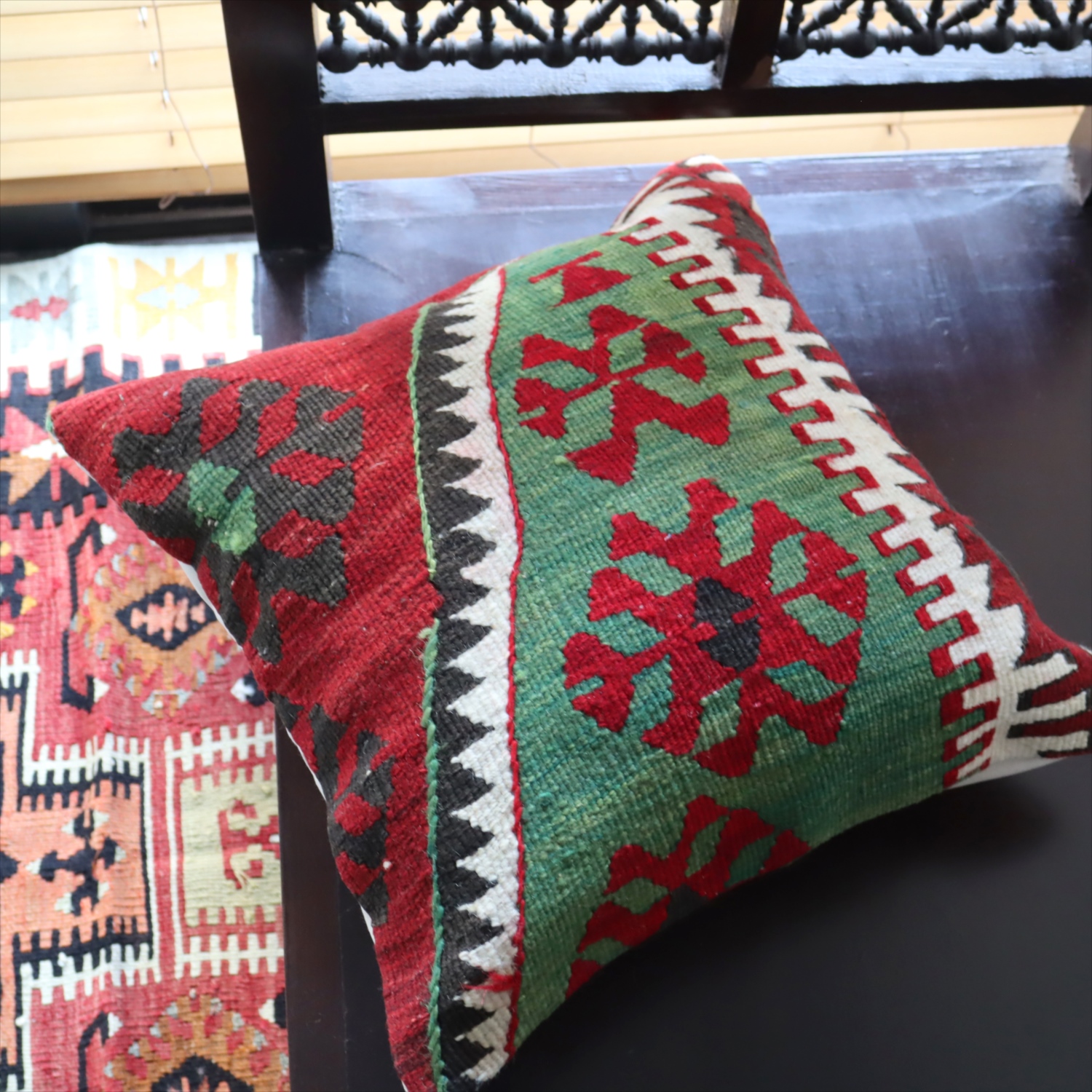 20世紀中頃に、アナトリア(トルコ)東部、マラテヤ地方またはシワス地方で織られたもので、年代は古いものの、大切に保管されており、織られた当時のままの鮮やかな色が残っています。グリーンの色はお部屋でクッションとしてお使いいただく間に、少しずつ褪色してやわらかな色に変化すると想像できます。