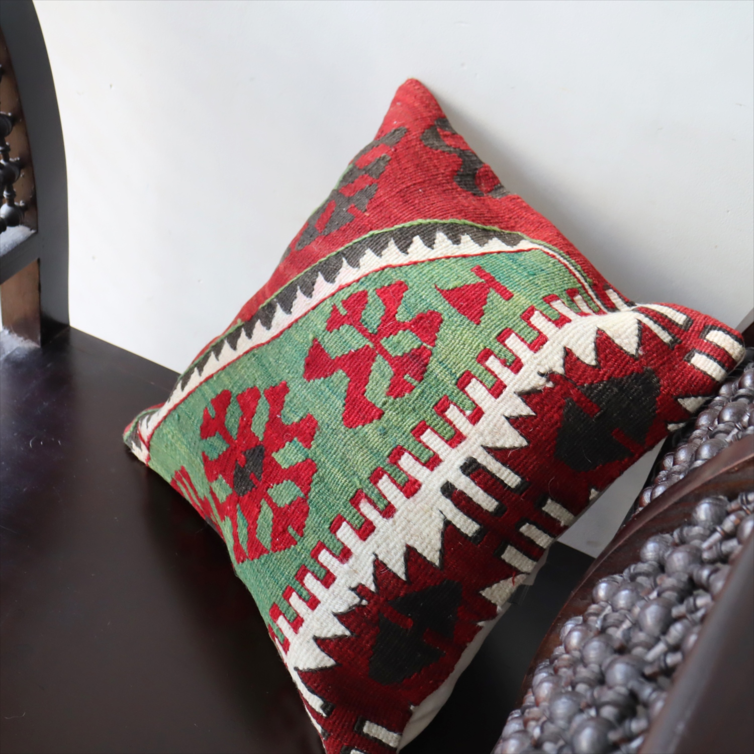 Key:Old Kilim, Kilim Cushion, Turkish Kilim, BOHO, Bohemian Decor, Vintage kilim, クッションカバー, オールドキリム, トルコ, ヴィンテージキリム, トライバルラグ, ピロー, ボヘミアンスタイル, BO-HO, ウール100%, 手織り, 一点もの, ガラタバザール