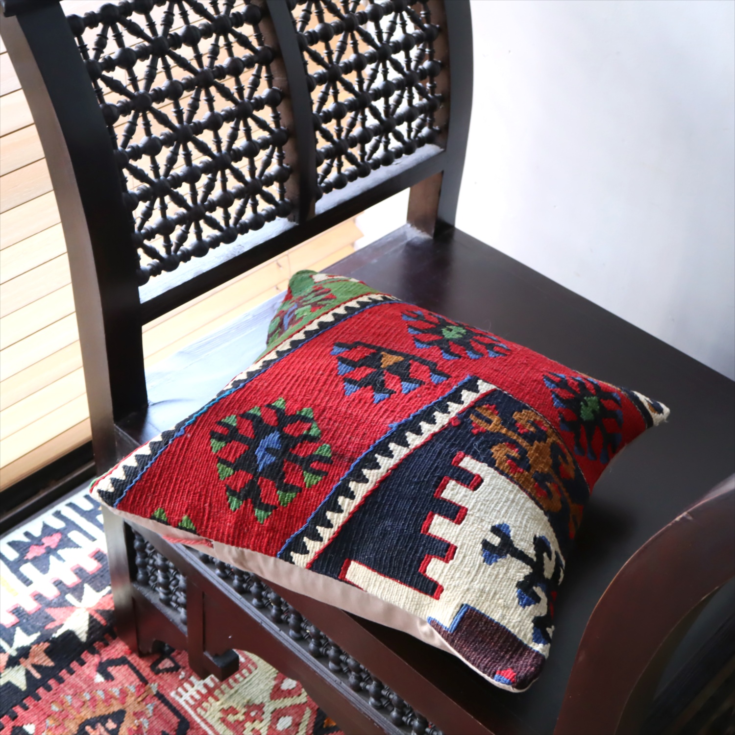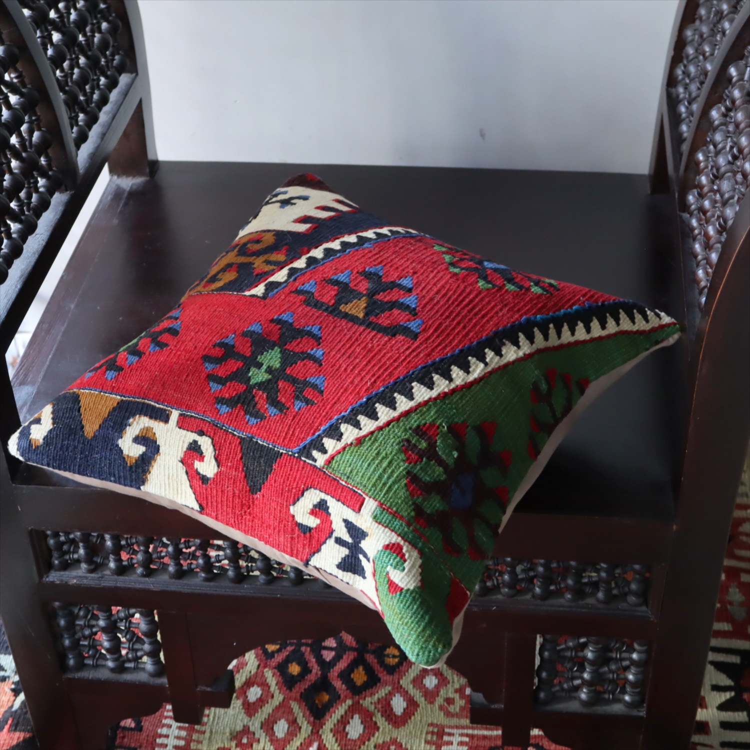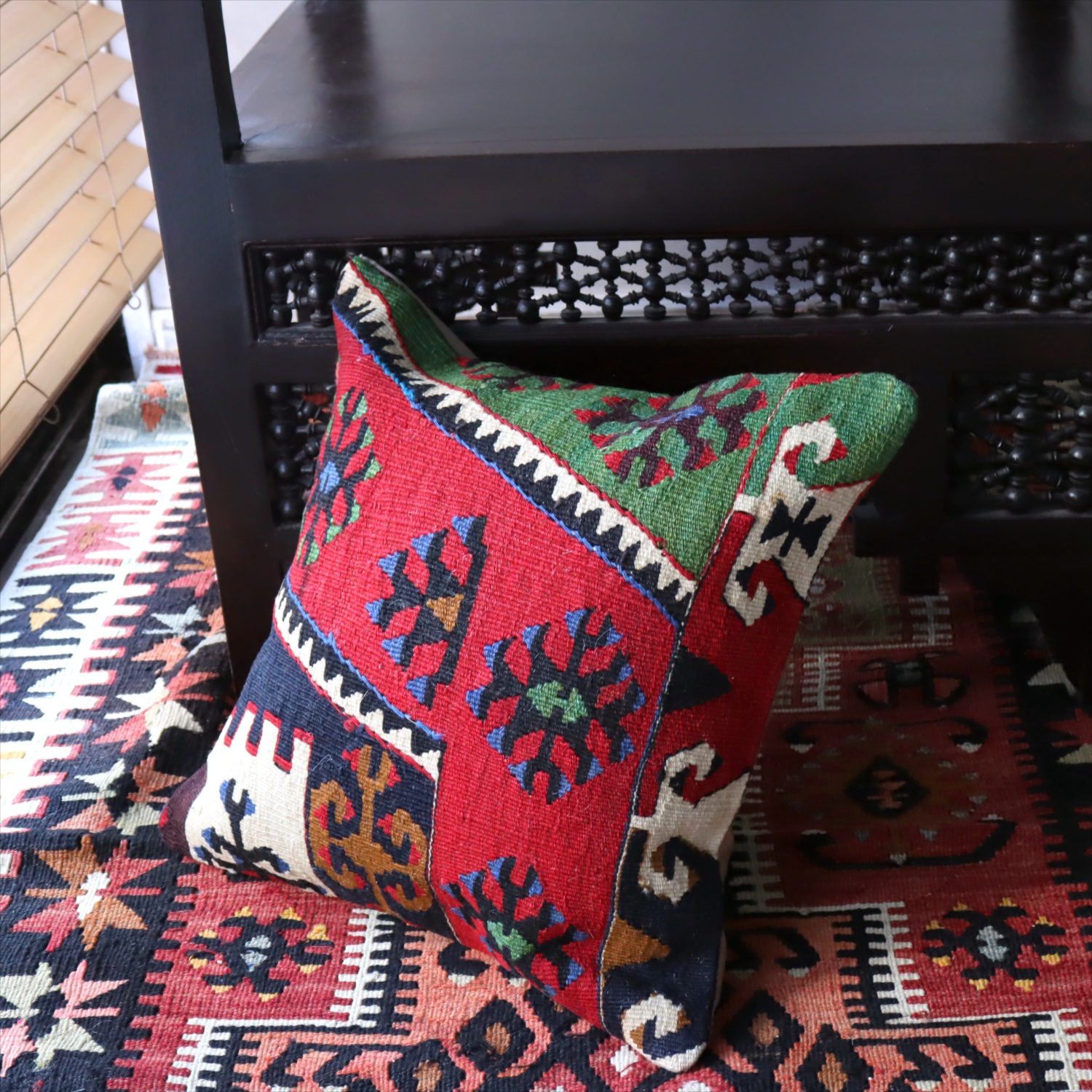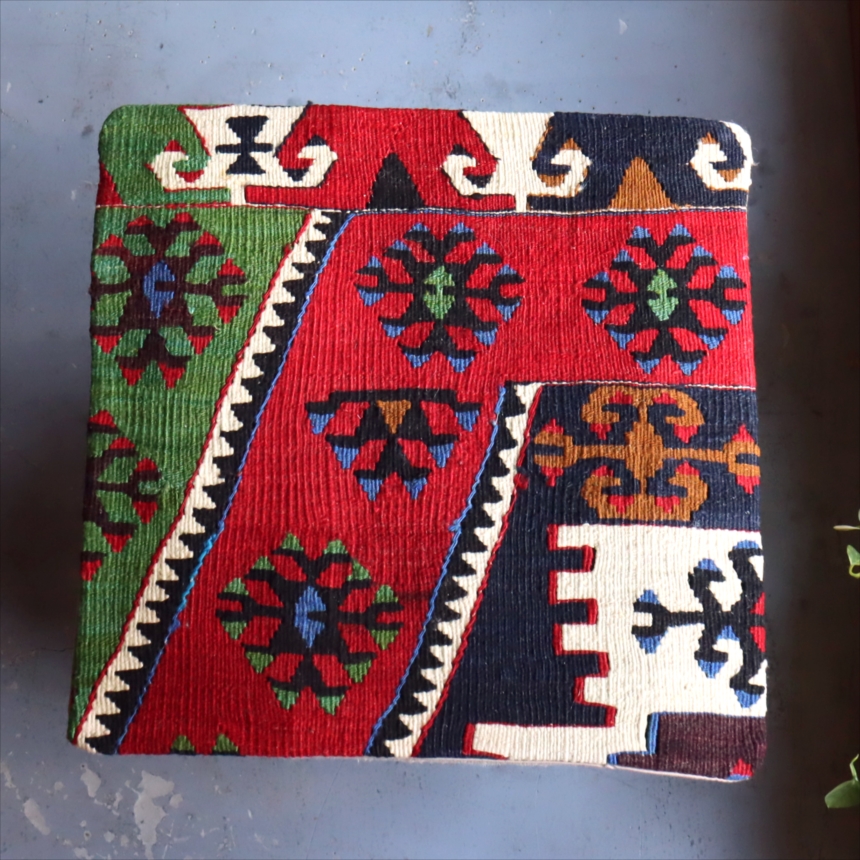 Key:Old Kilim, Kilim Cushion, Turkish Kilim, BOHO, Bohemian Decor, Vintage kilim, クッションカバー, オールドキリム, トルコ, ヴィンテージキリム, トライバルラグ, ピロー, ボヘミアンスタイル, BO-HO, ウール100%, 手織り, 一点もの, ガラタバザール