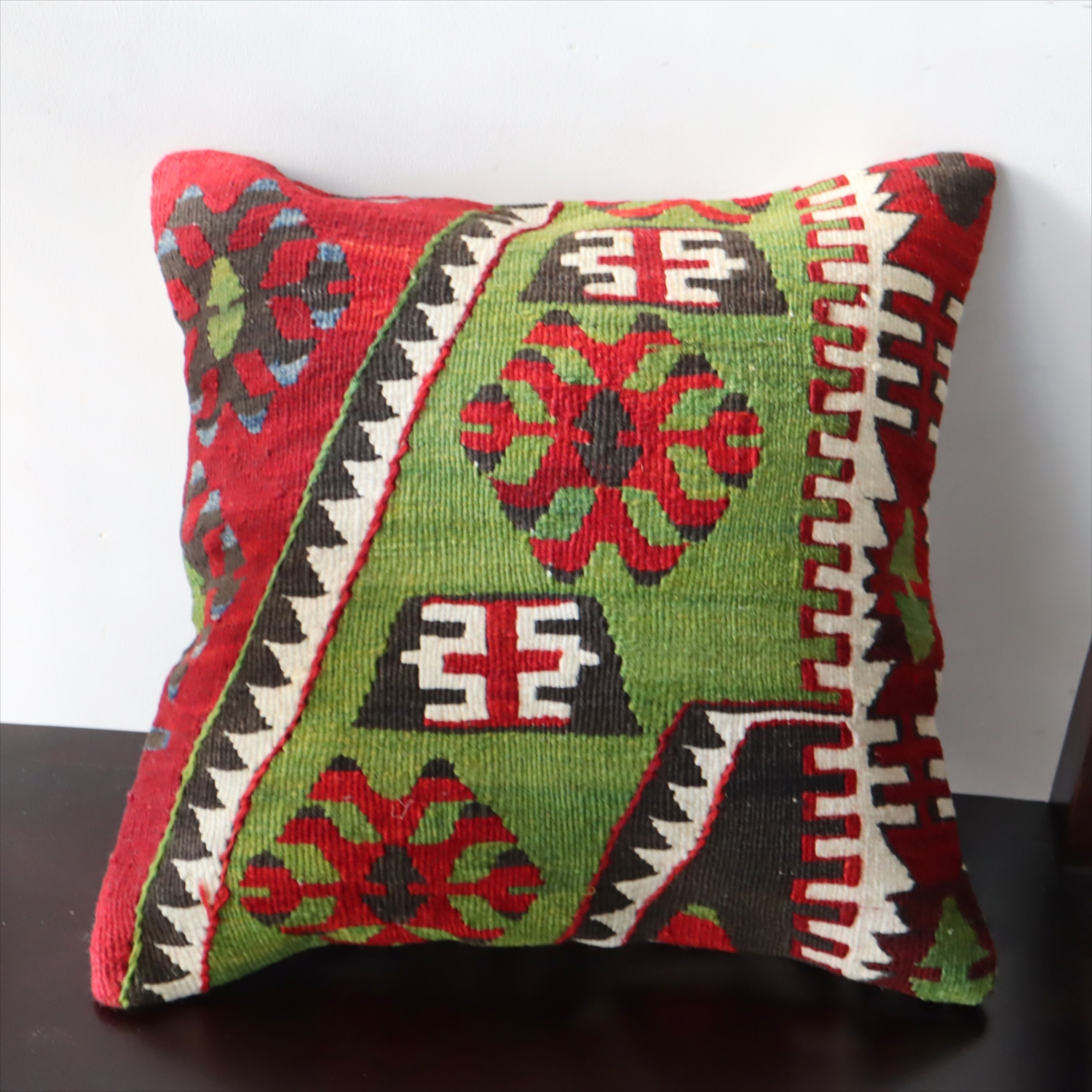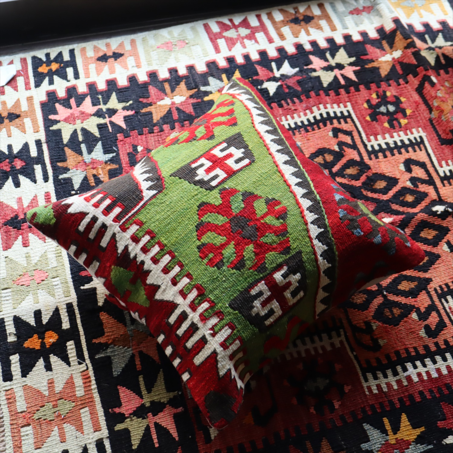 20世紀中頃に、アナトリア(トルコ)東部、マラテヤ地方またはシワス地方で織られたもので、年代は古いものの、大切に保管されており、織られた当時のままの鮮やかな色が残っています。グリーンの色はお部屋でクッションとしてお使いいただく間に、少しずつ褪色してやわらかな色に変化すると想像できます。