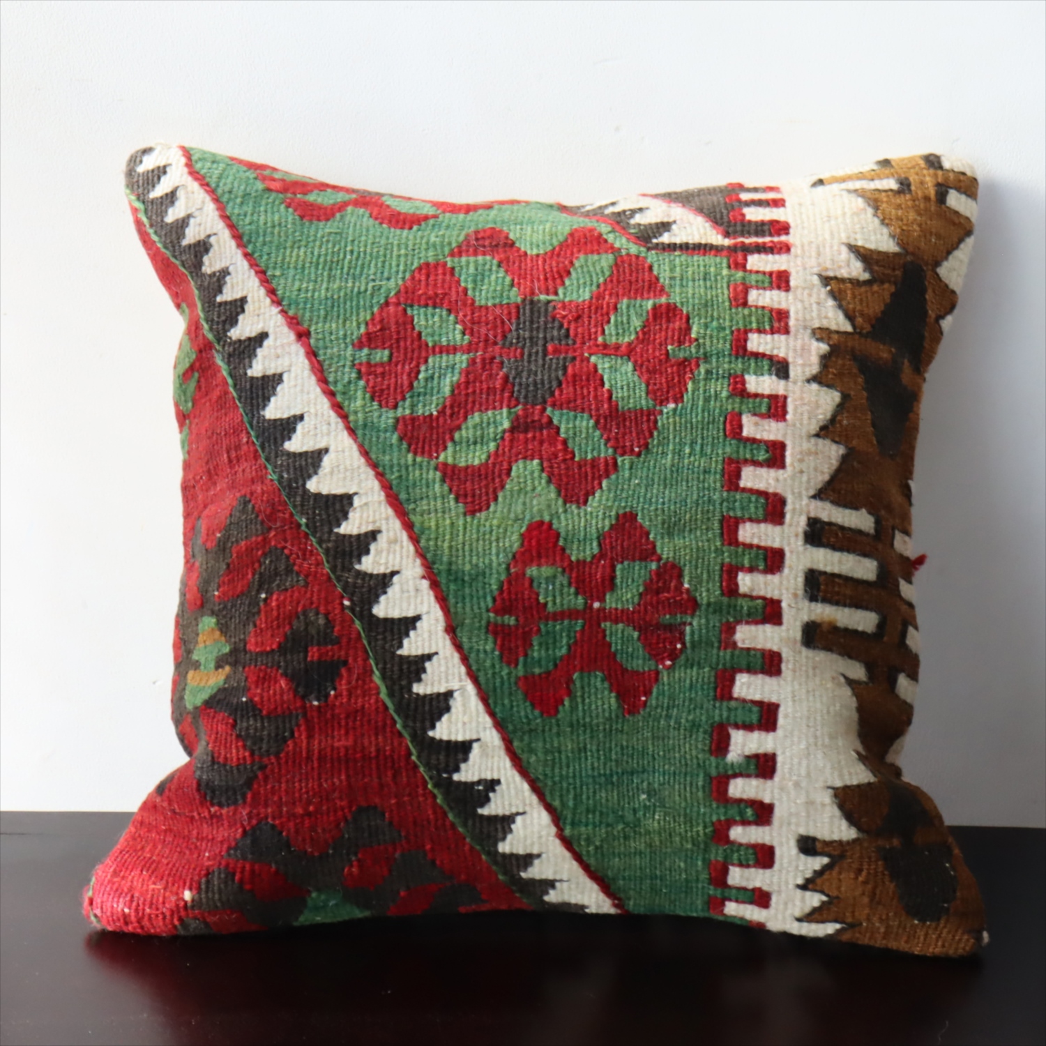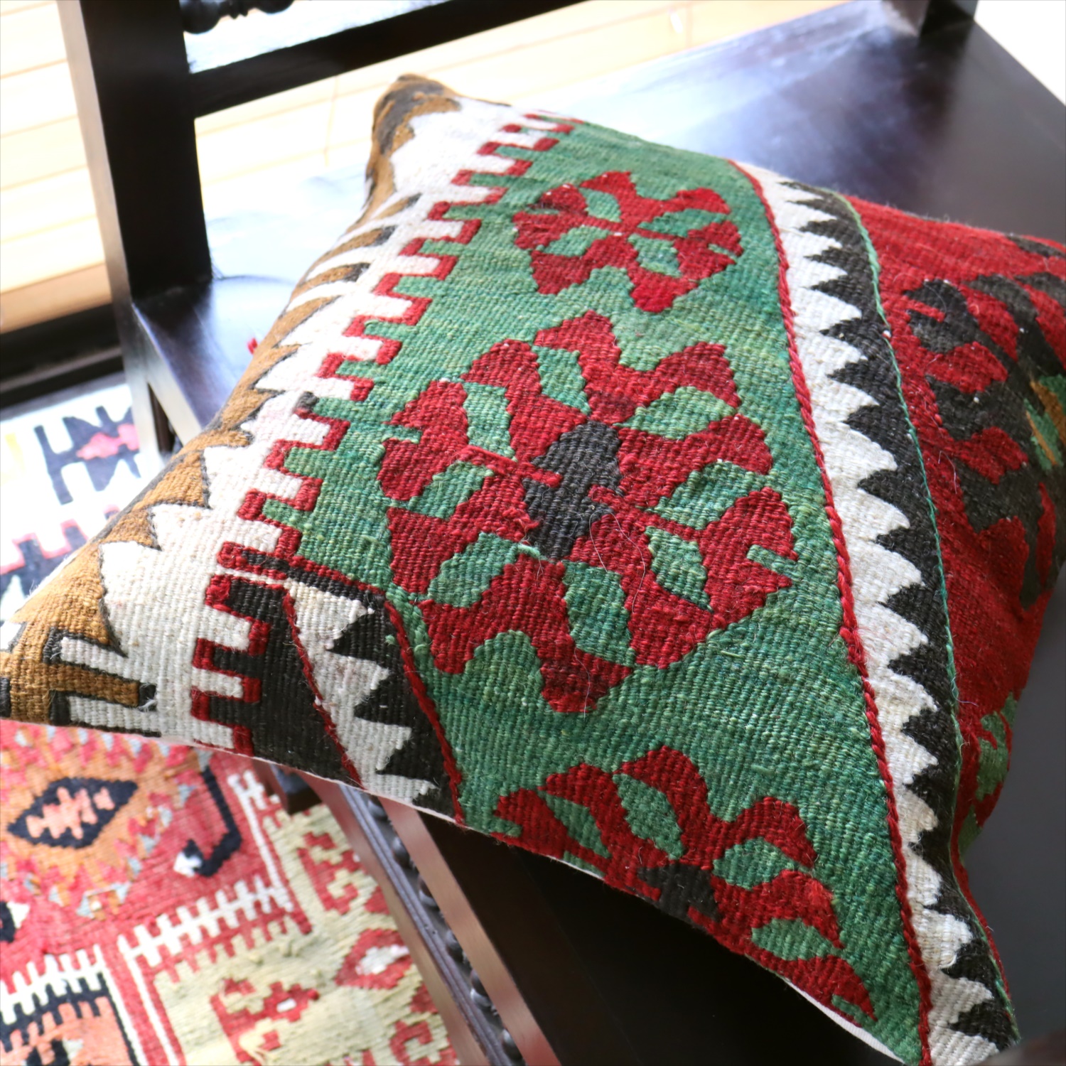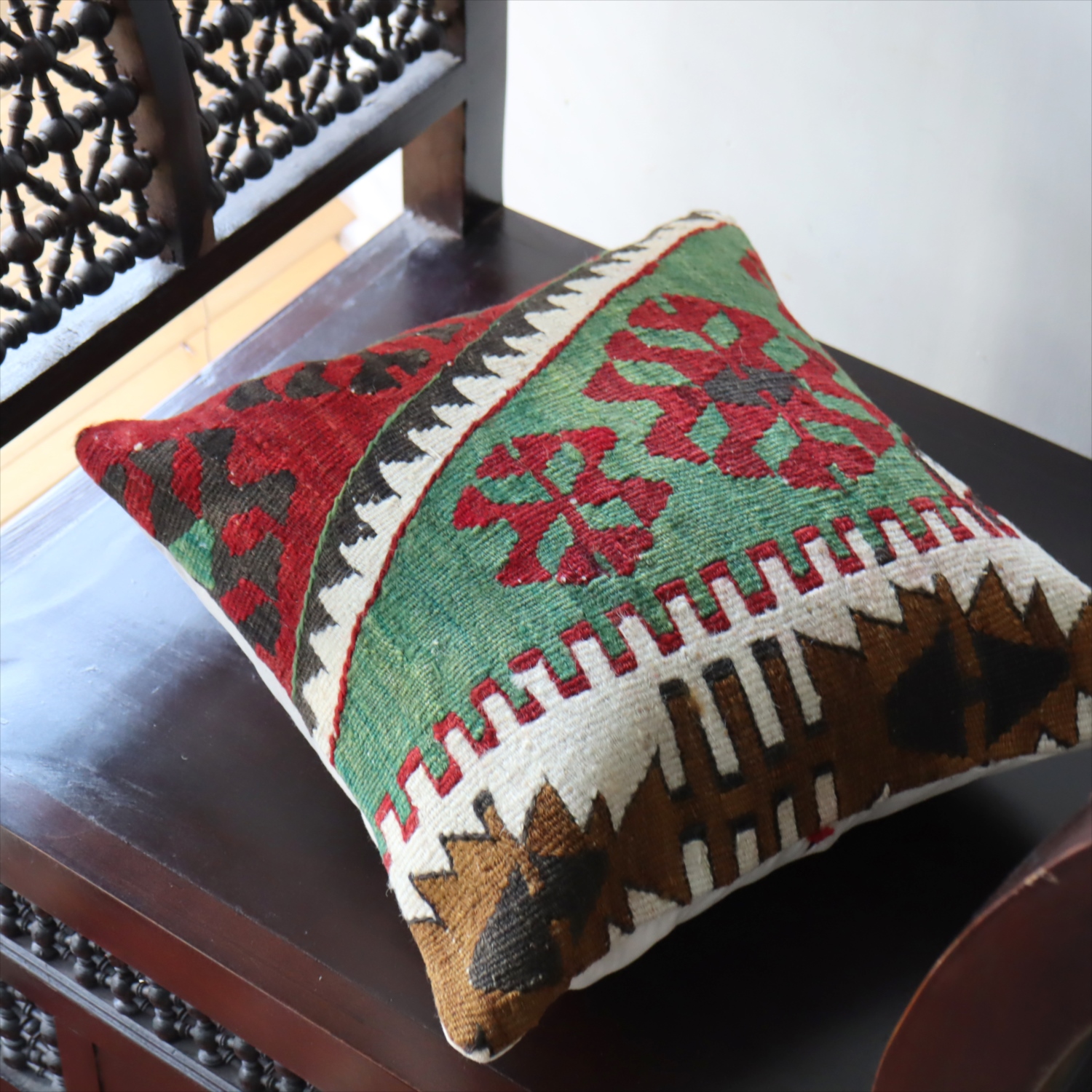 20世紀中頃に、アナトリア(トルコ)東部、マラテヤ地方またはシワス地方で織られたもので、年代は古いものの、大切に保管されており、織られた当時のままの鮮やかな色が残っています。グリーンの色はお部屋でクッションとしてお使いいただく間に、少しずつ褪色してやわらかな色に変化すると想像できます。