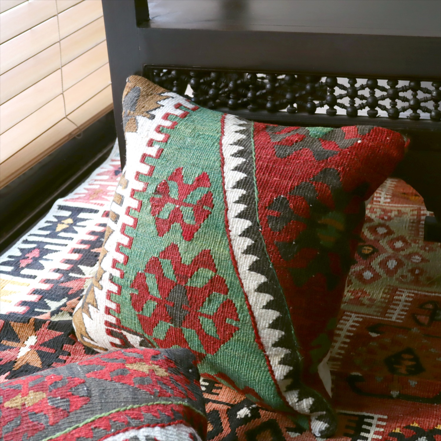 クッションカバーにすると、一枚のキリムから50枚以上に切り分けられるものもあり、配色が似ていてモチーフのバランスが違うクッションができあがります。