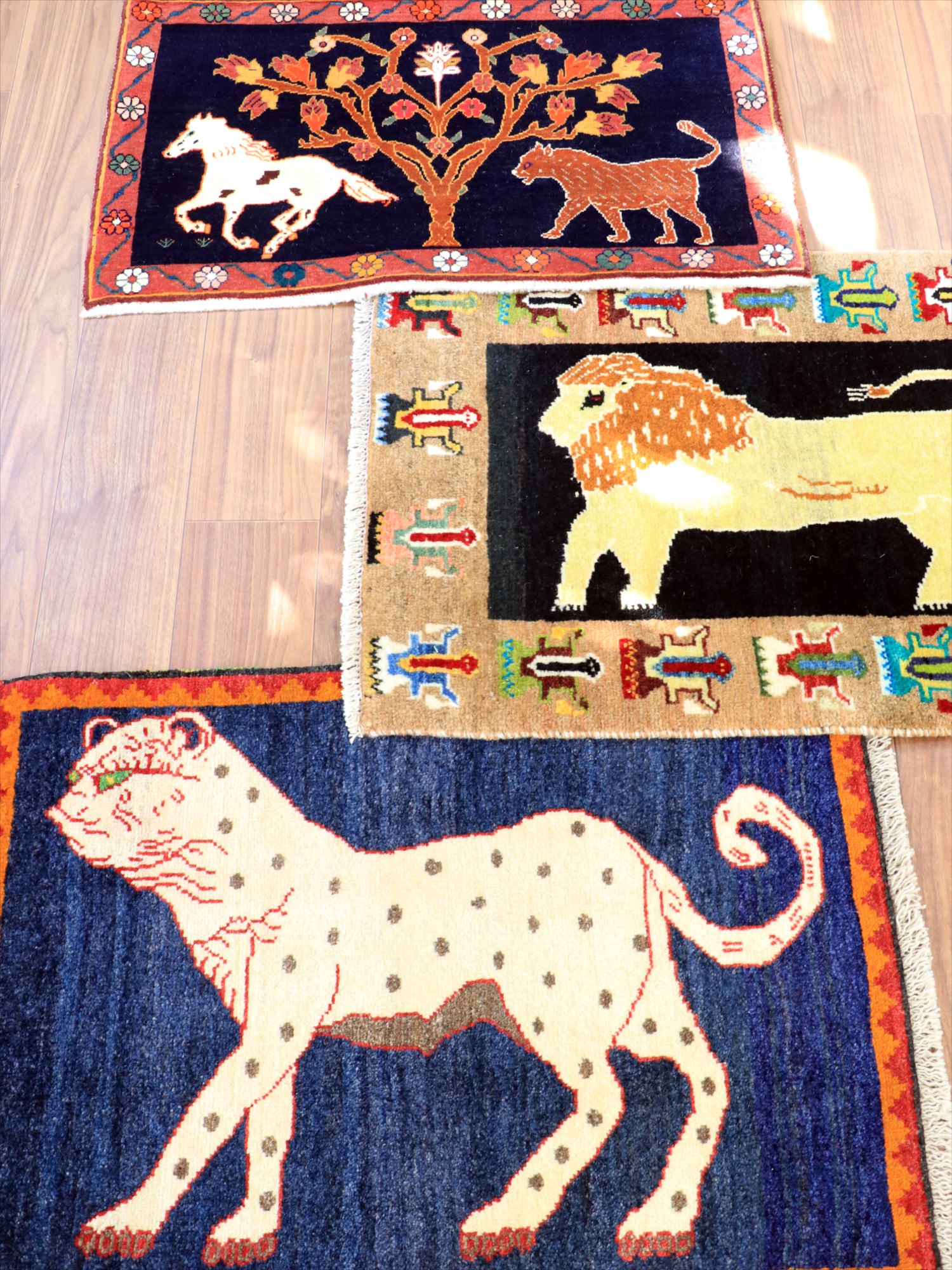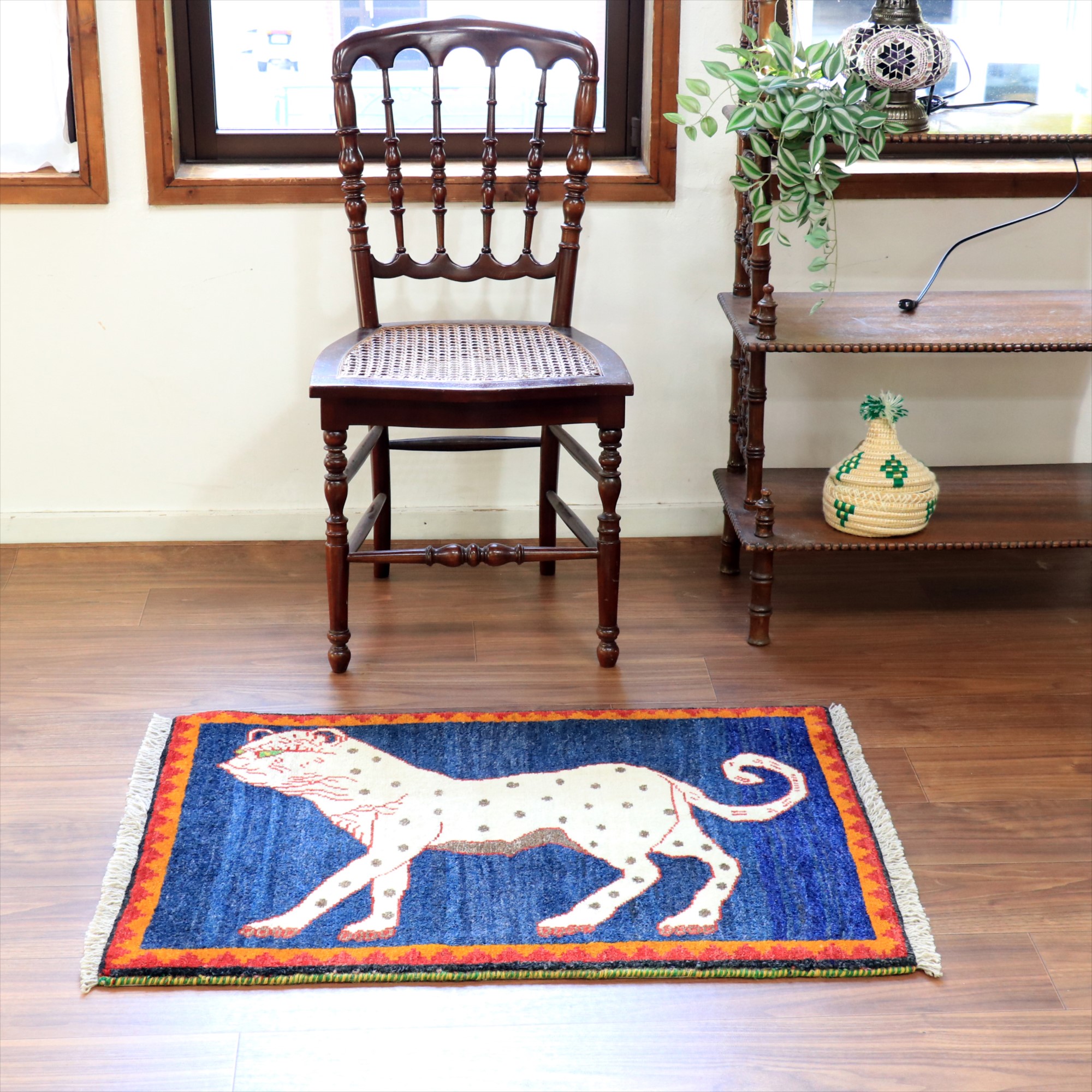カシュカイ族の象徴でもあるライオンとともに、よく登場するヒョウのデザイン(メスのライオンとも言われています)。発色のよいレッドのフィールドに、ユニークな色使いではありますが、ブルーで織られたヒョウがよく映えます。いろいろなパターンのあるライオンラグの中でも、1頭がシンプルに織り込まれた人気のデザインです。