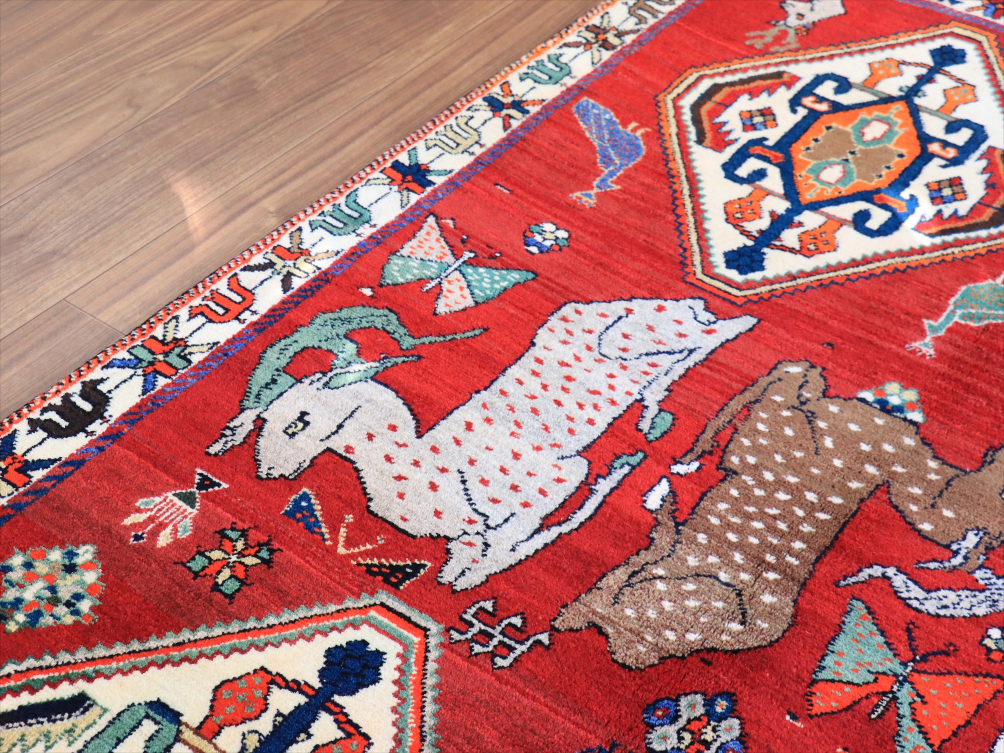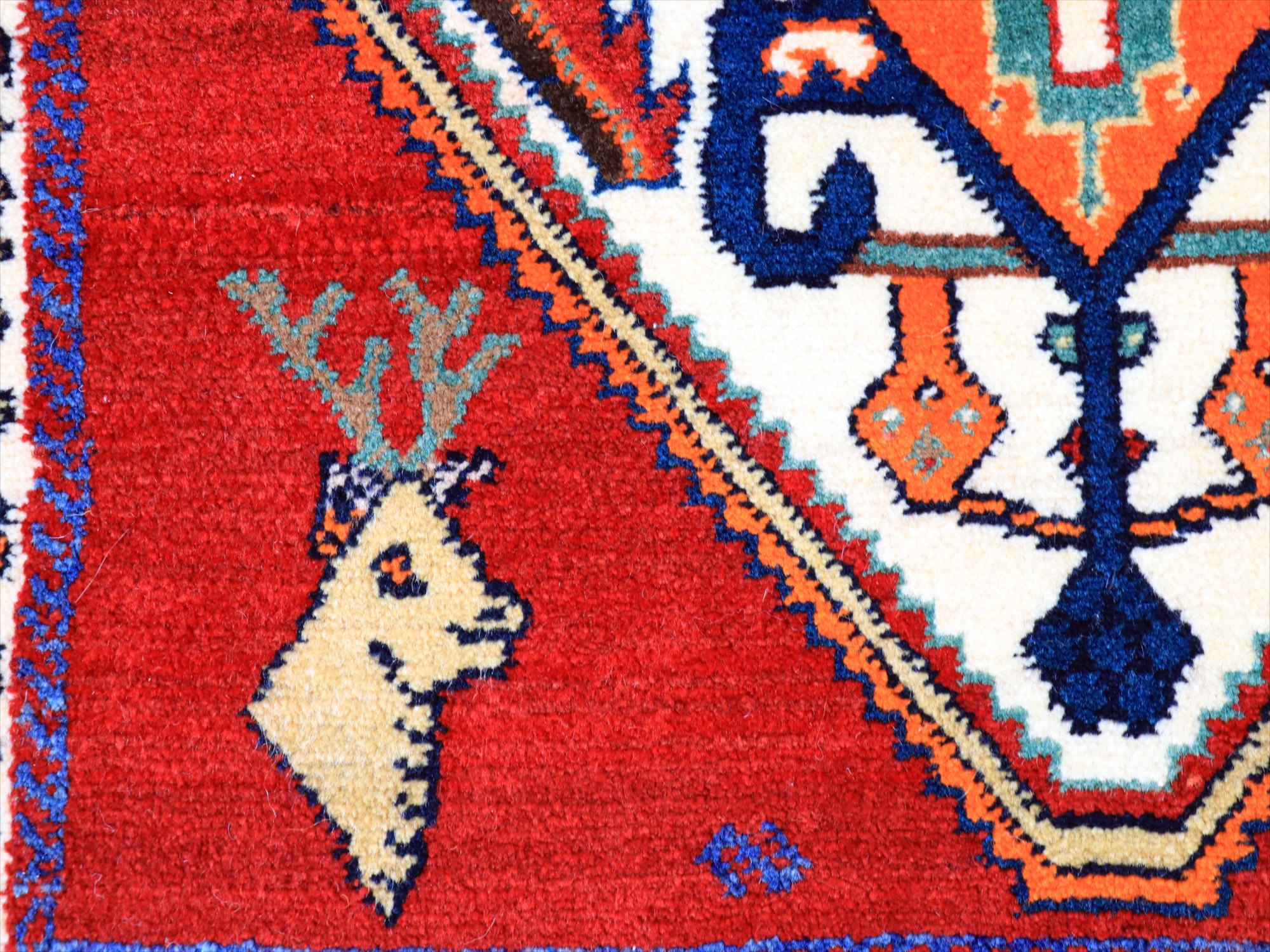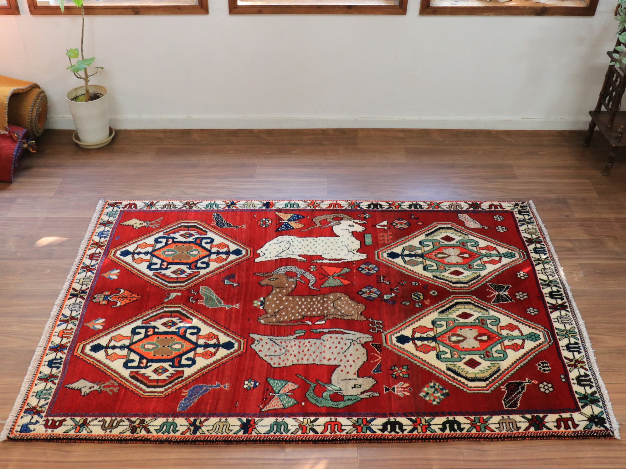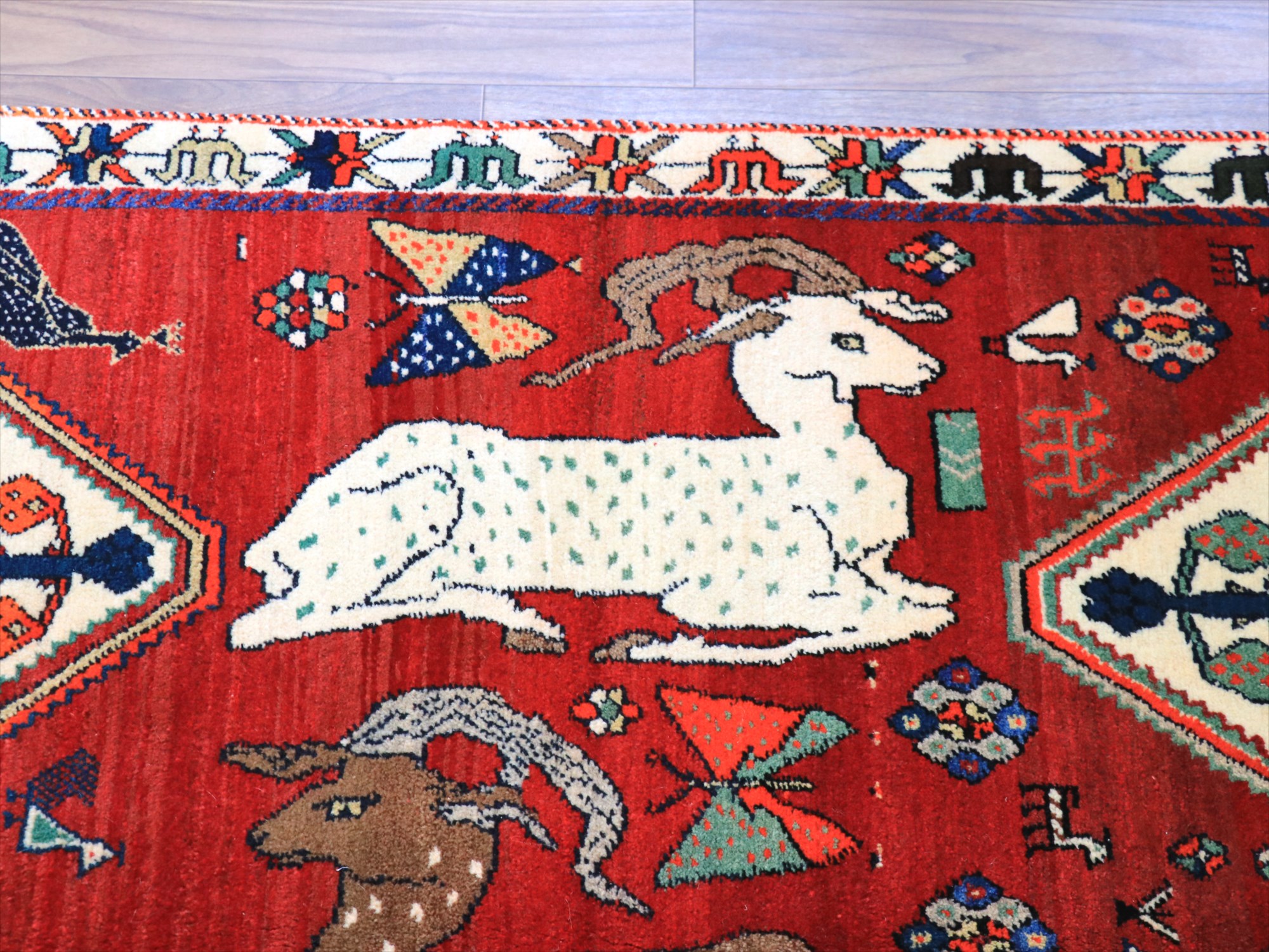 立派な角を持つ牡鹿が優雅に座ってくつろいでいる様子が織り込まれています。鹿は家畜ではありませんが、森の中から親子仲良く現れる鹿は、家庭円満の象徴とも言われ、カシュカイ族のラグにはたびたび登場するモチーフです。上下には、スカラベのようなモチーフのひし形のメダリオンが4つ並んでいて、ラグとしてはとてもユニークな配置の一枚。
